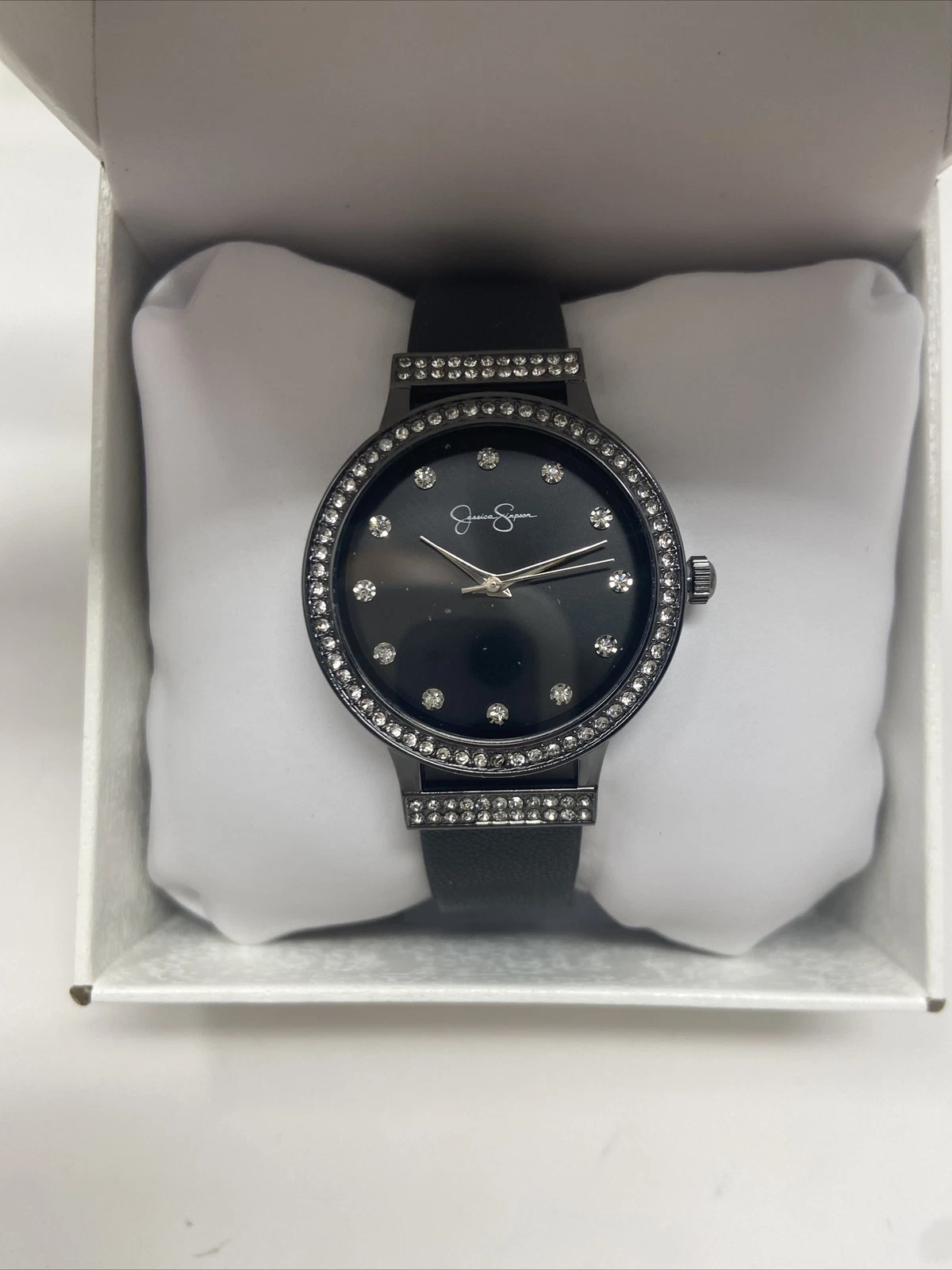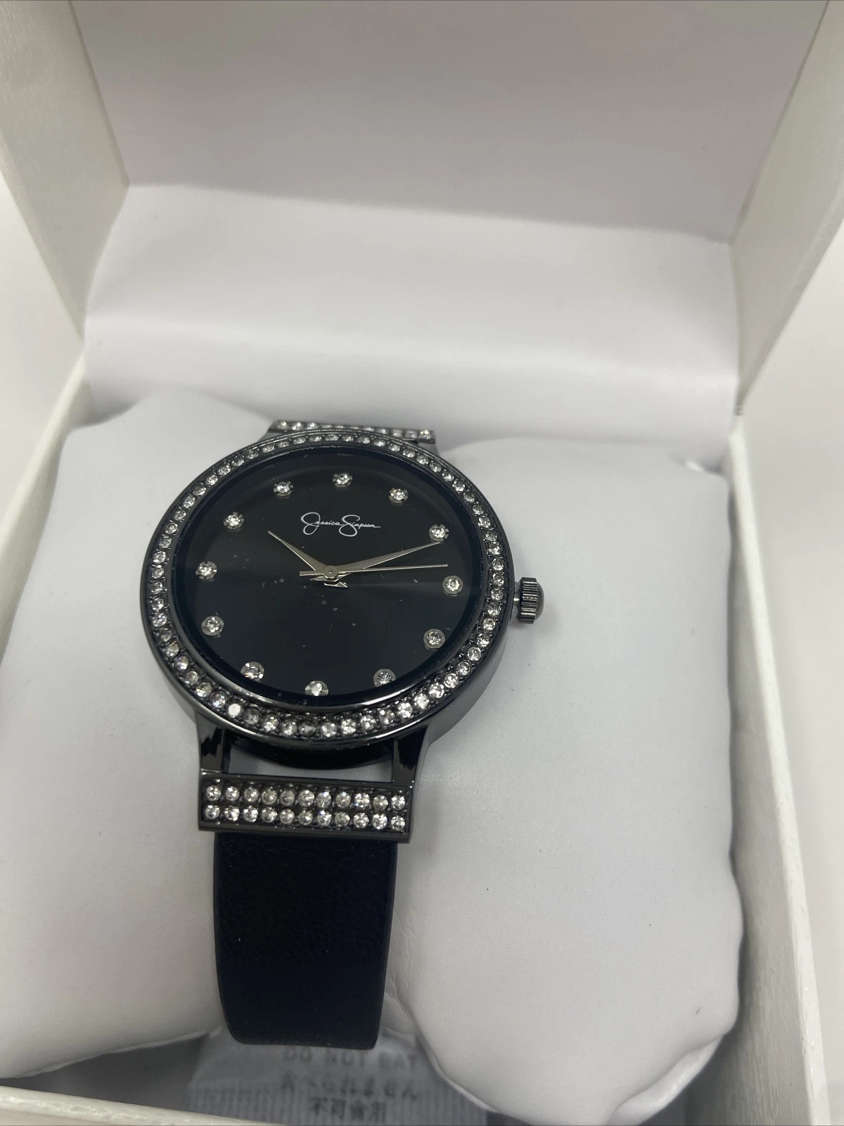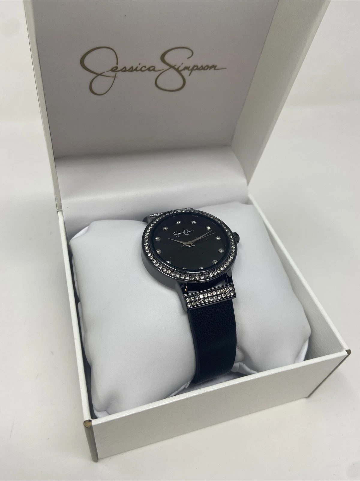 Jessica Simpson Ladies Rhinestone Watch Black Dial Black Band No Battery