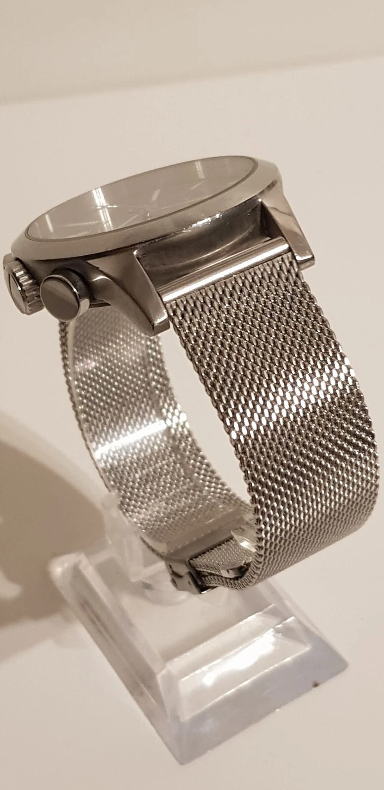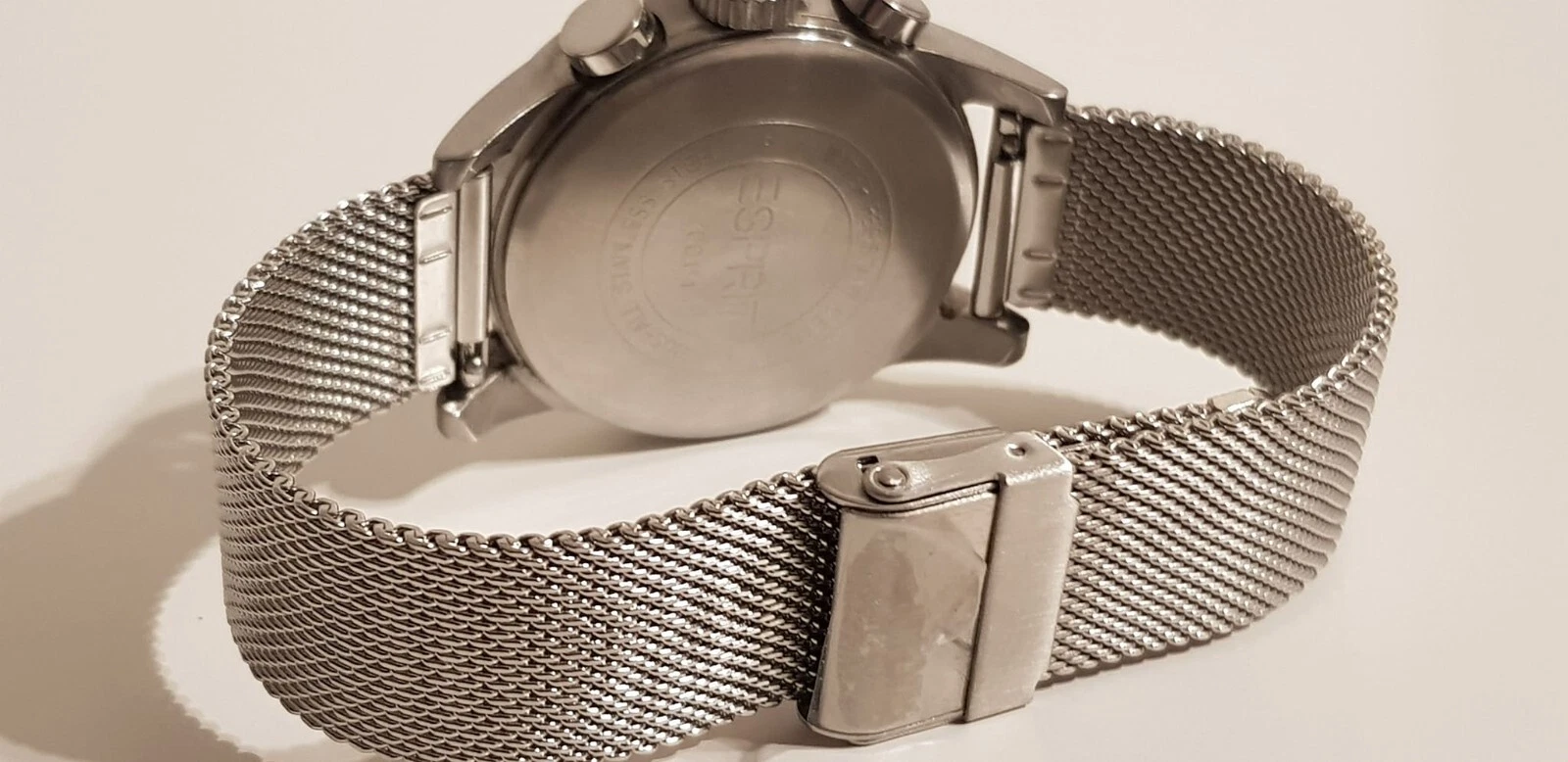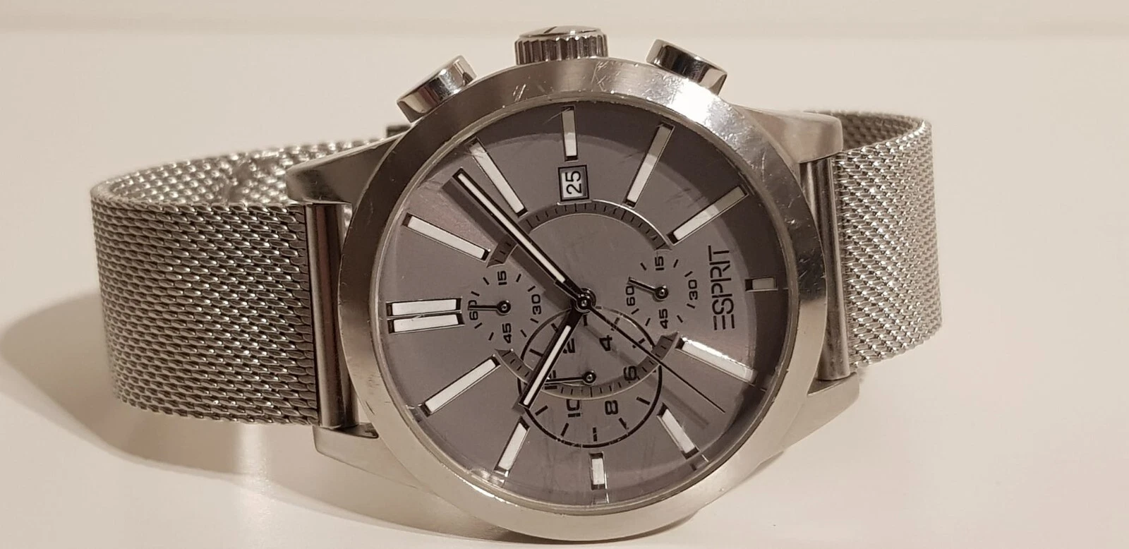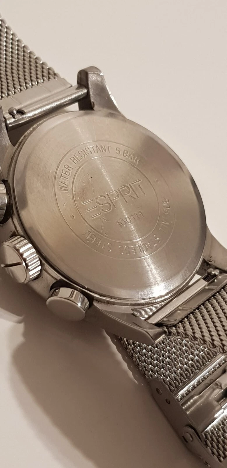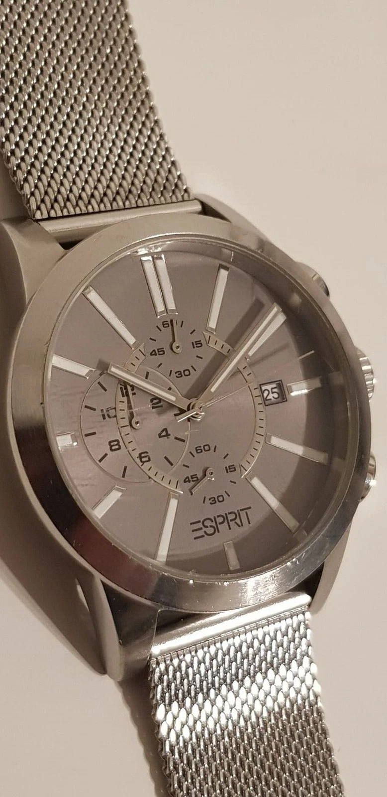 ESPRIT MENS ALL STAINLESS 42MM CASED CHRONO DATE WATCH, 20MM SHARK MESH STRAP