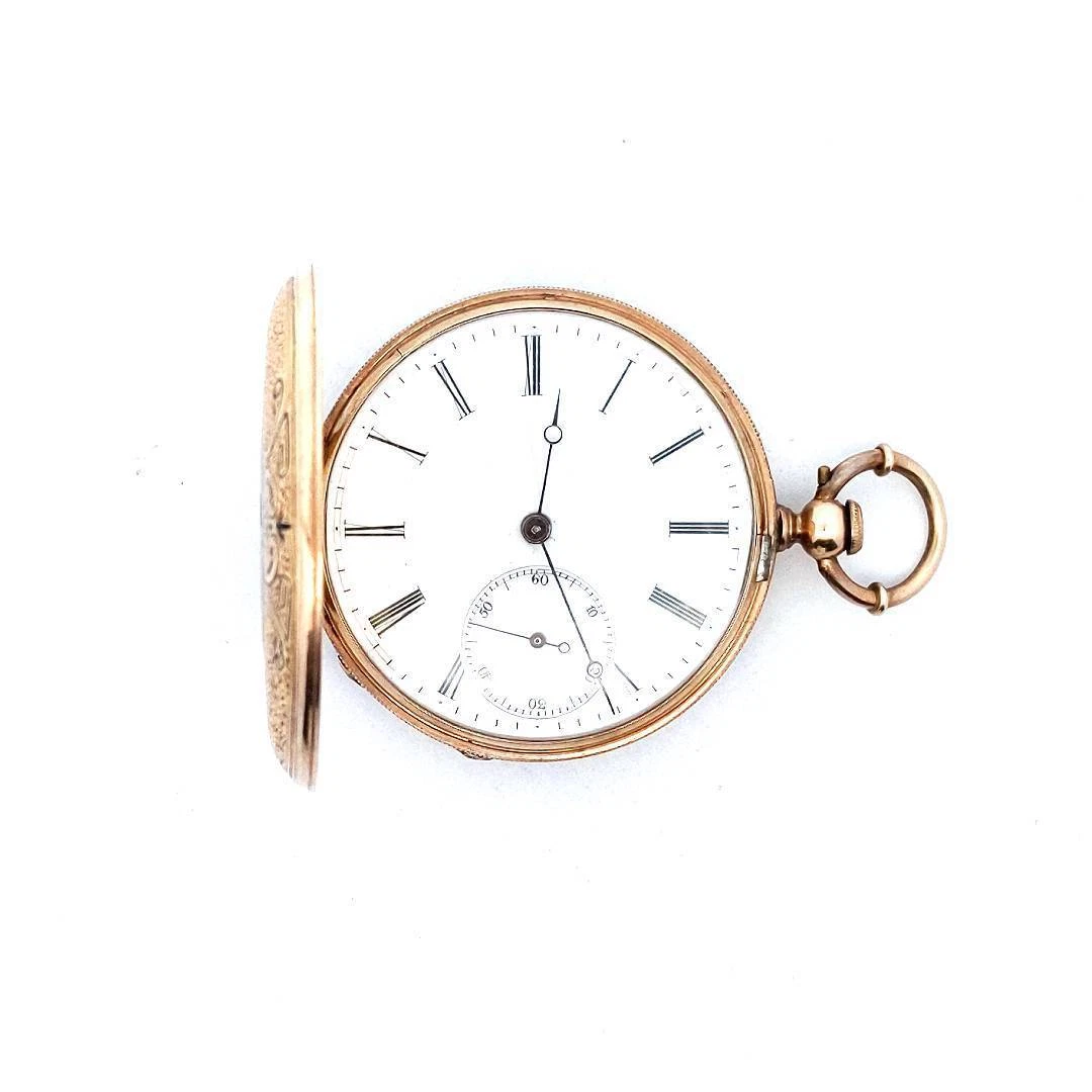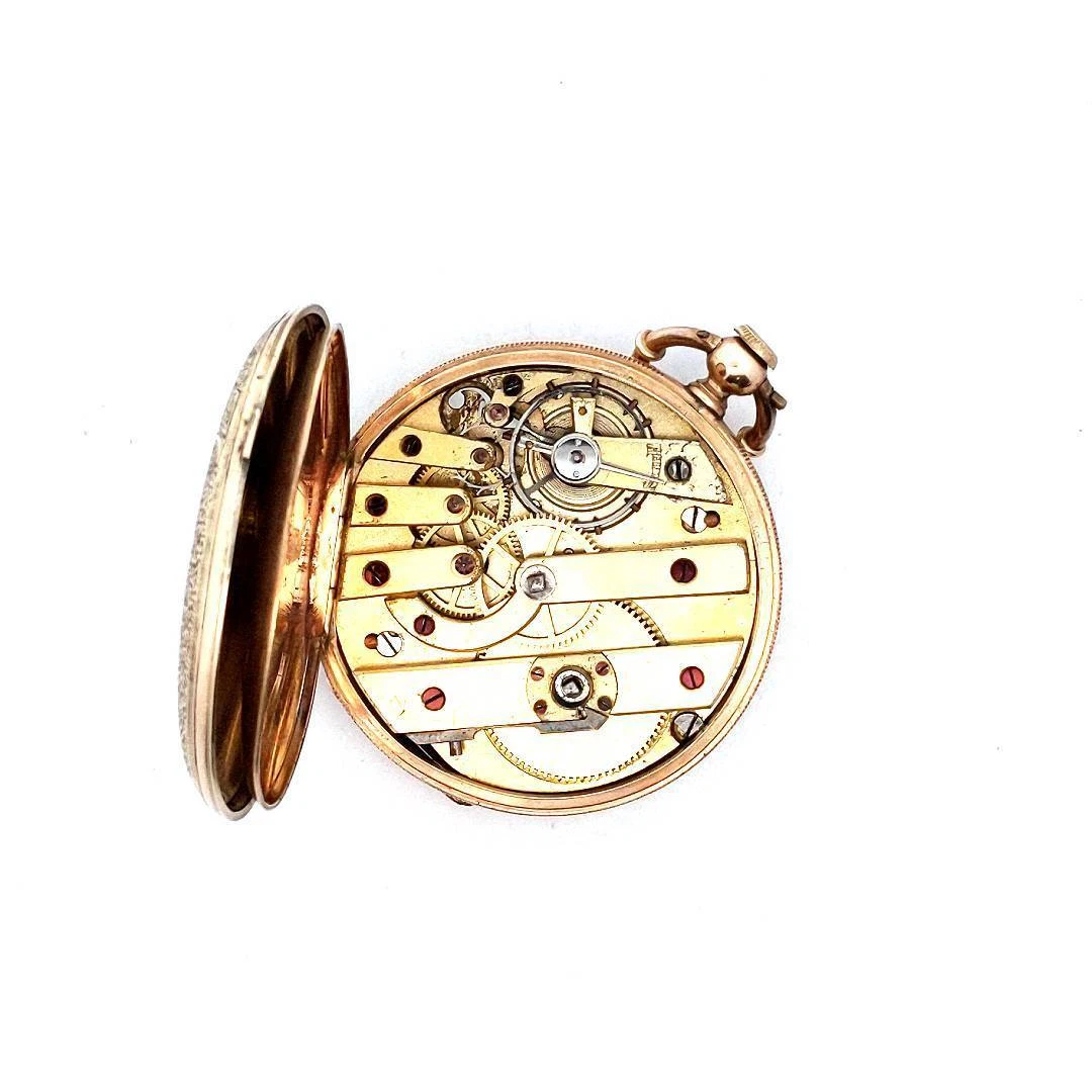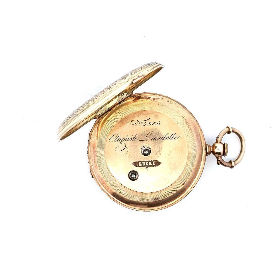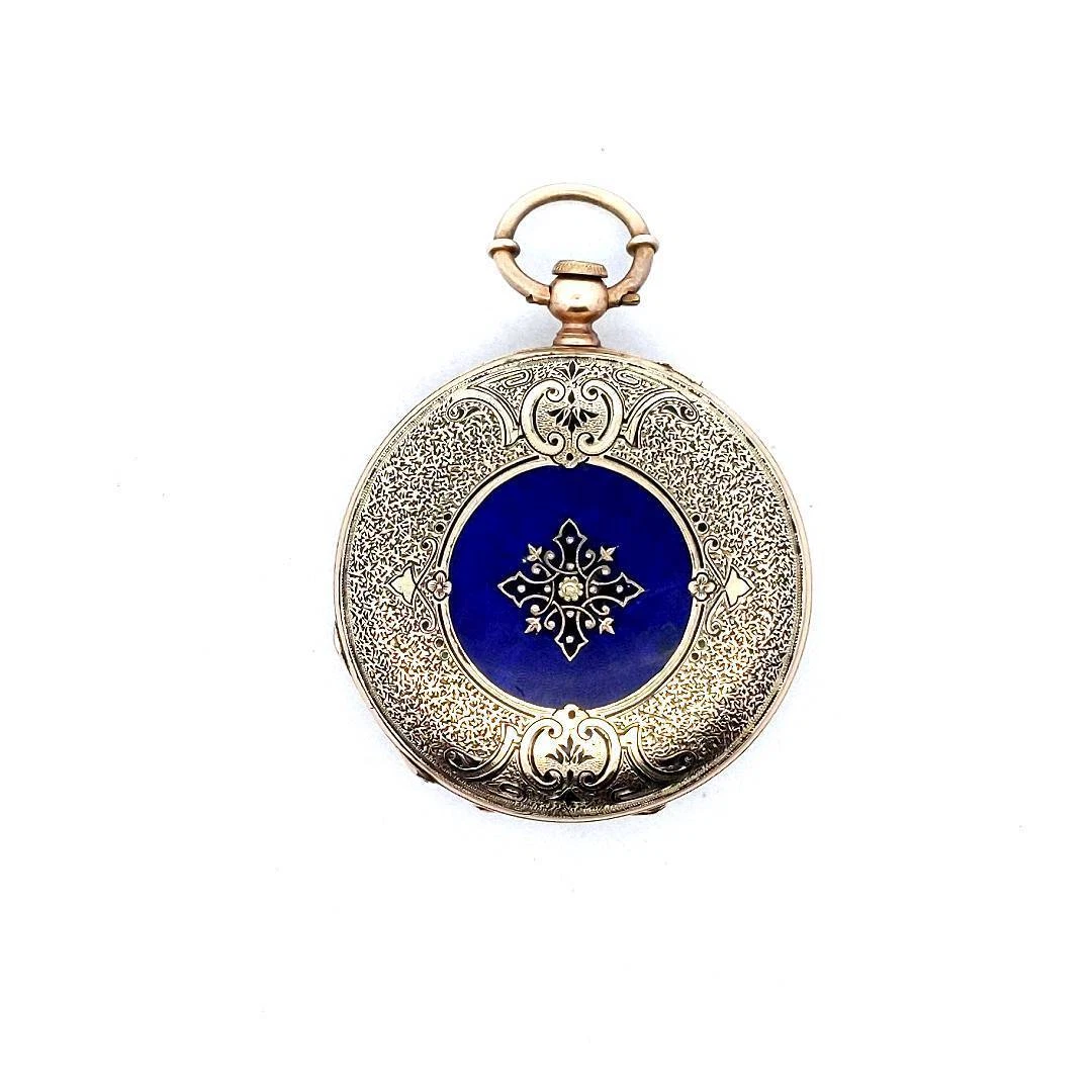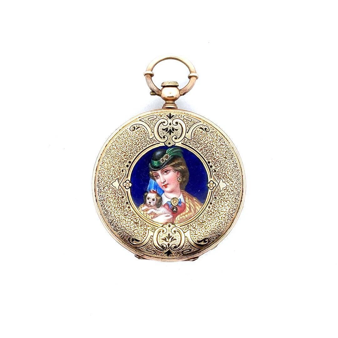 Antique 14K Yellow Gold Enamel Lady & Puppy Dog Pocket Watch