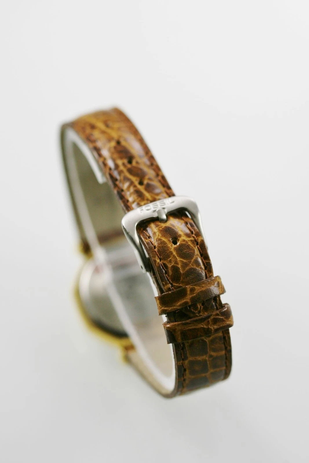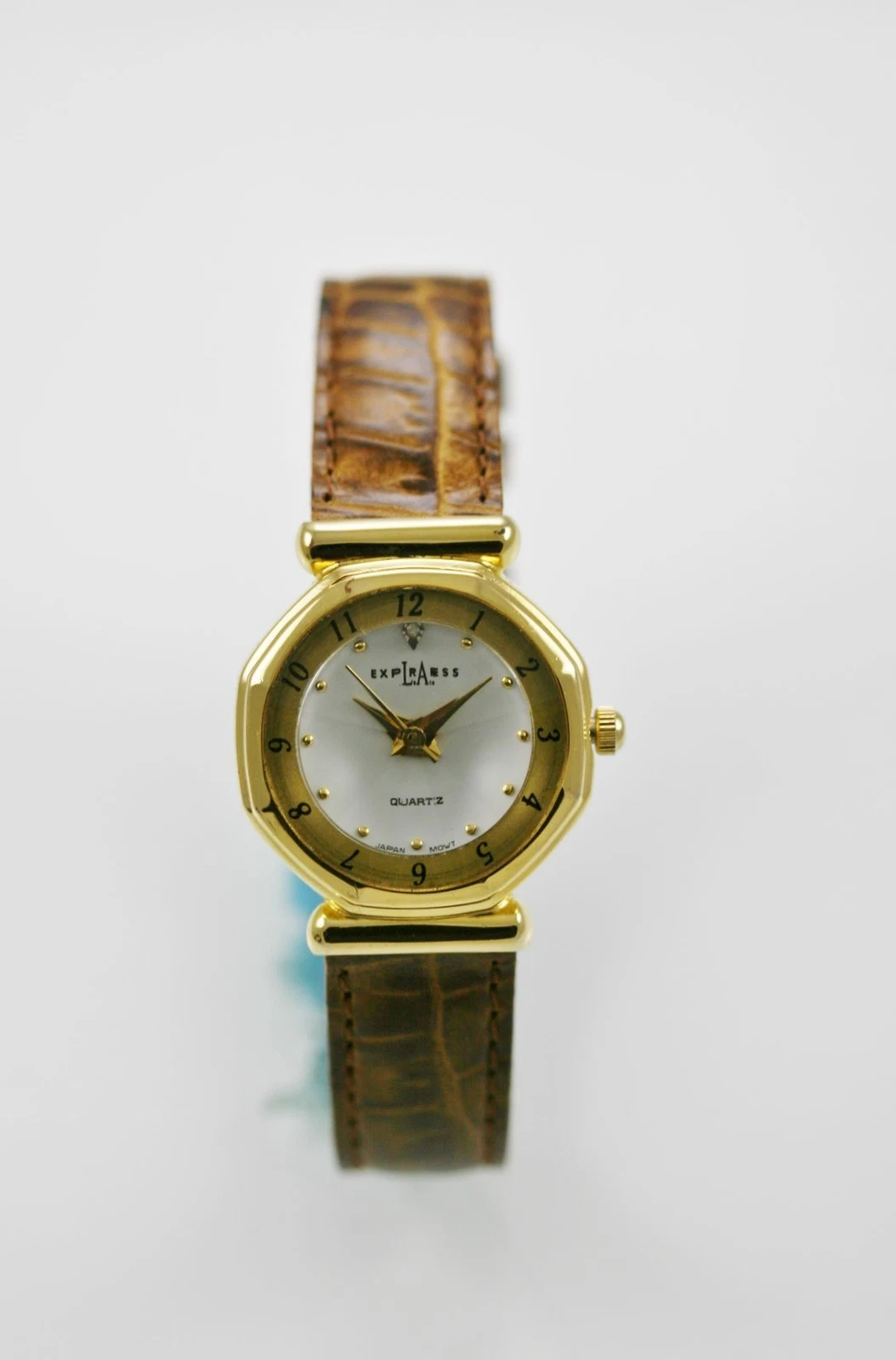 L A Express Watch Womens Stainless Gold Leather Brown Water Res White Quartz