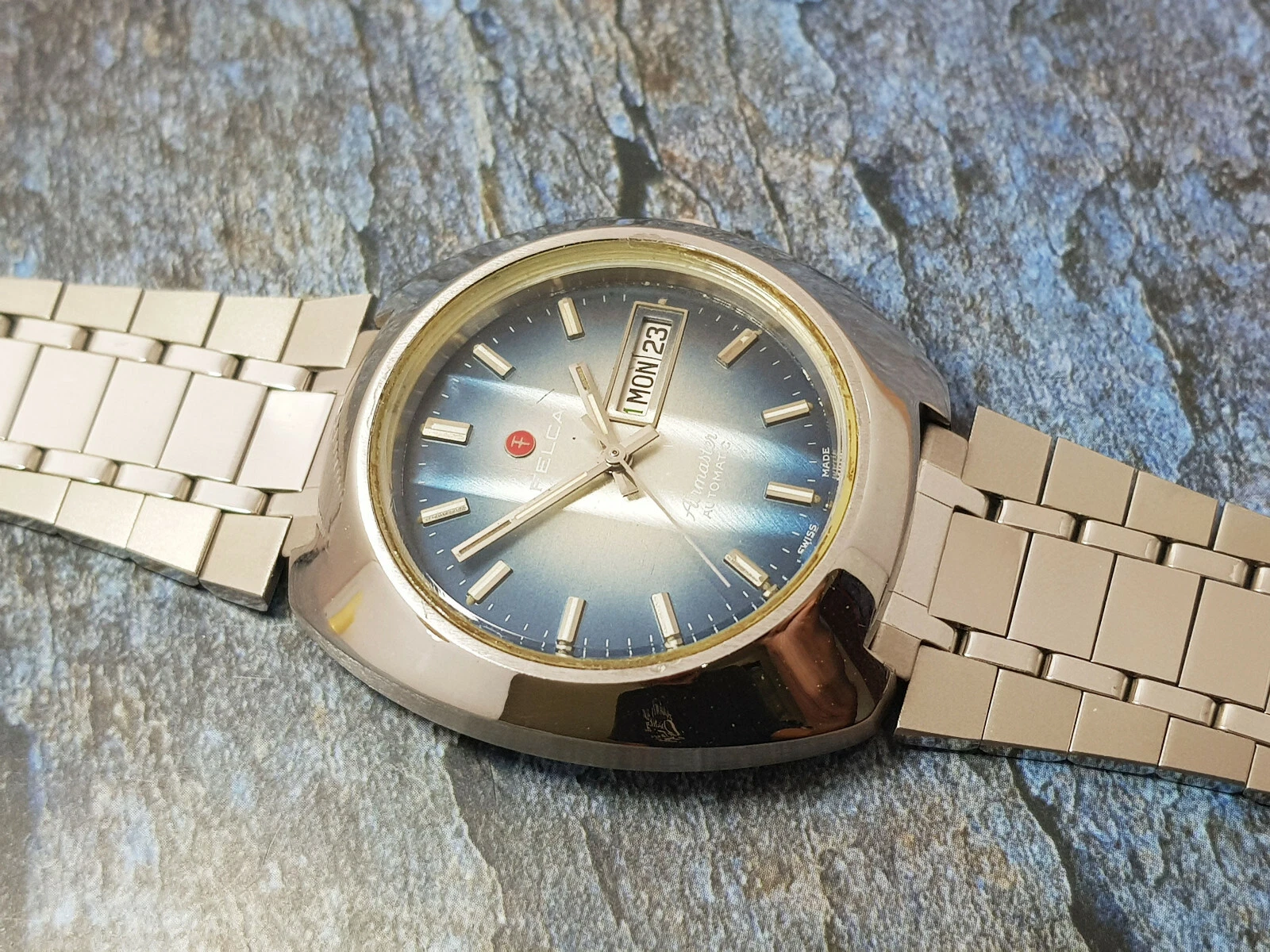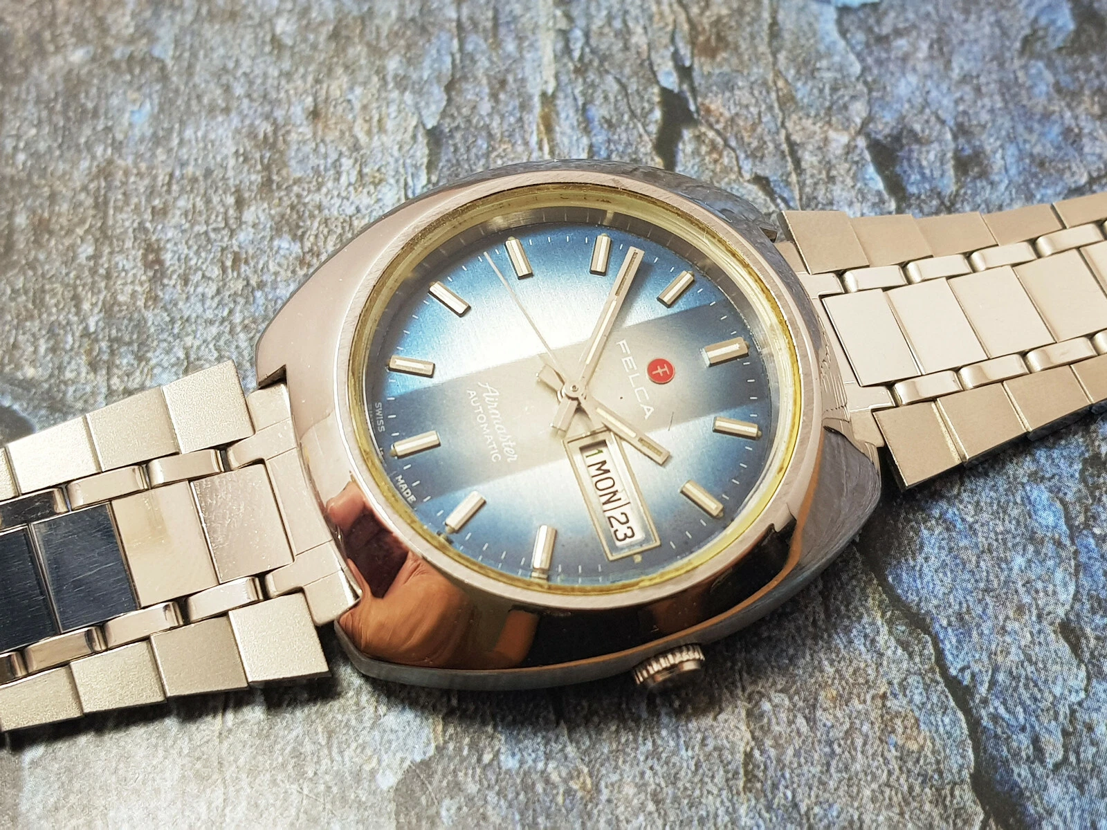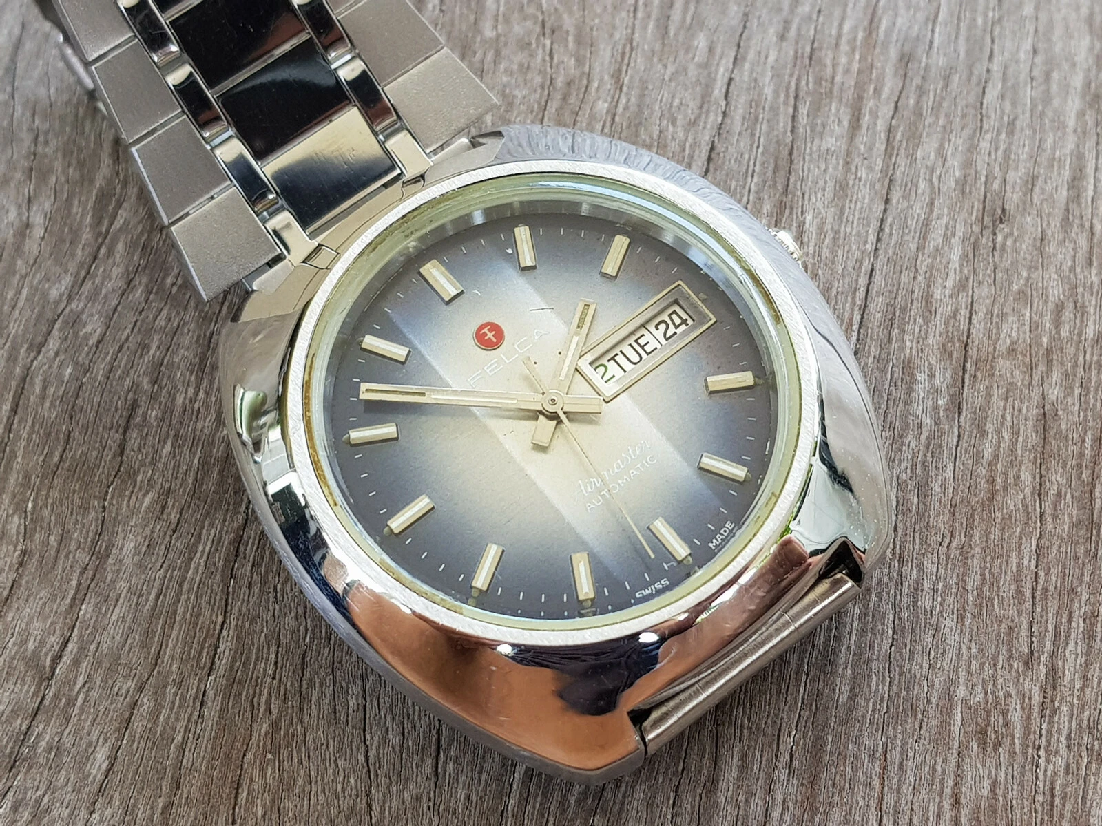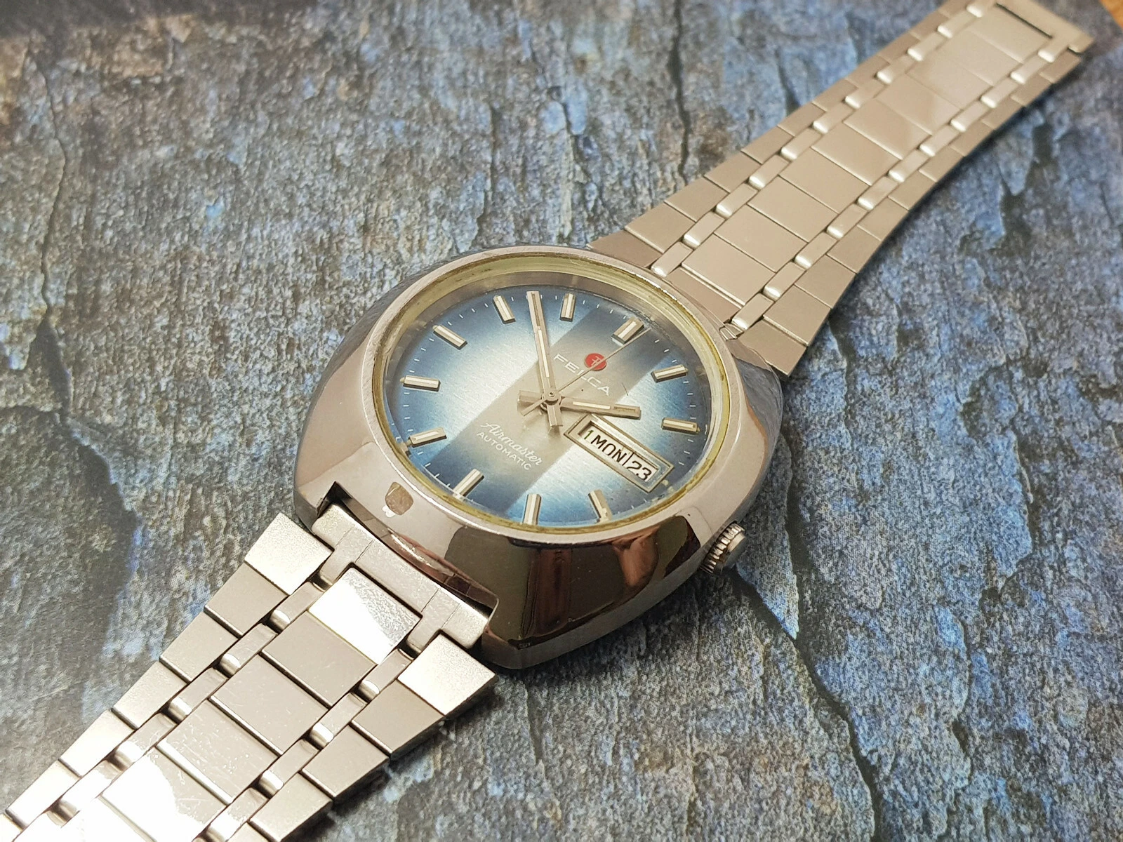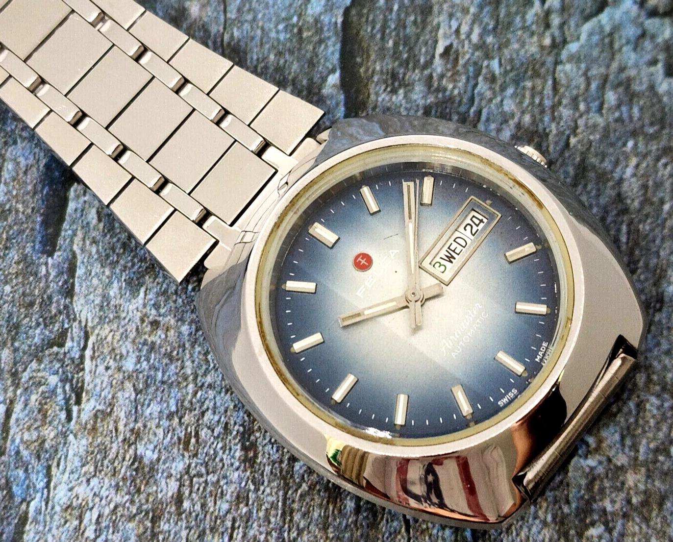 Rare Vintage Felca Airmaster Automatic Gents on railroad bracelet.
