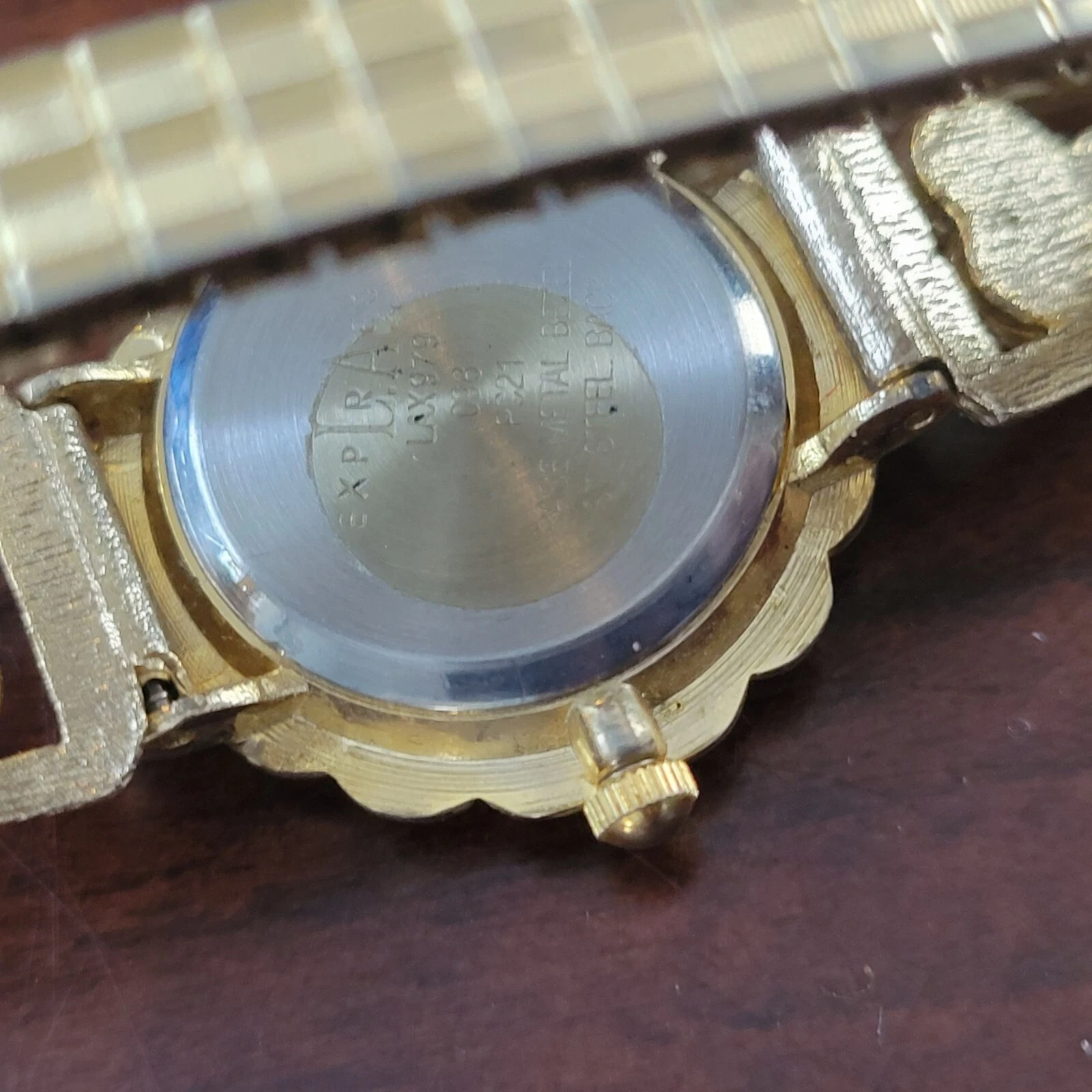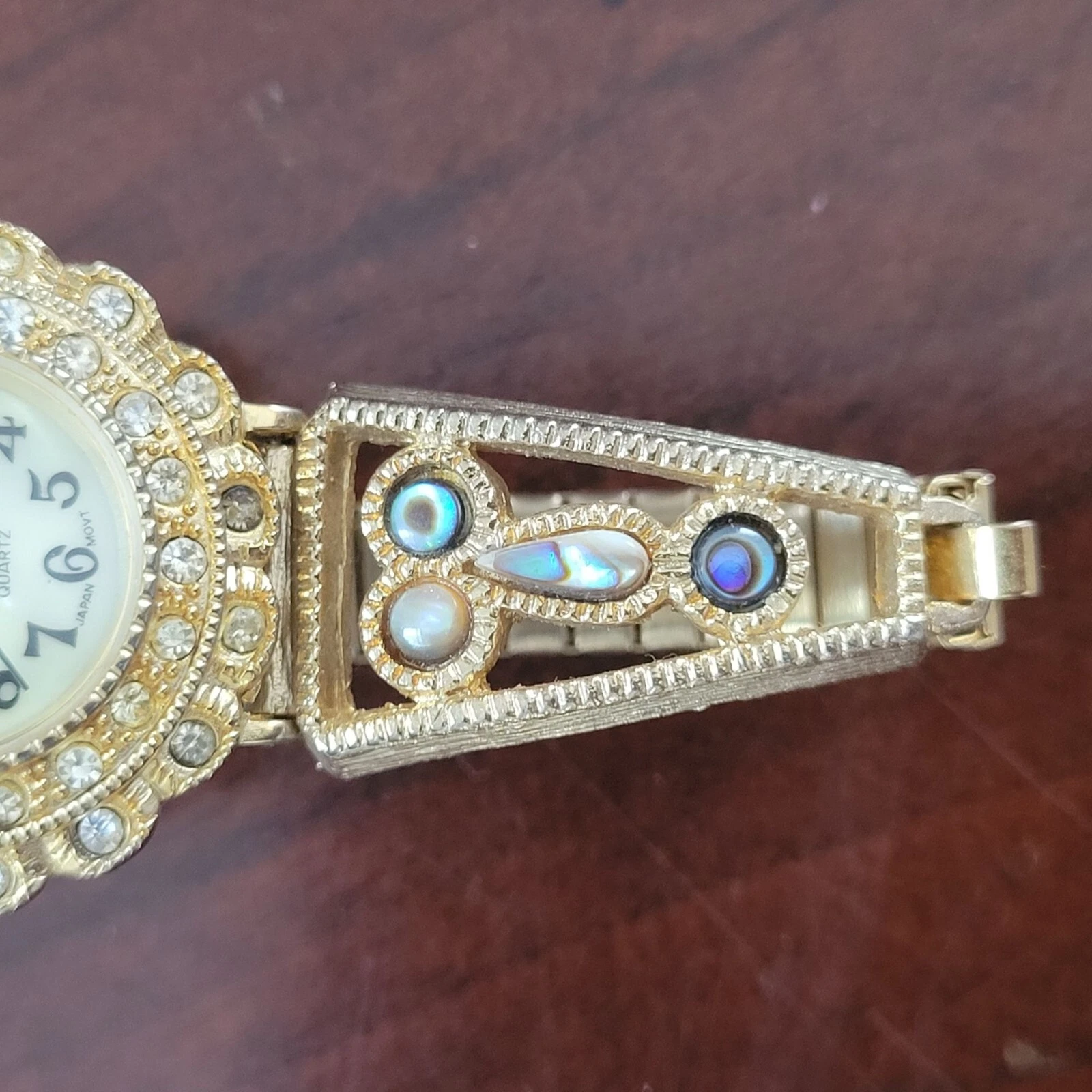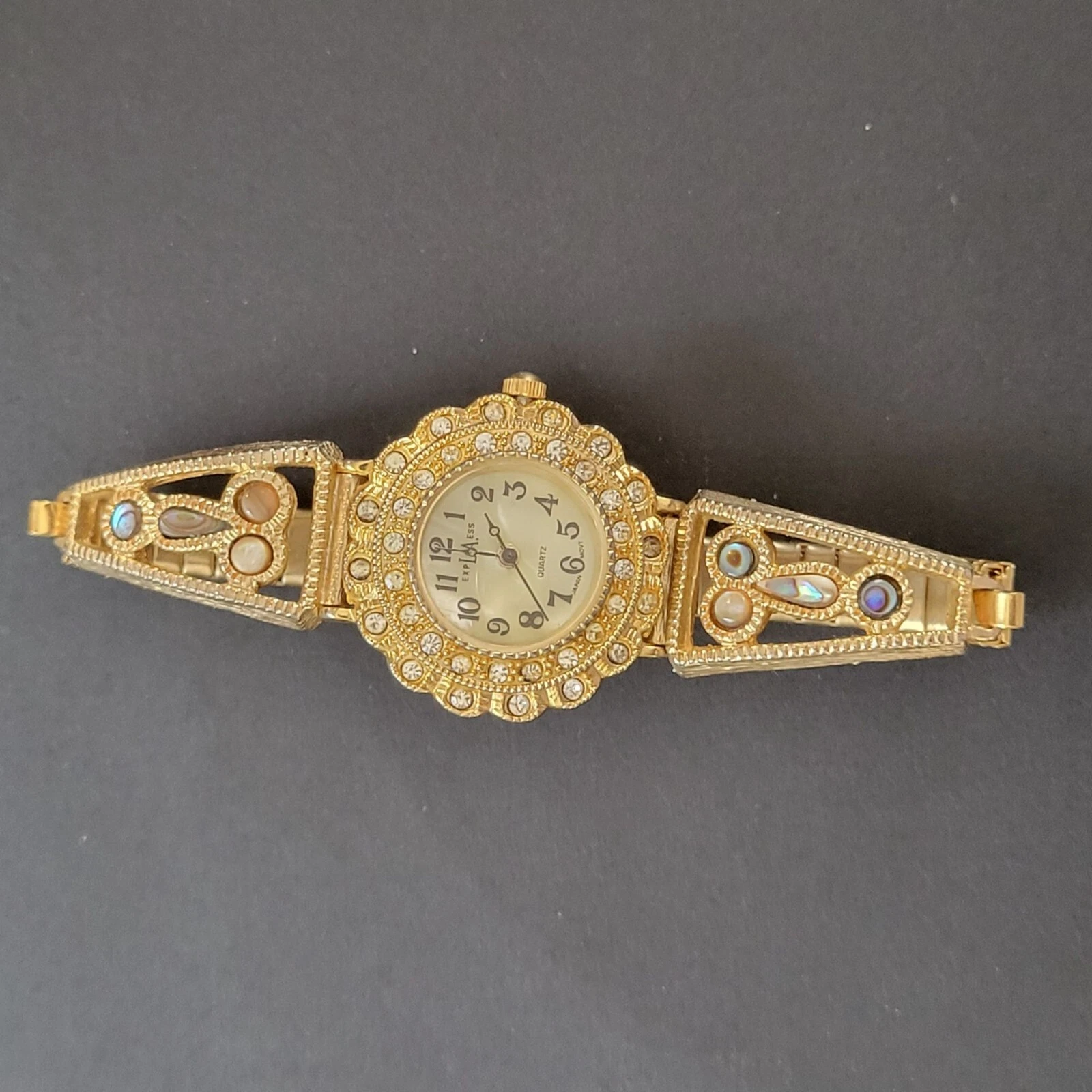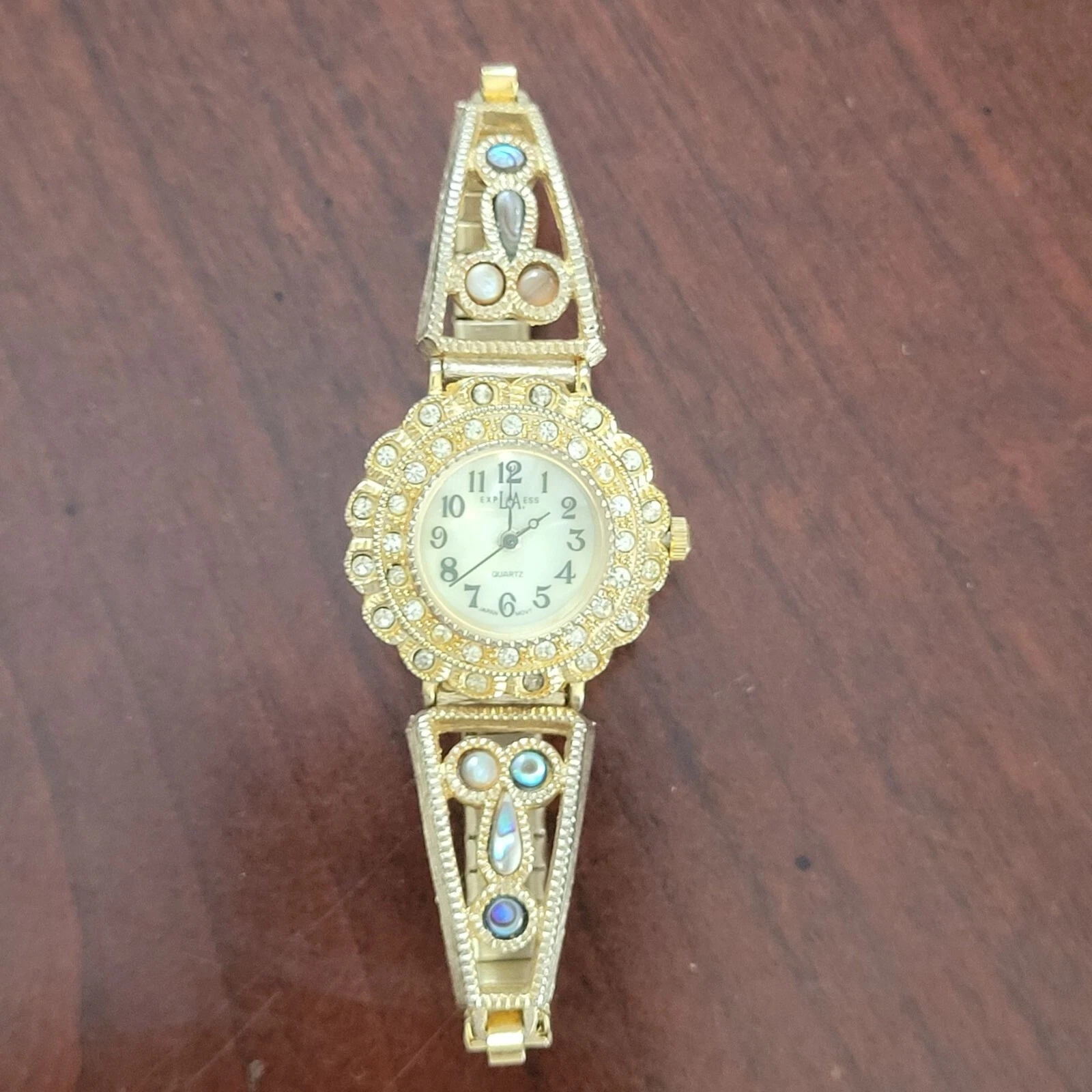 Exquisite Express LA Quartz Womens Watch With Rhinestone Pearl Accents Gold Tone