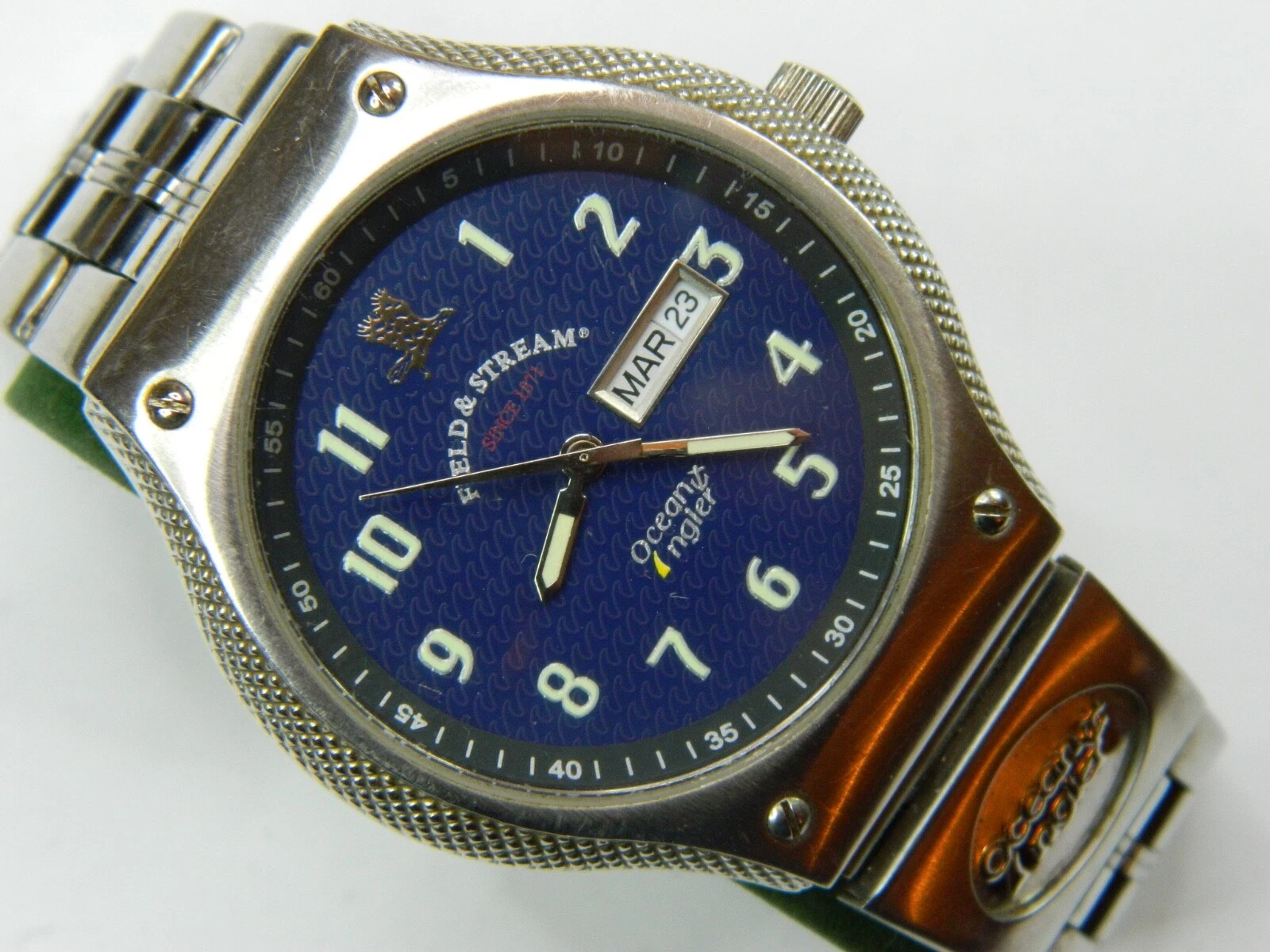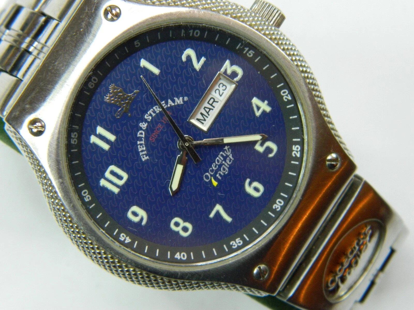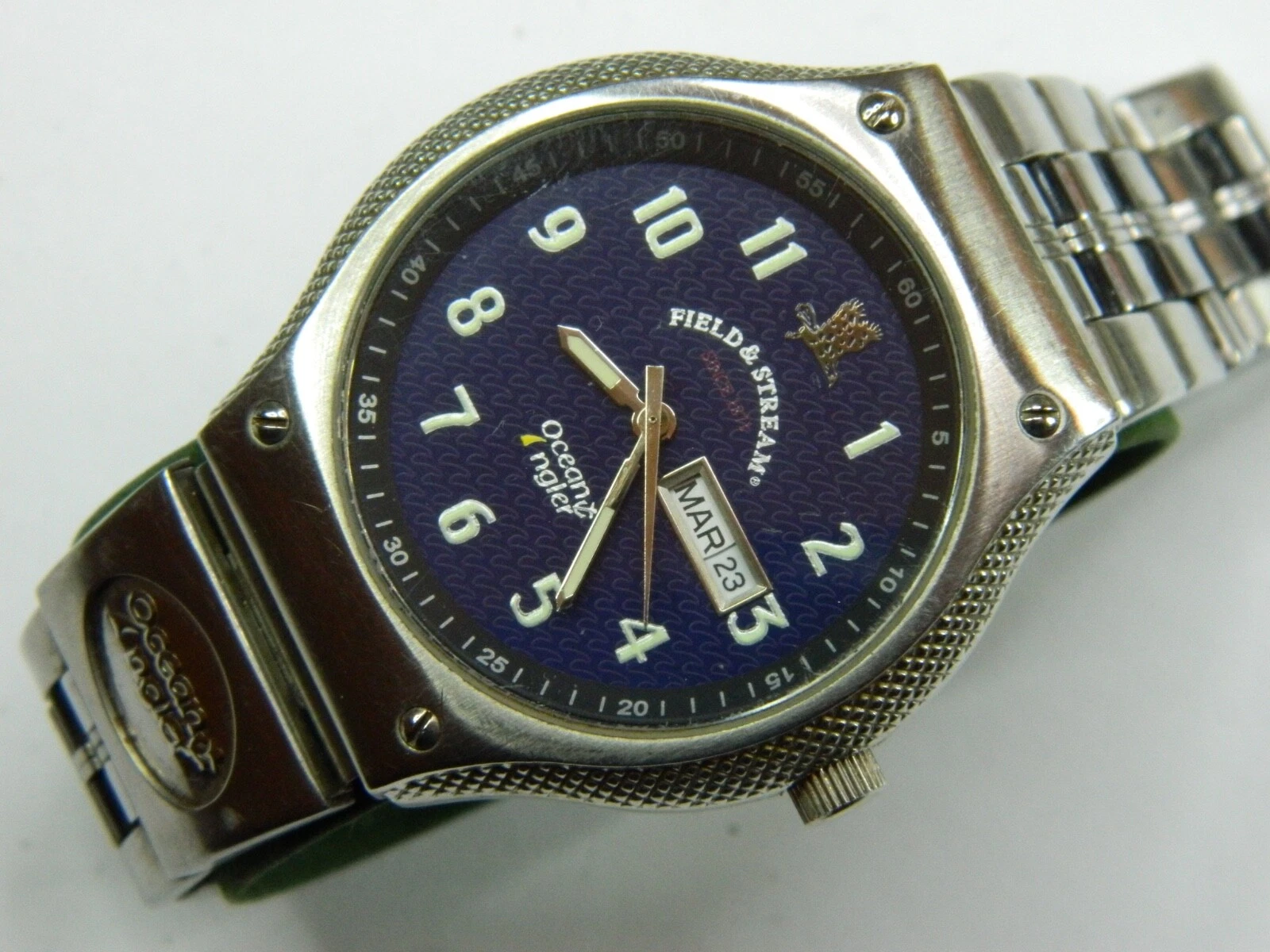 NICE FIELD & STREAM OCEAN ANGLER STAINLESS STEEL MENS WATCH - NEW BATTERY - RUNS
