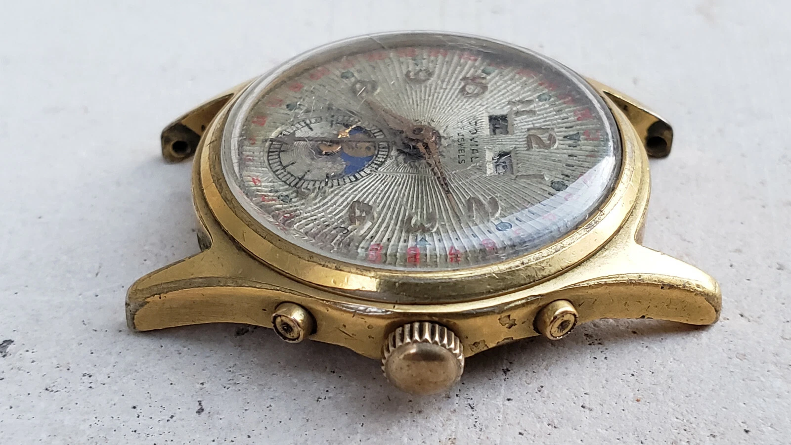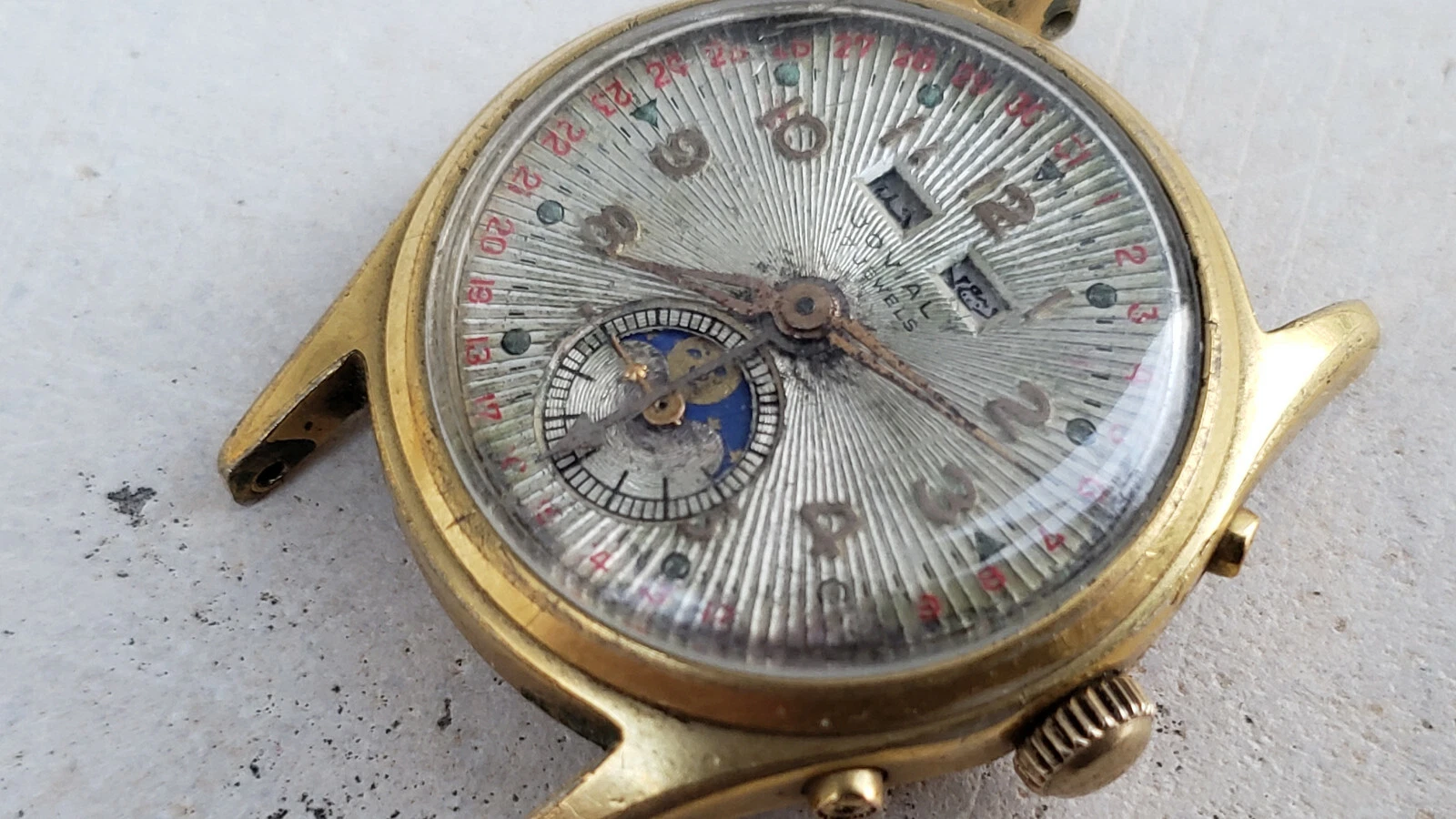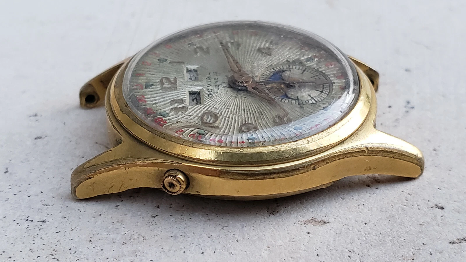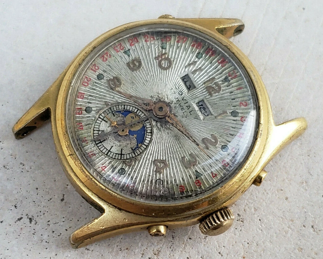 VINTAGE JOVIAL TRIPLE DATE MOONPHASE GOLD PLATED 32MM MENS WATCH