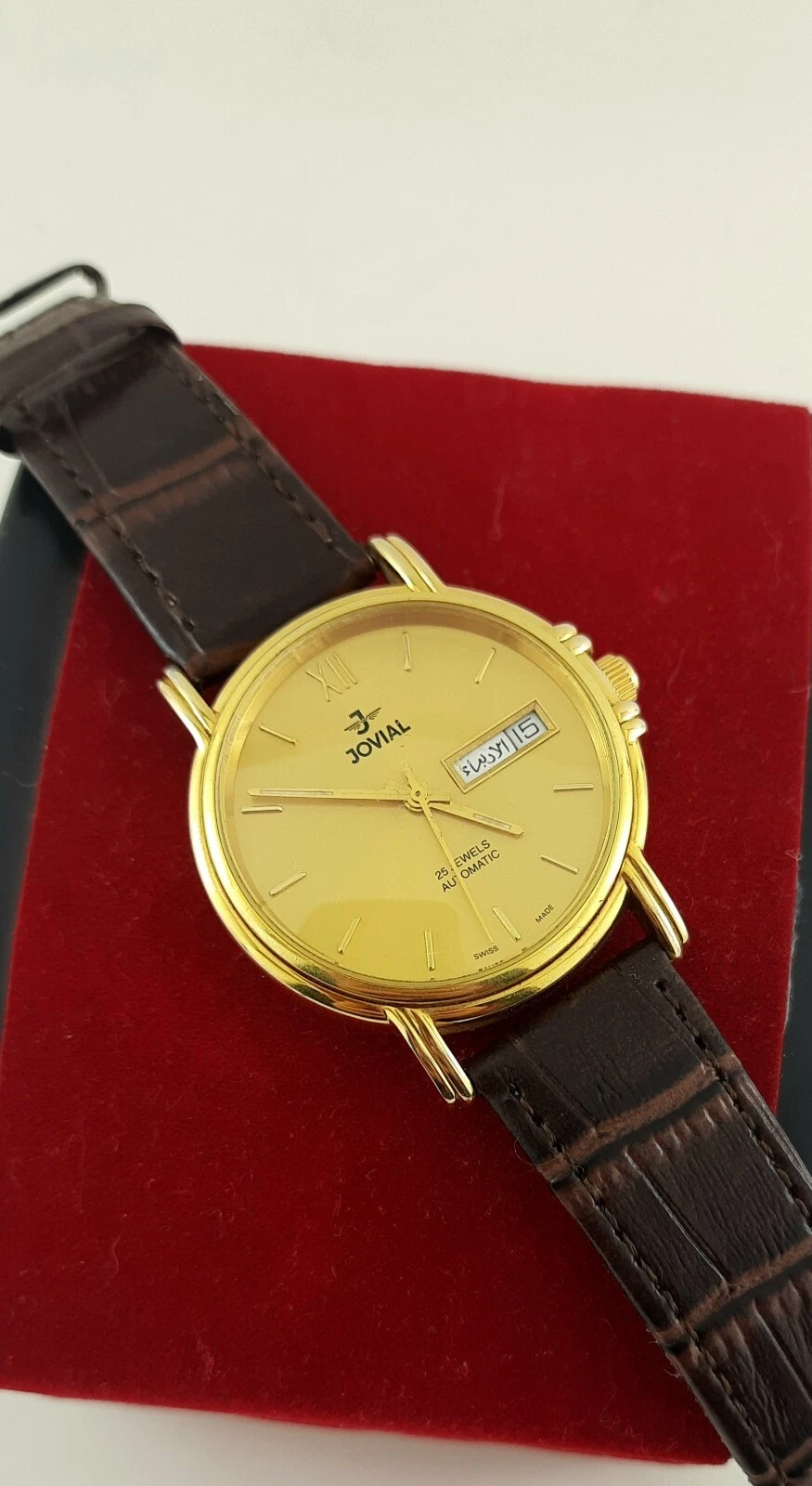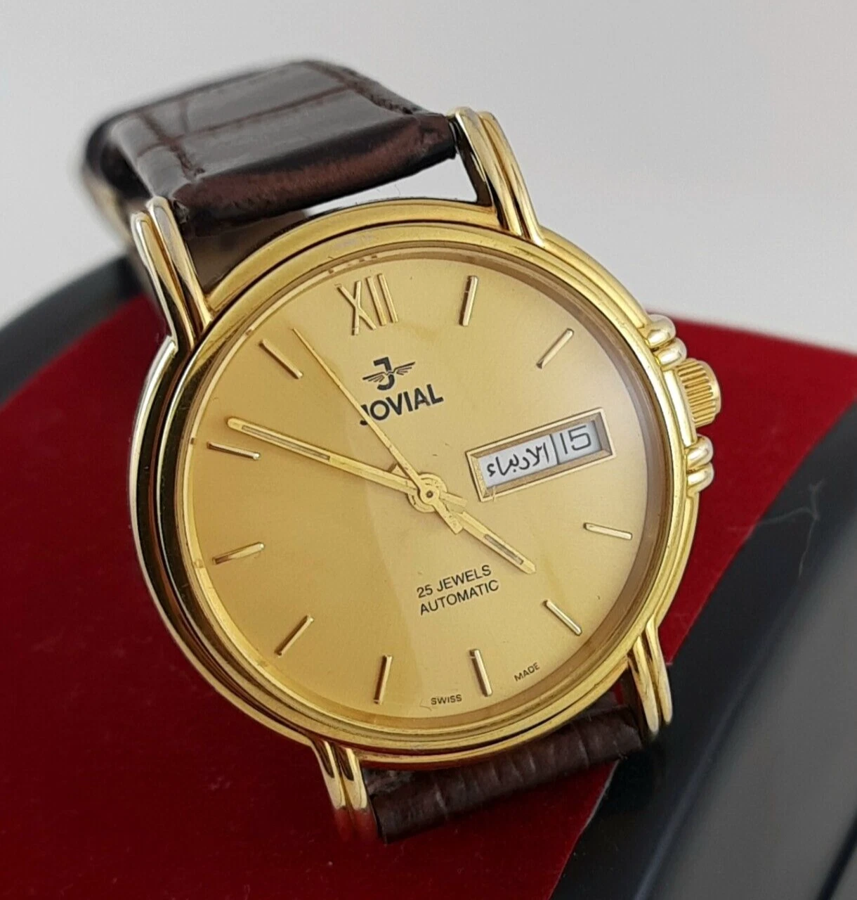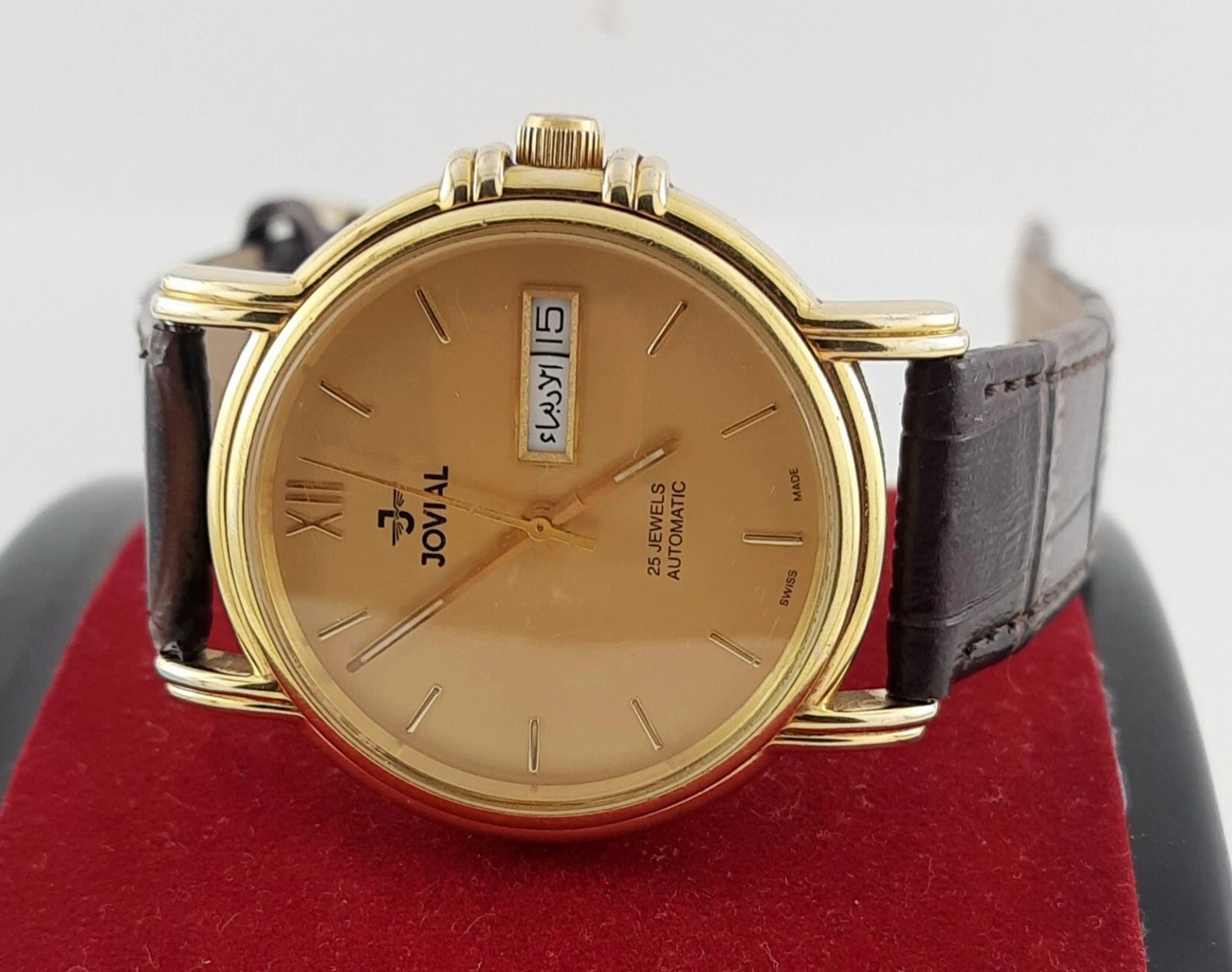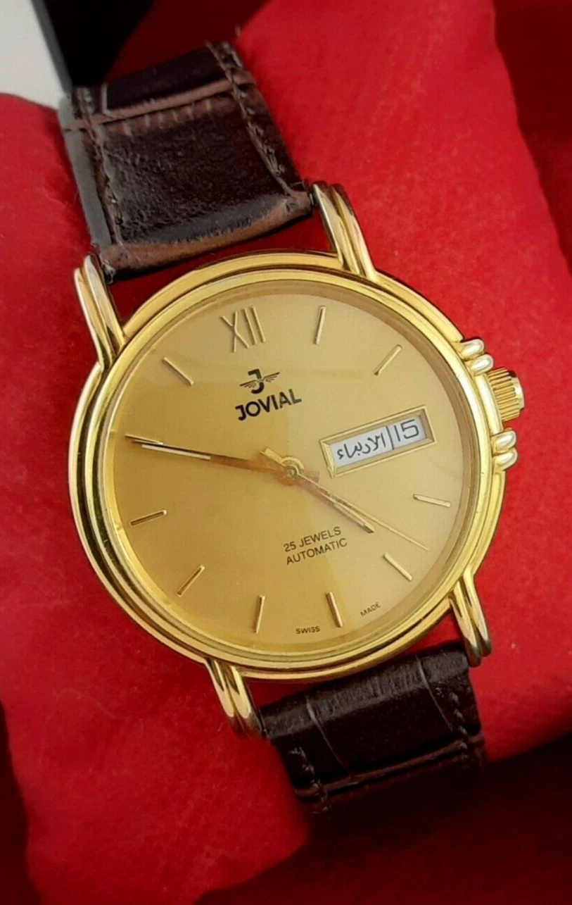 RARE jOVIAL AUTOMATIC 25JEWELS DAY-DATE SWISS MADE SS GOLDEN MEN’S WRIST WATCH