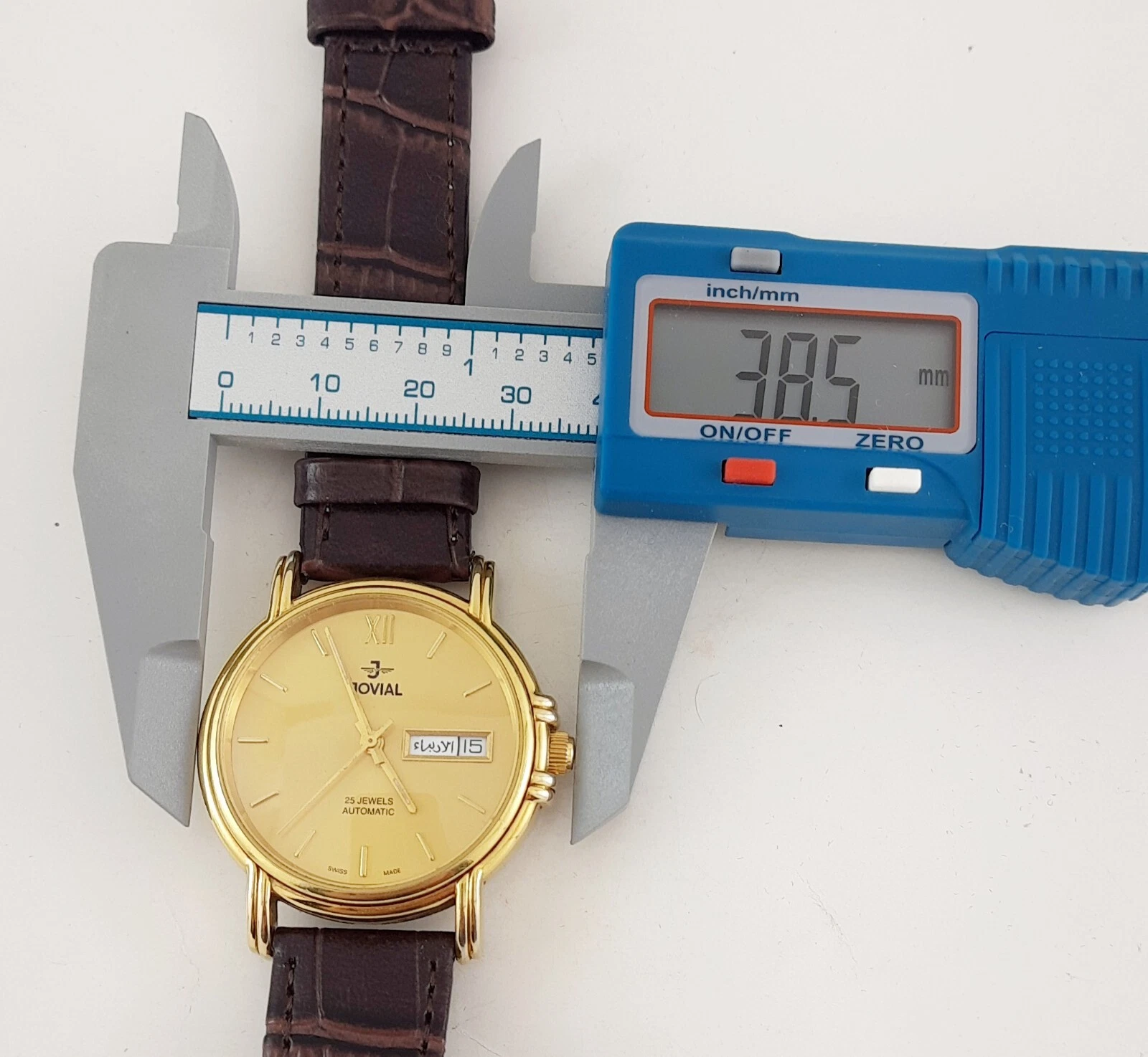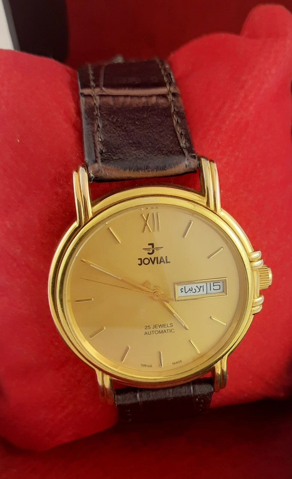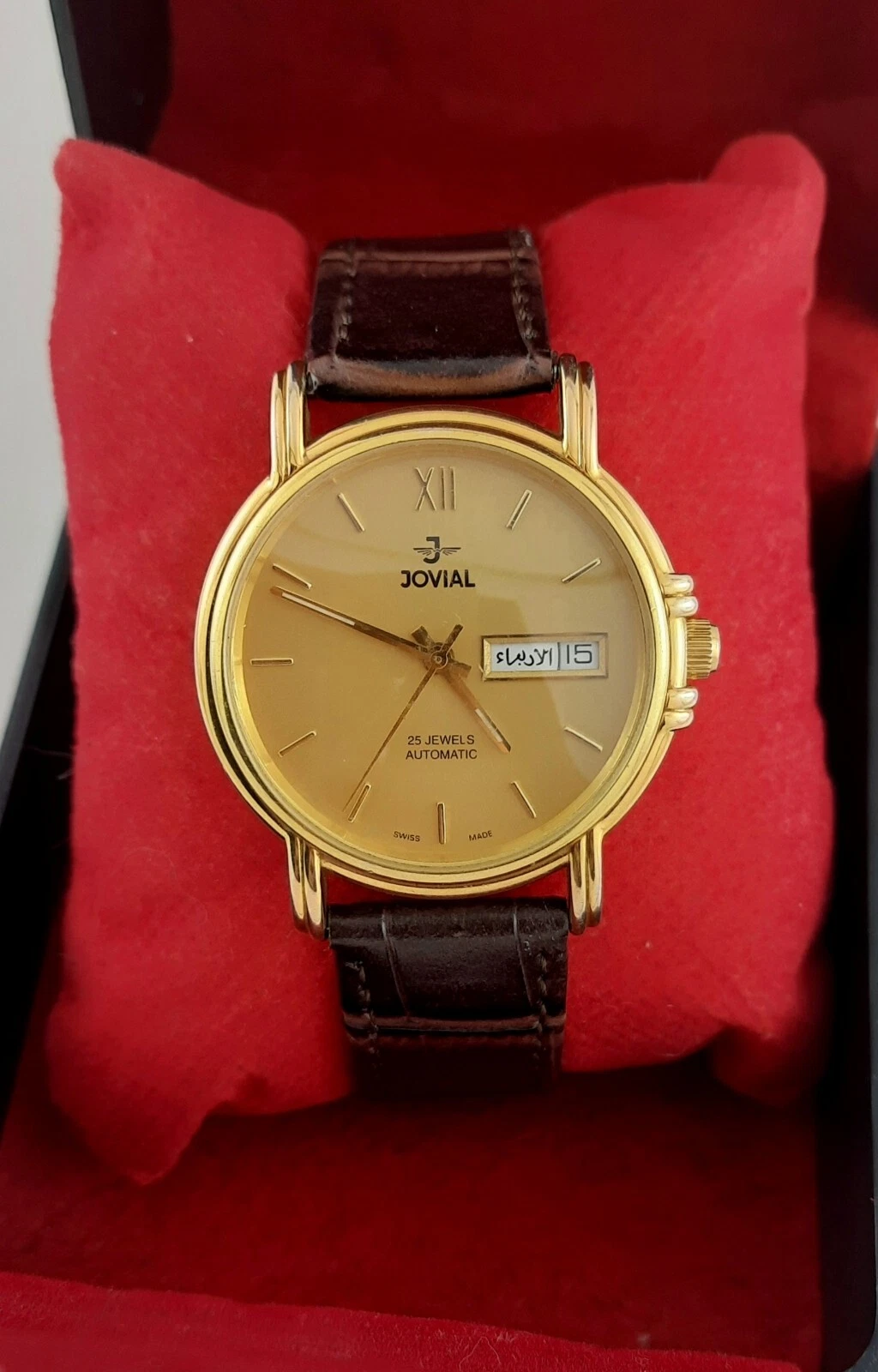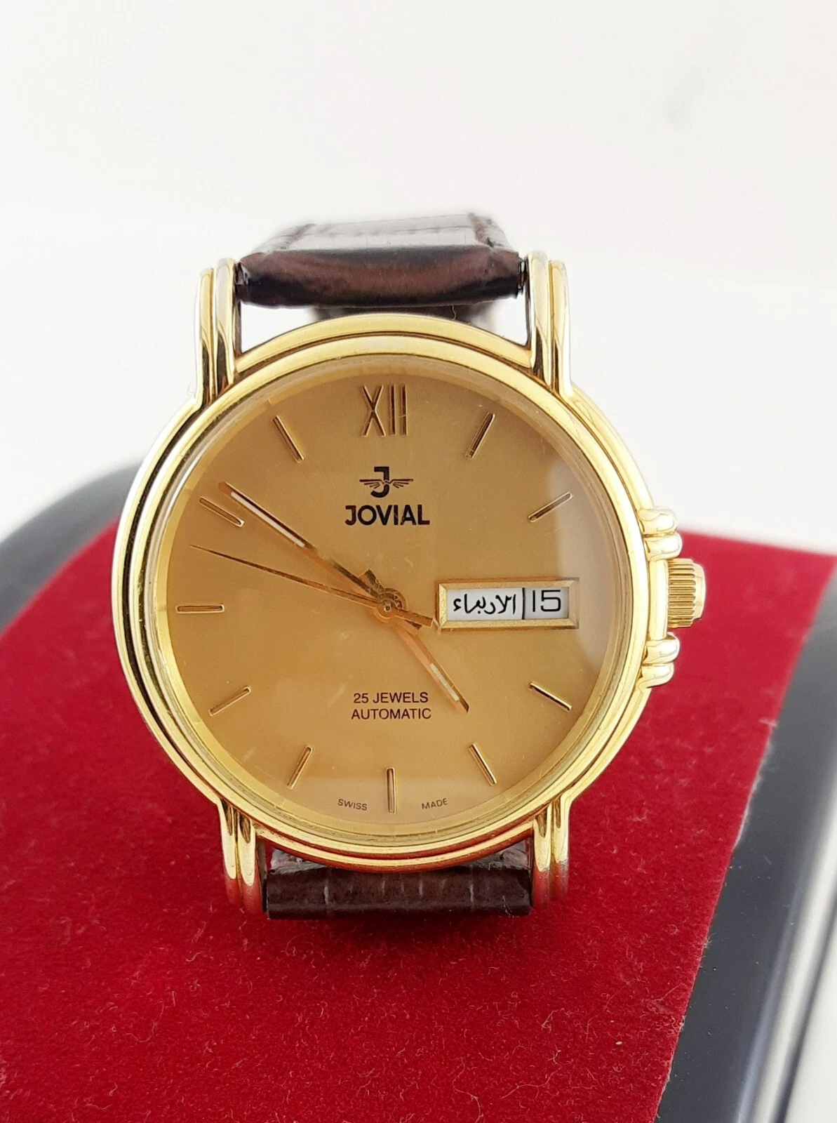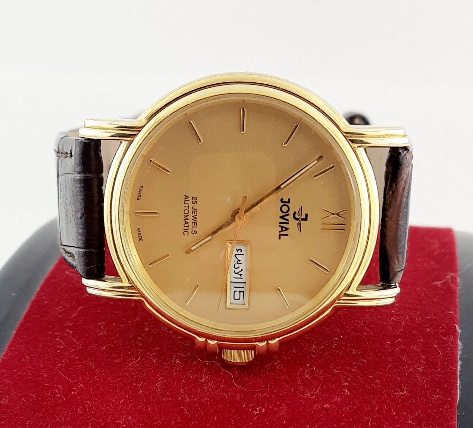 RARE jOVIAL AUTOMATIC 25JEWELS DAY-DATE SWISS MADE SS GOLDEN MEN’S WRIST WATCH