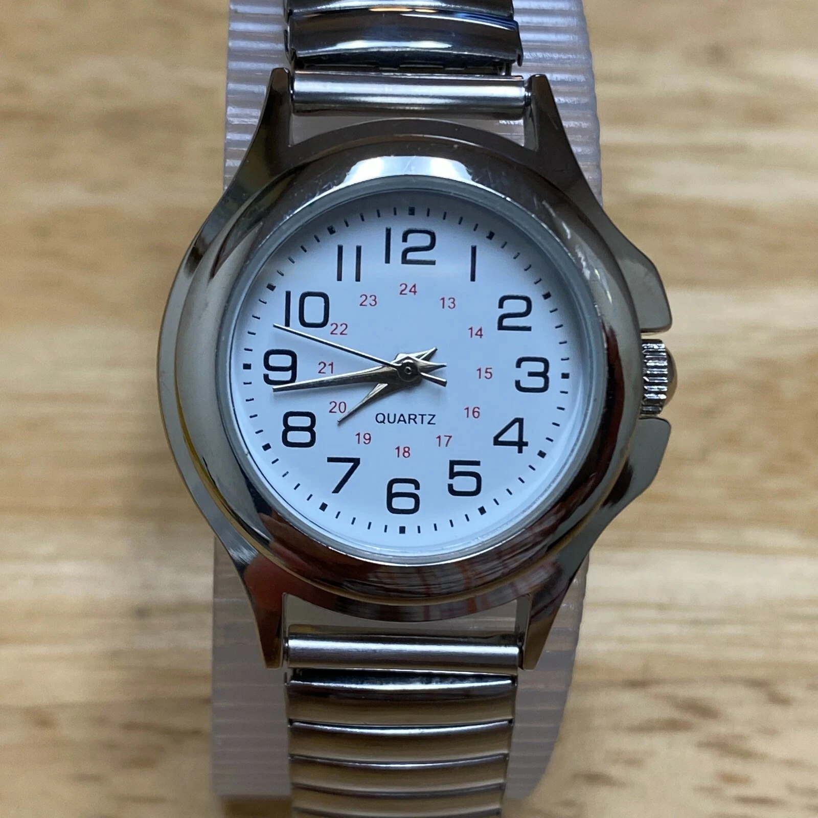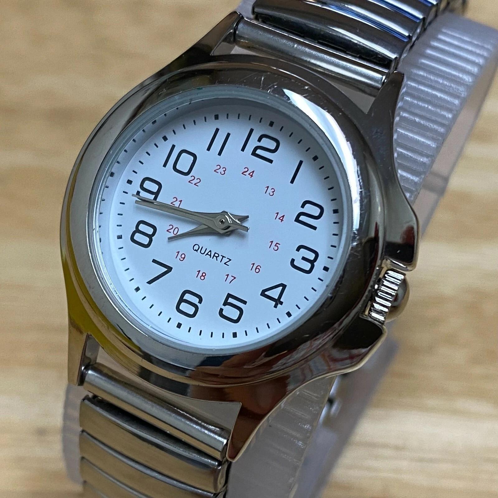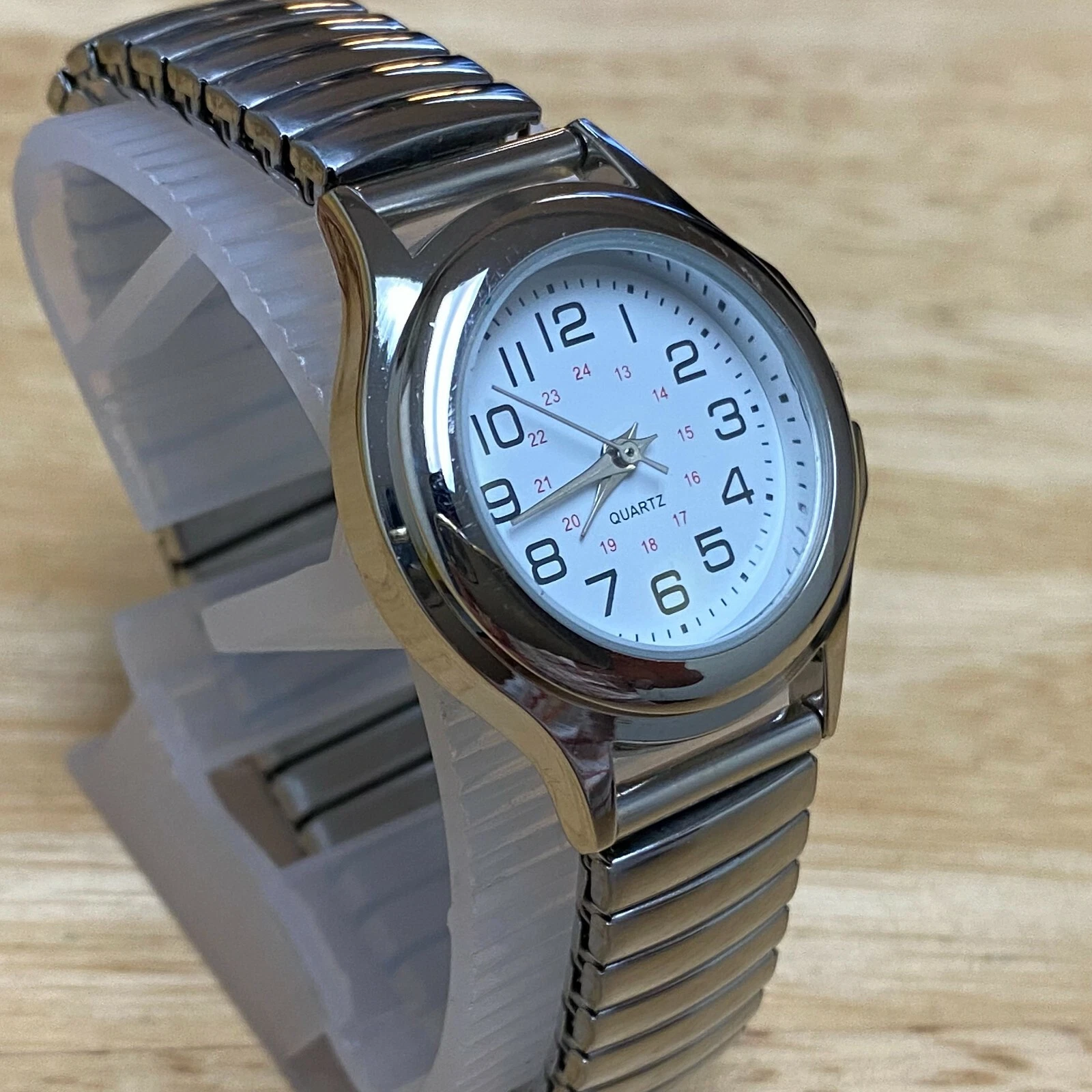 VTG FMD Lady Military Dial Silver White Stretch Analog Quartz Watch~New Battery