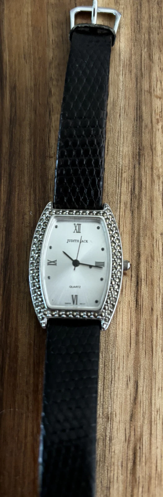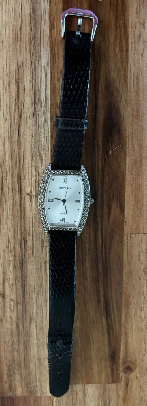 Judith Jack Watch Sterling Silver Rhinestone Black Leather Band Wrist Watch