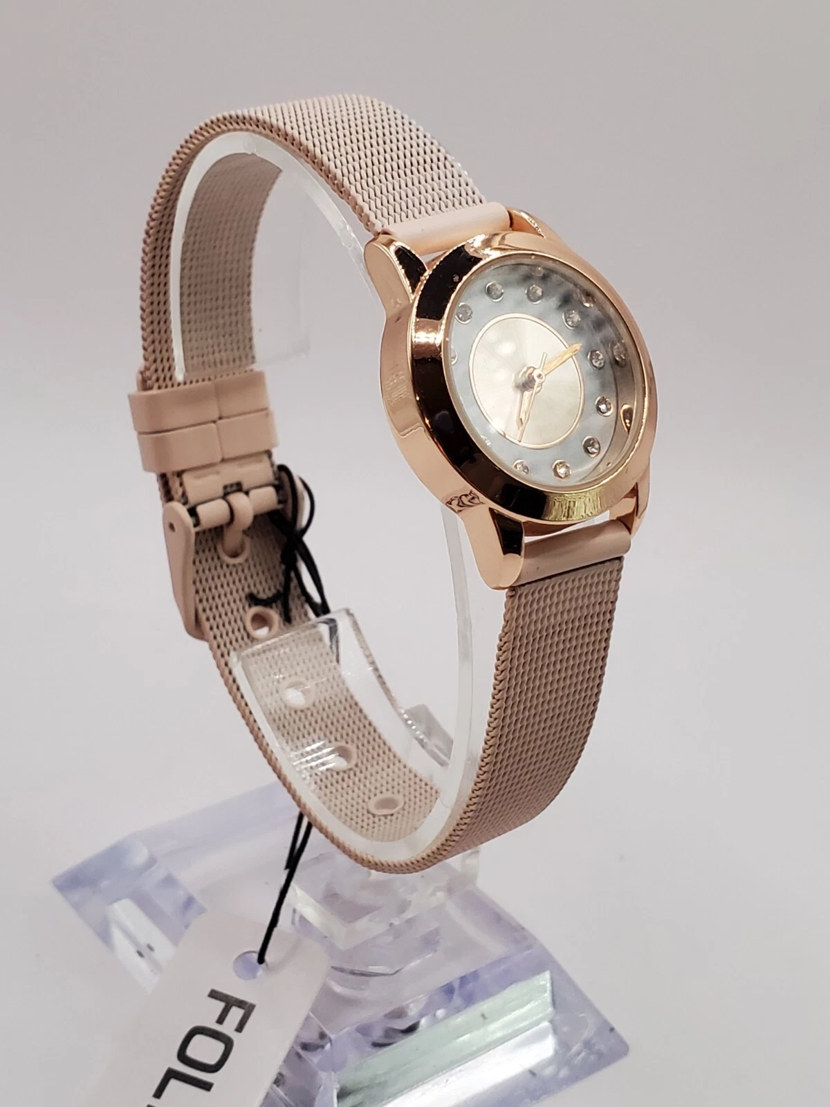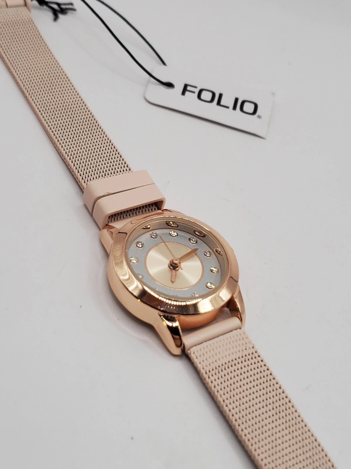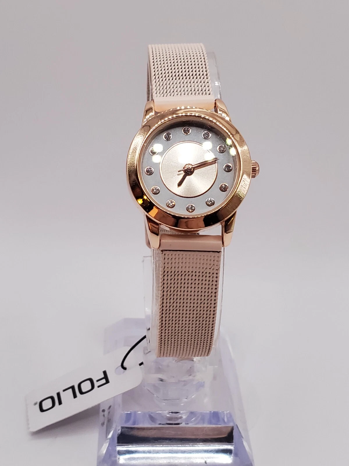 Folio Ladies Quartz Watch 24mm Round Gold Tone Pink Mesh Band