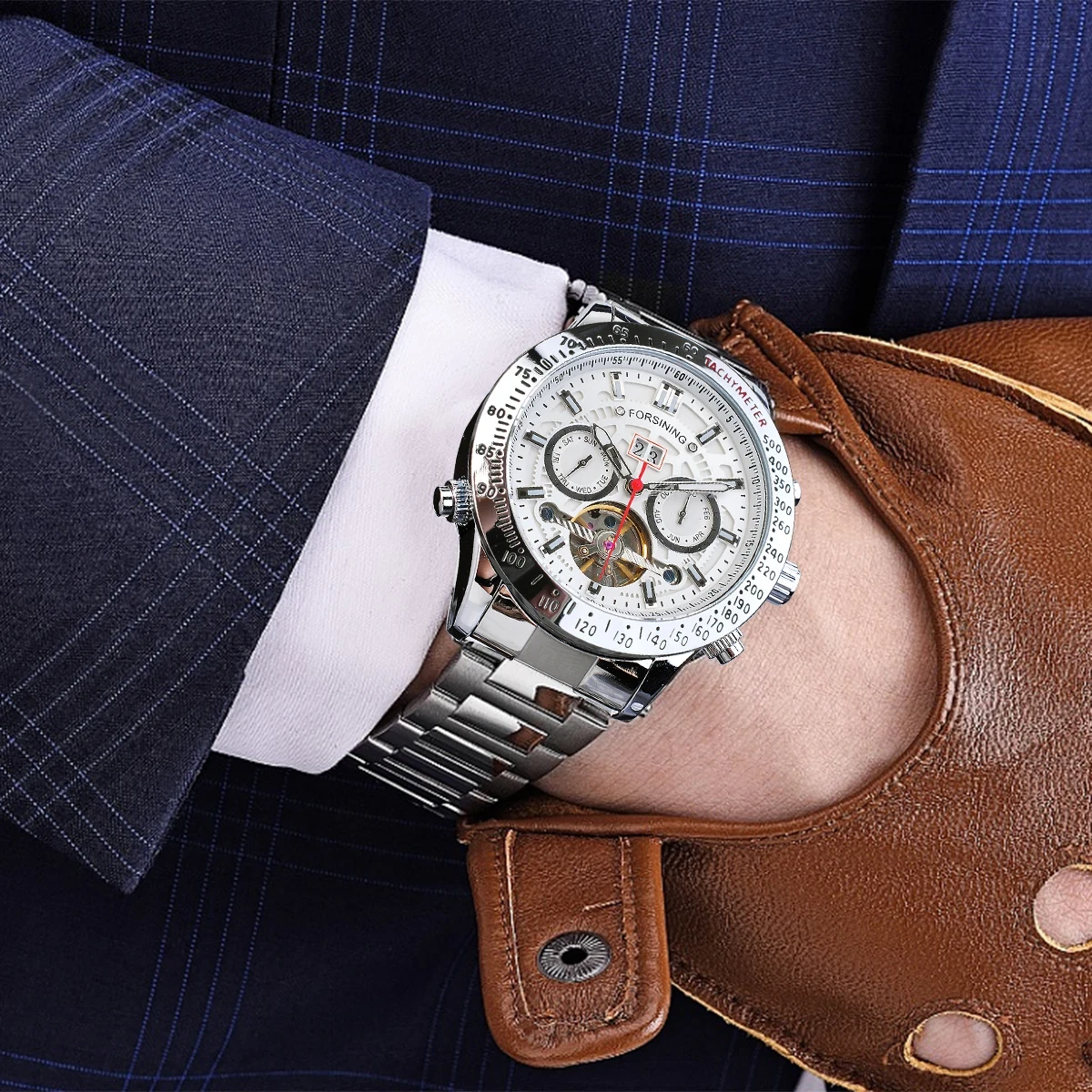 Forsining Mens Watches Automatic Business Waterproof Silver