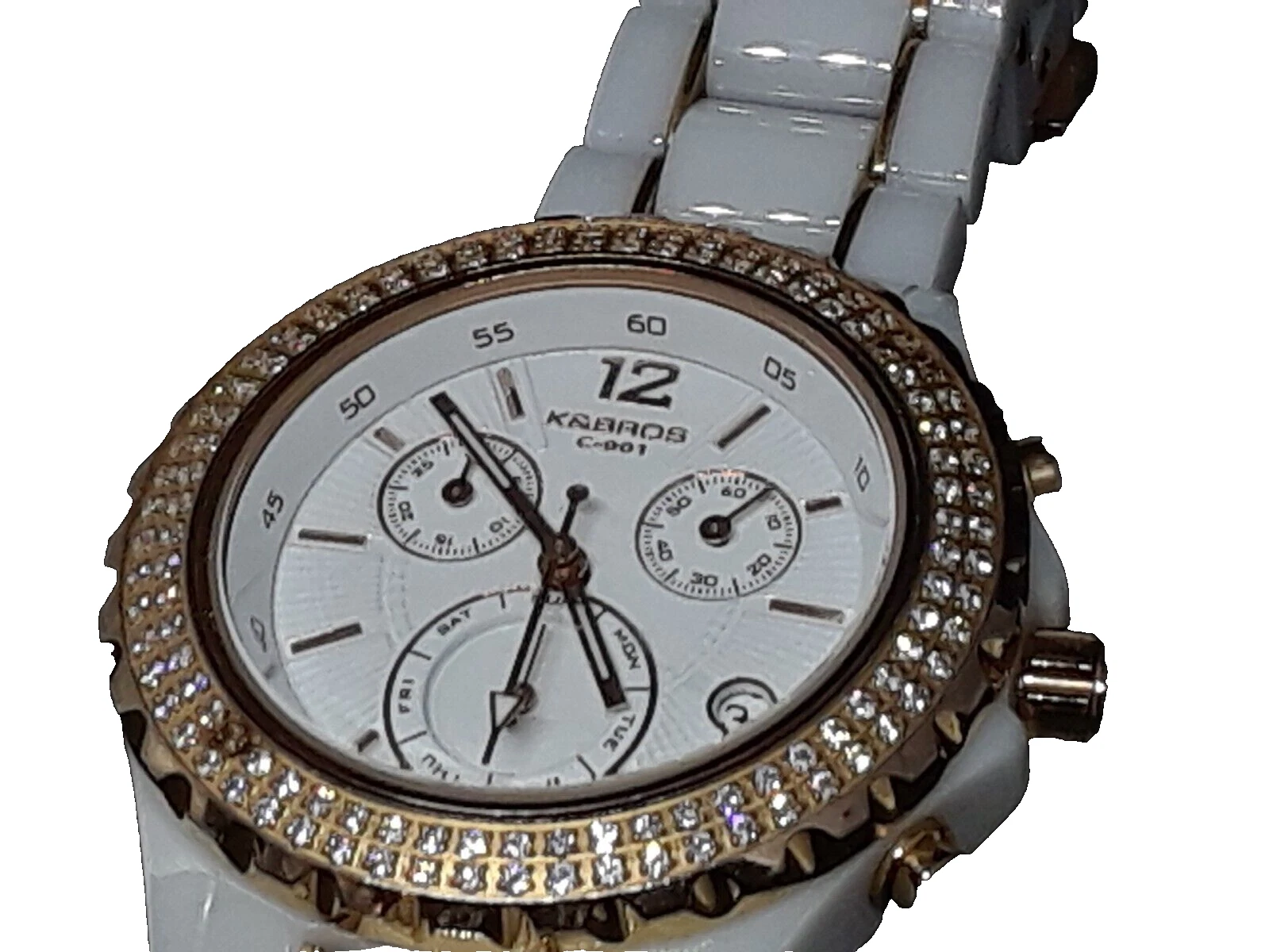 K&BROS Women's - 9151-2 - C-901 Watch Full Ceramic Stones Chronograph - White
