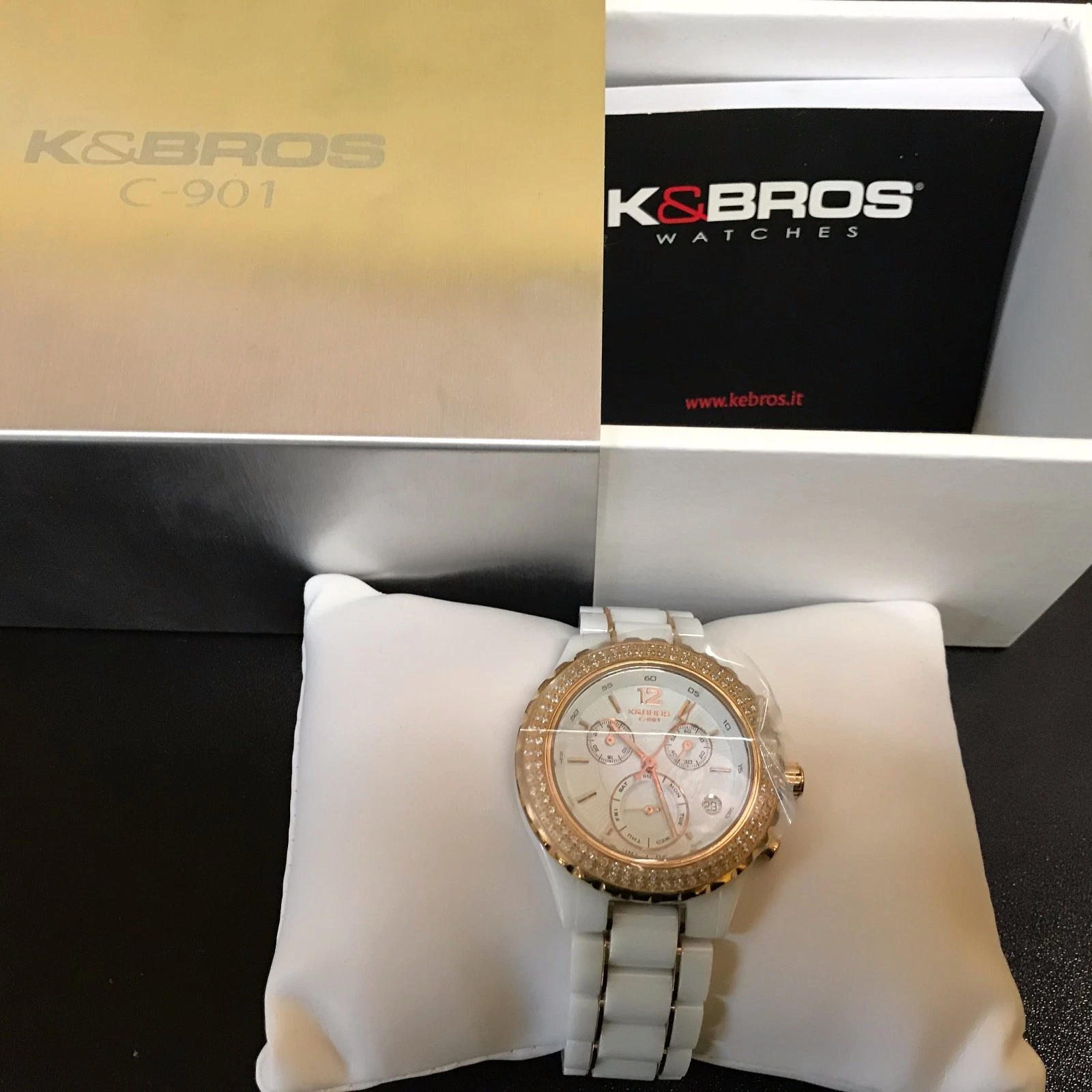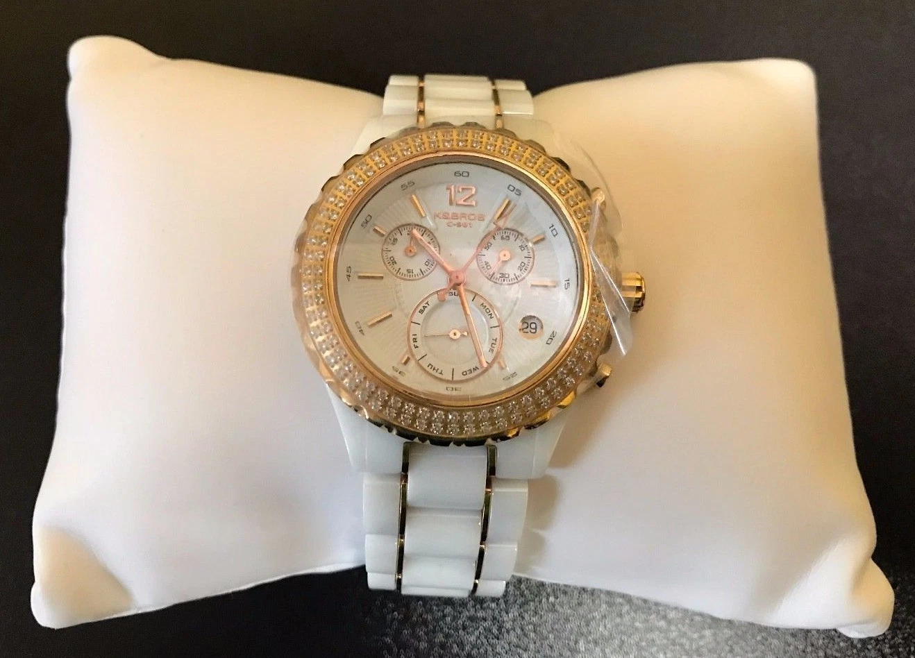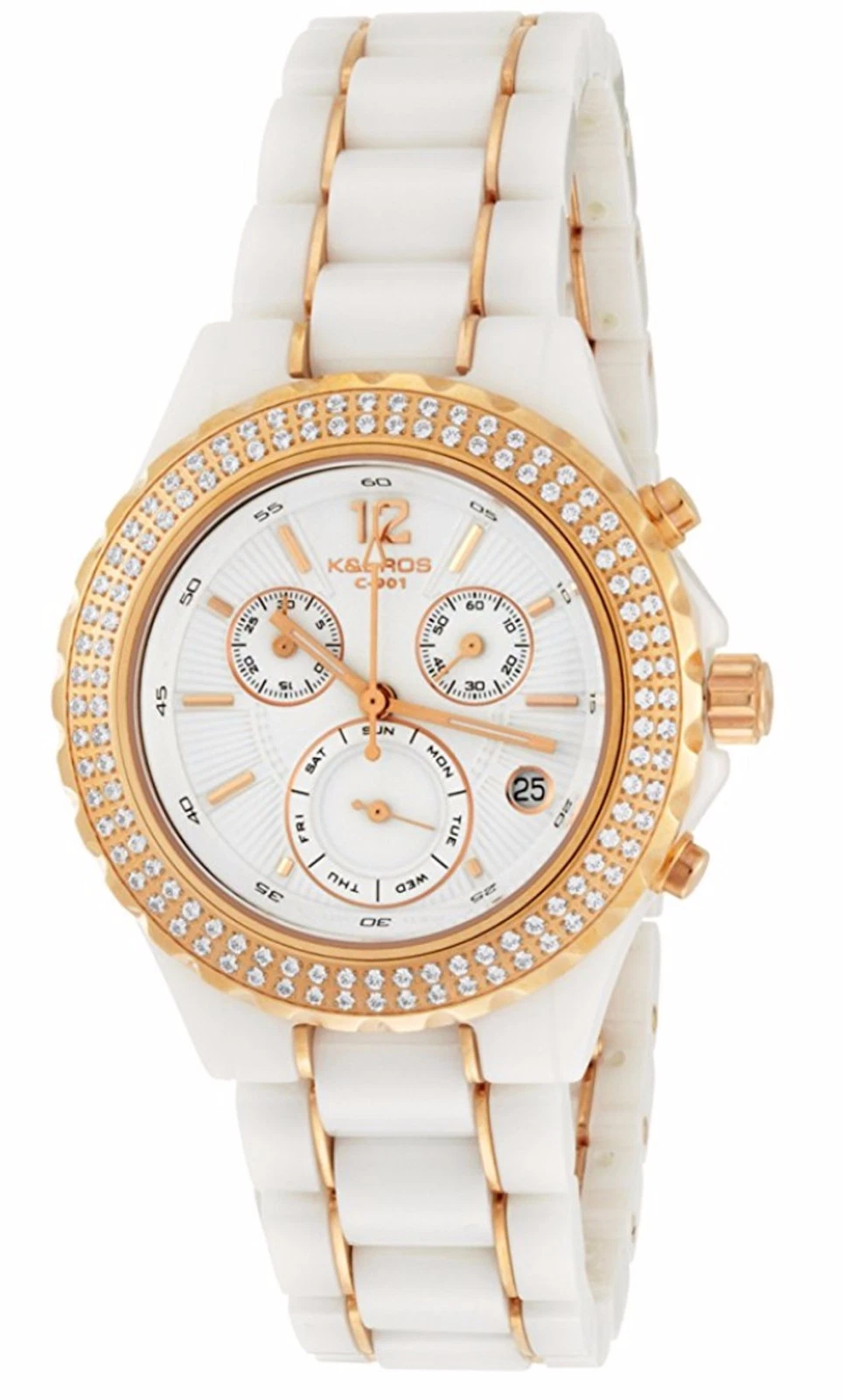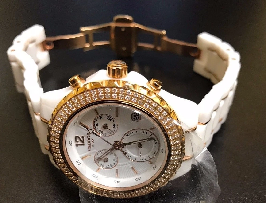 K&BROS Women's - 9151-2 - C-901 Watch Full Ceramic Stones Chronograph - White