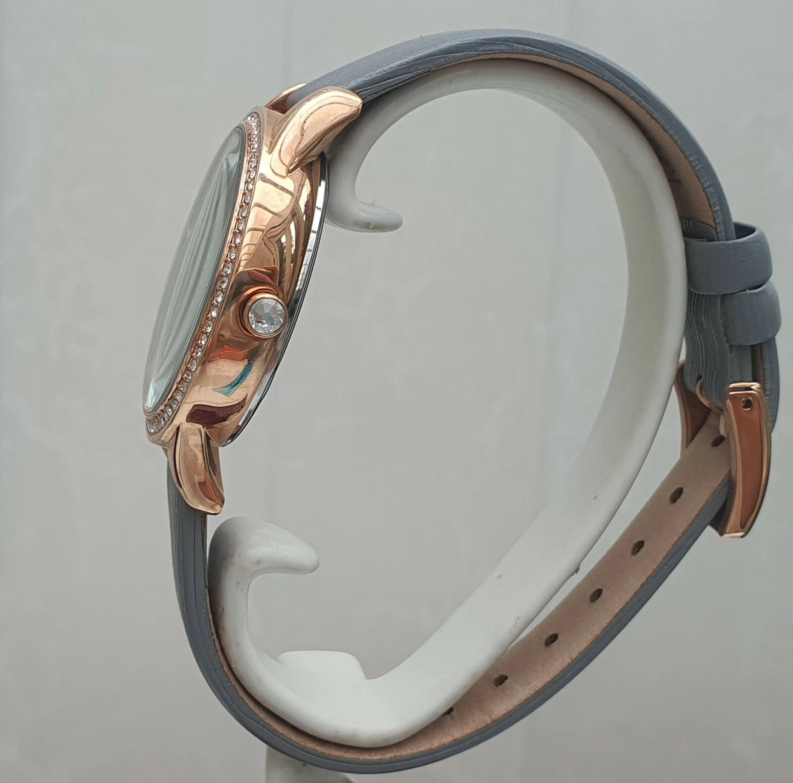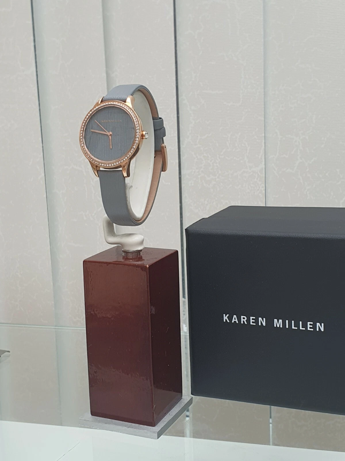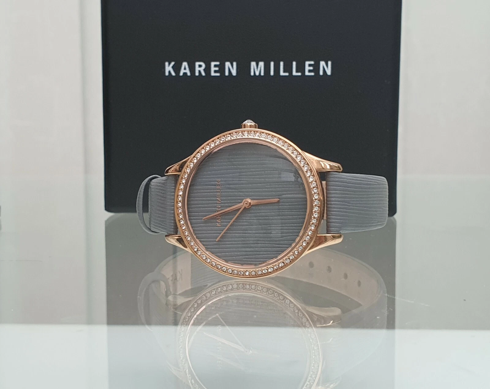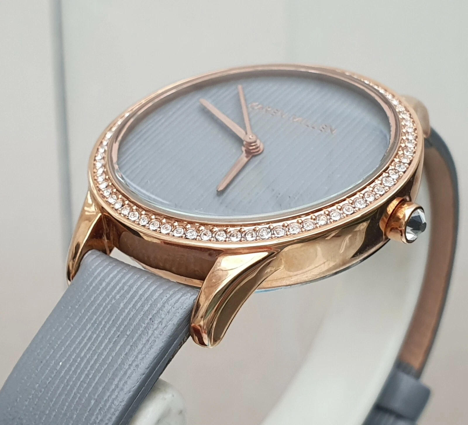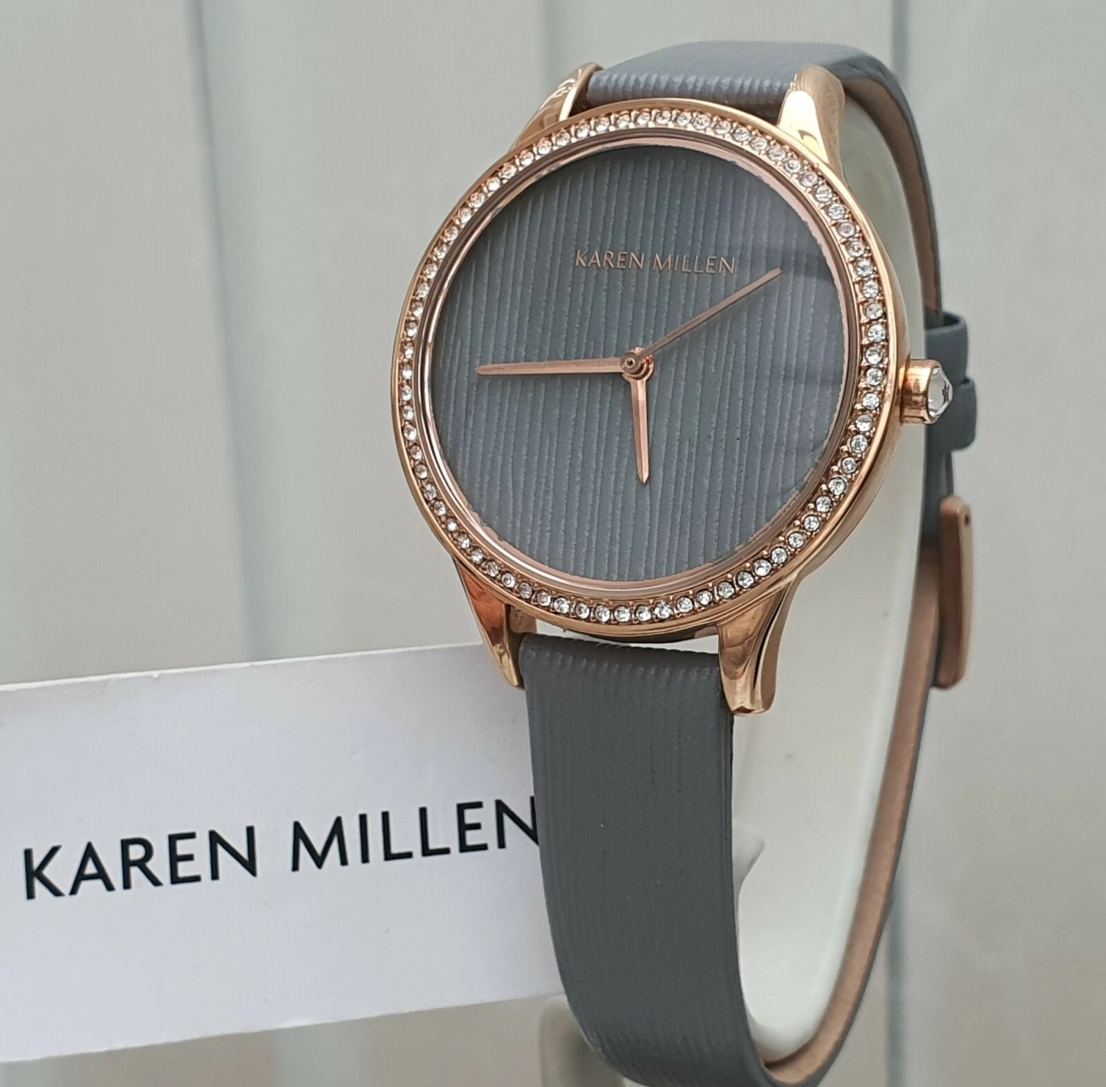 New KAREN MILLEN Ladies Watch Rose gold pl. Grey leather strap RRP£189 Box (KM67