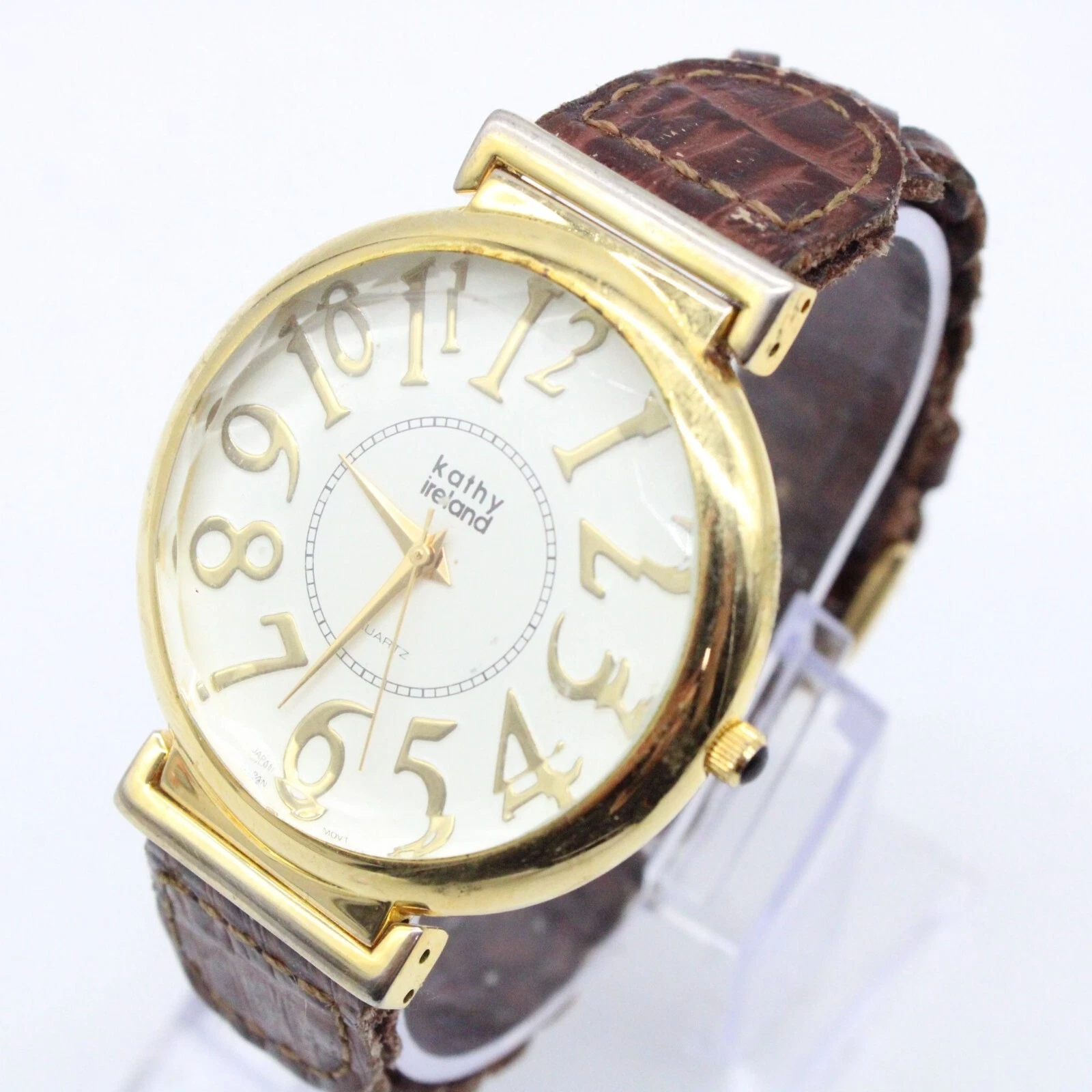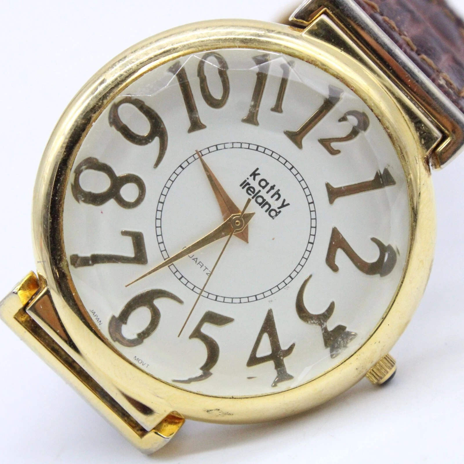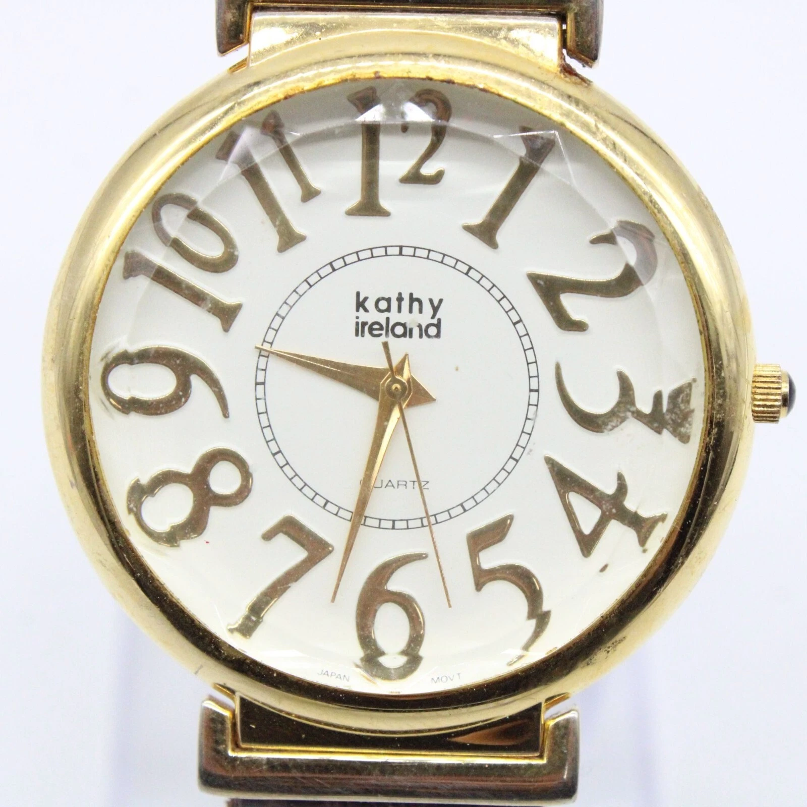 Vintage Kathy Ireland Watch Women Gold Tone Stainless Steel Big Round White Face