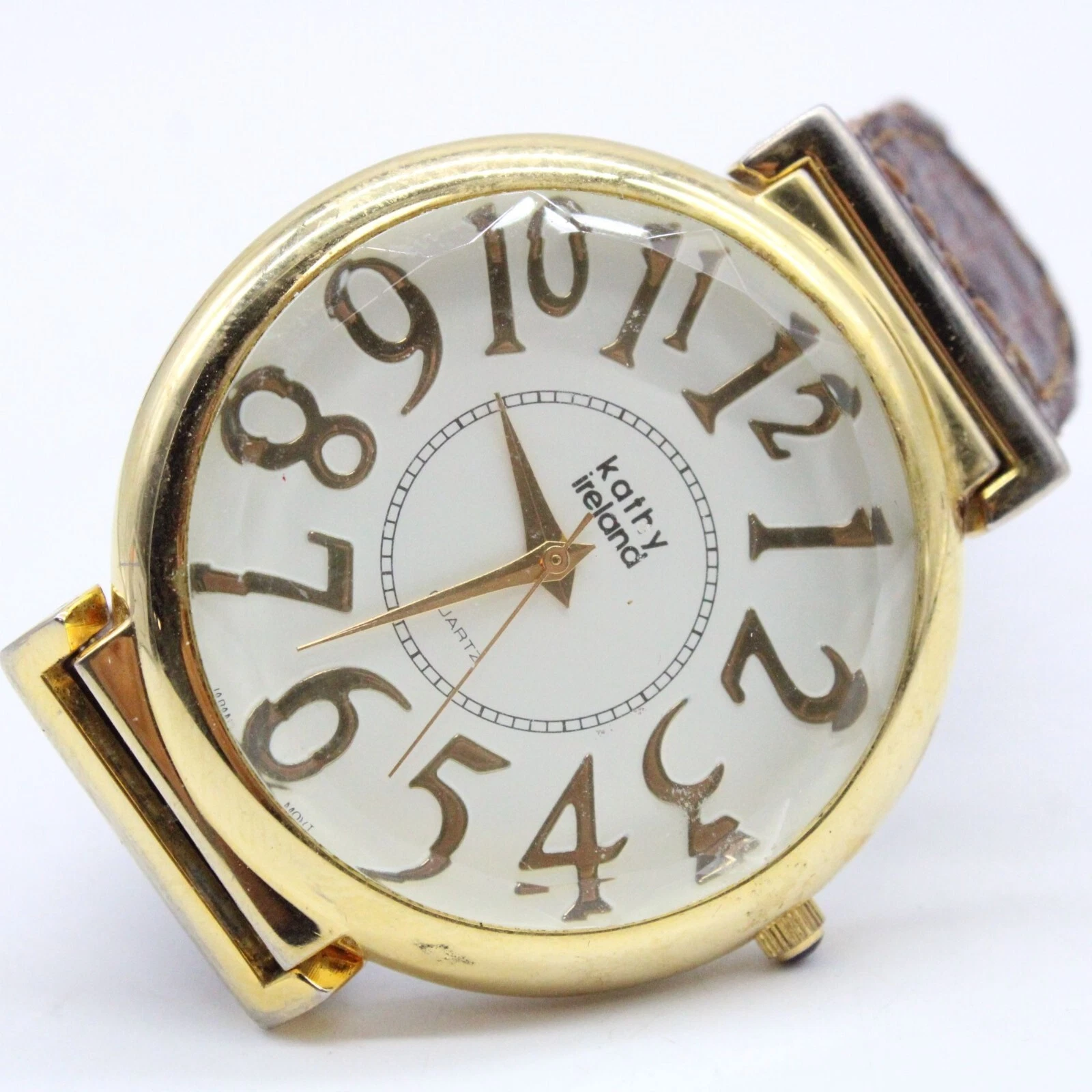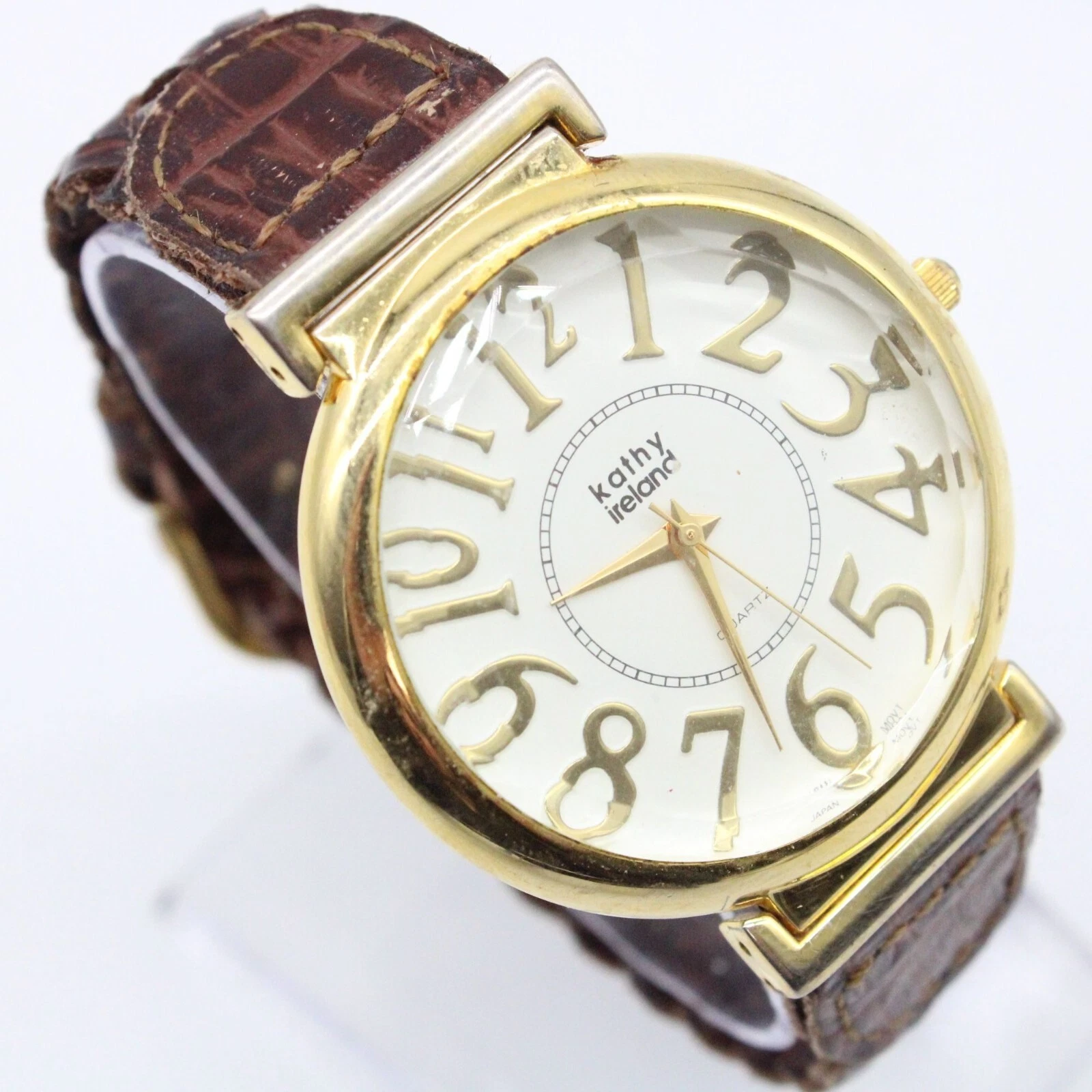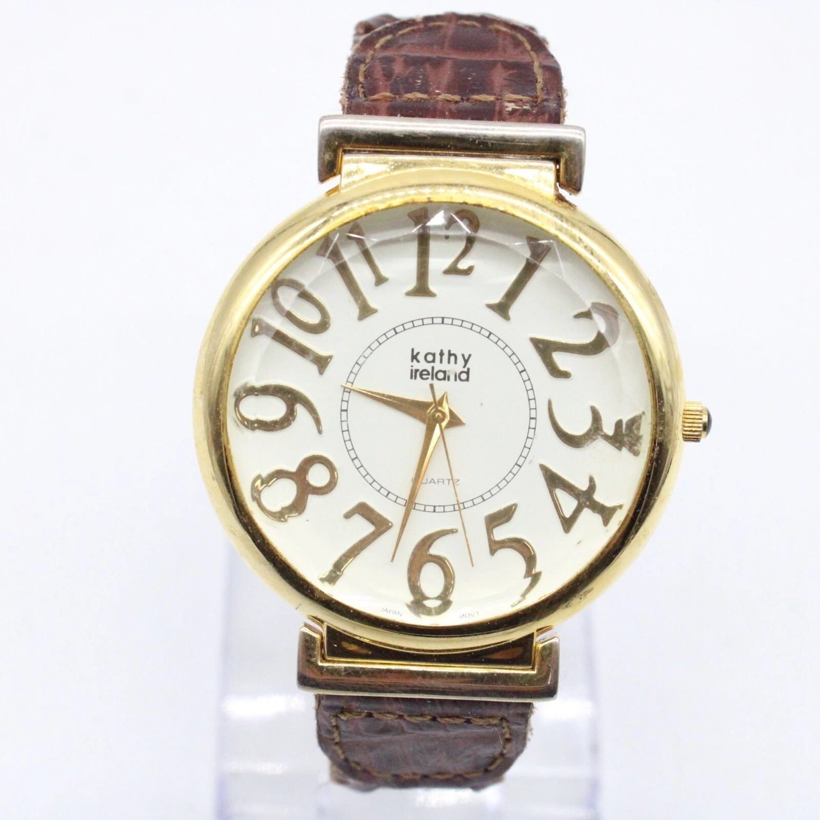 Vintage Kathy Ireland Watch Women Gold Tone Stainless Steel Big Round White Face