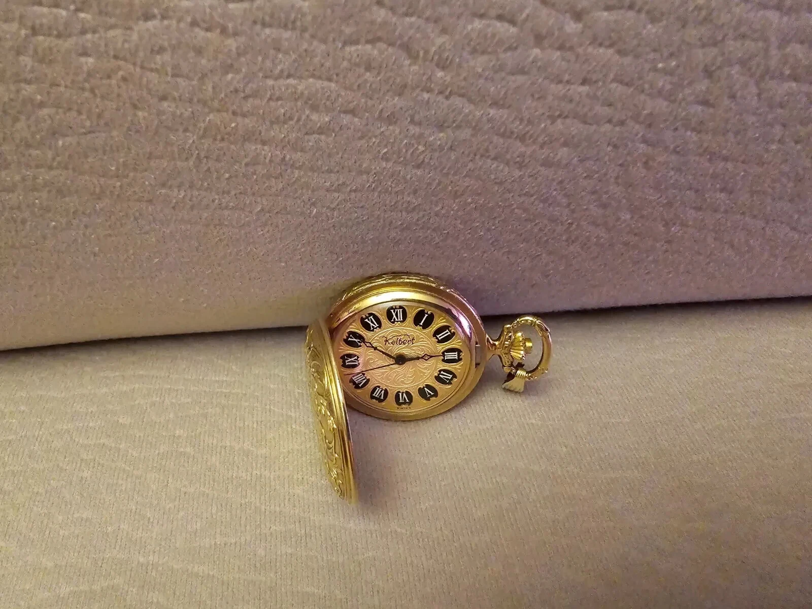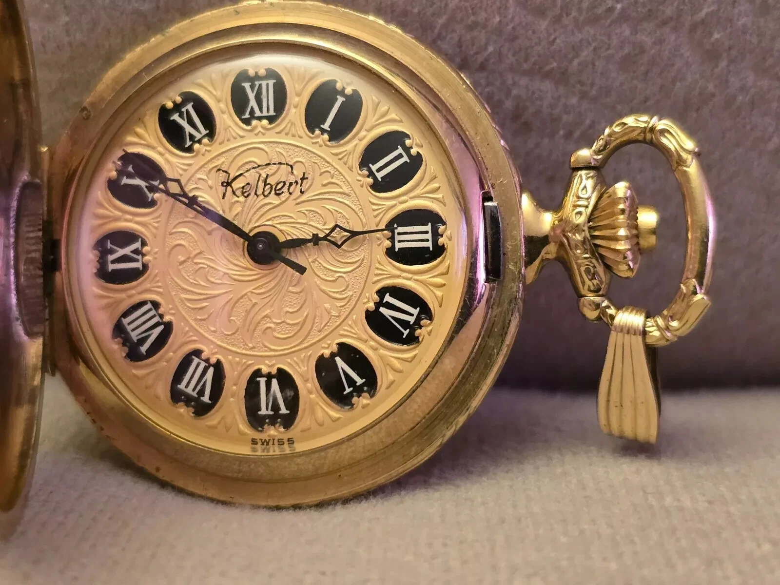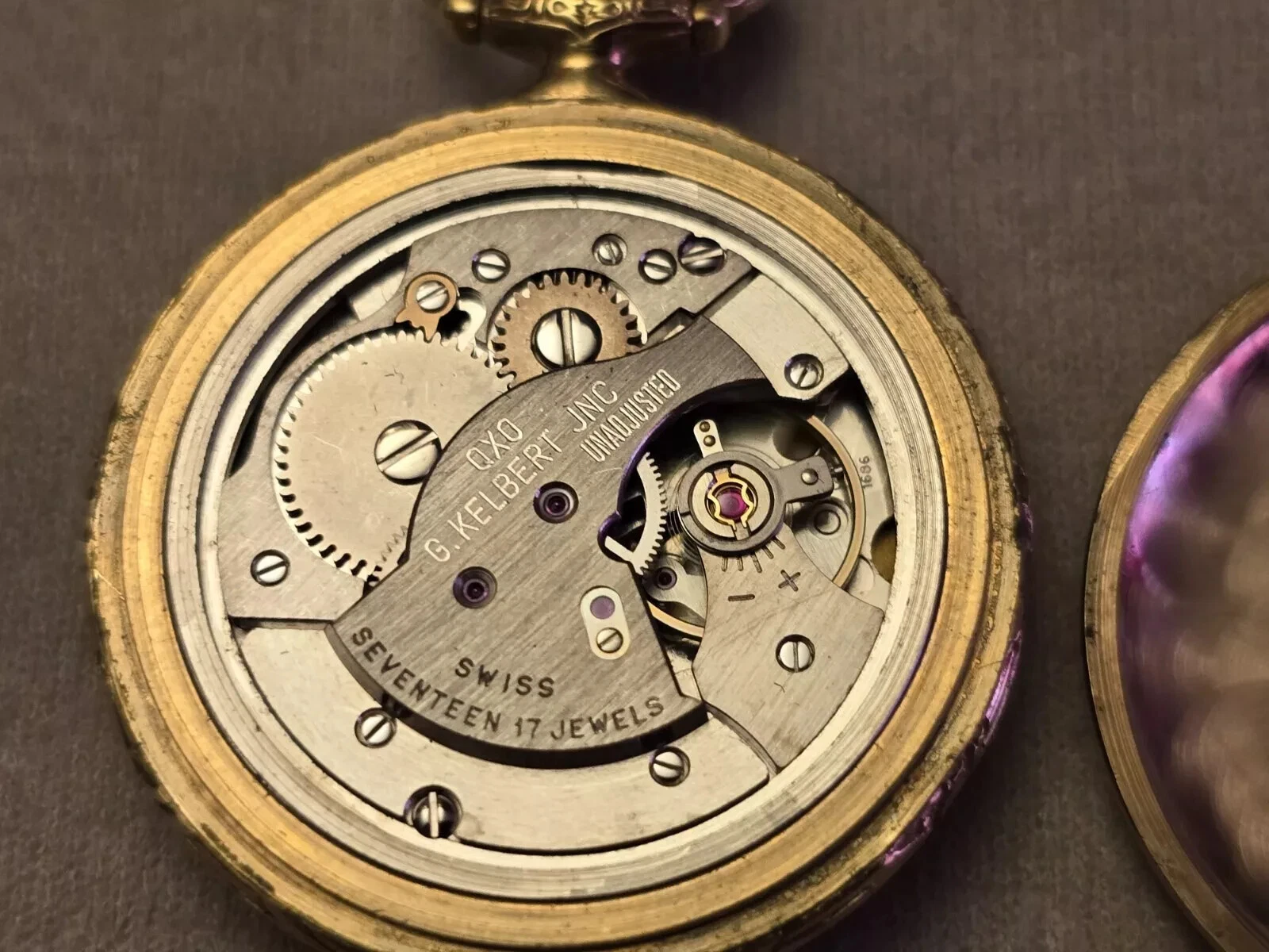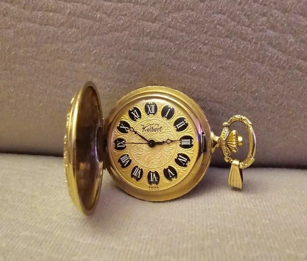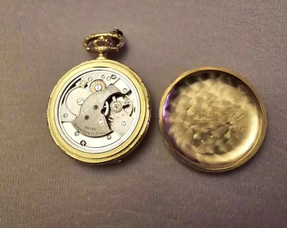 Kelbert Swiss Pocket Watch Gold Tone w/Red Filagree Cover Vintage 17 Jewel RUNS!