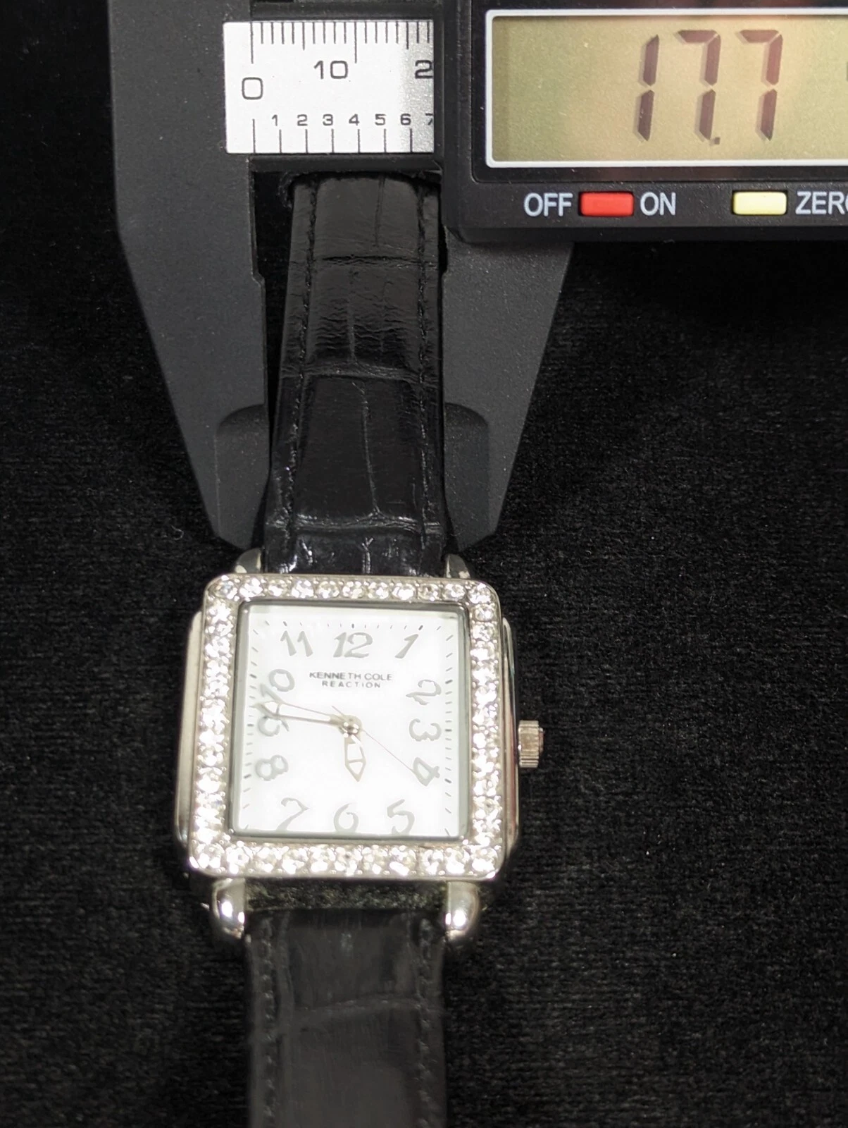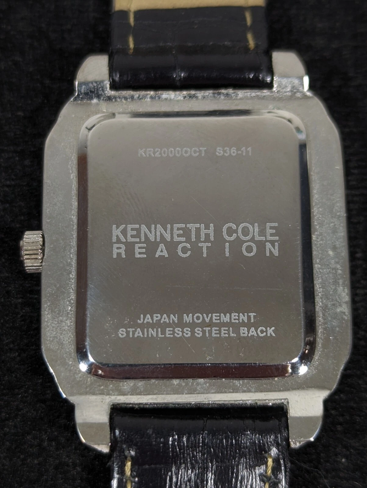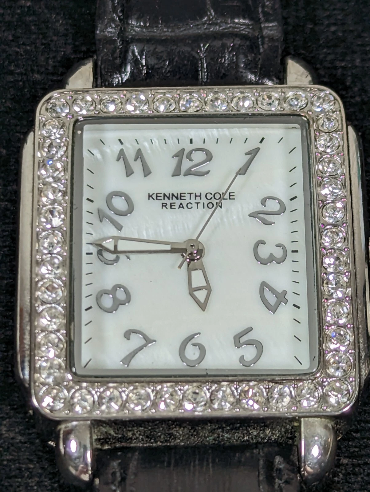 Kenneth Cole Reaction Crystal Accent Silver Tone Case Black Leather Band Watch