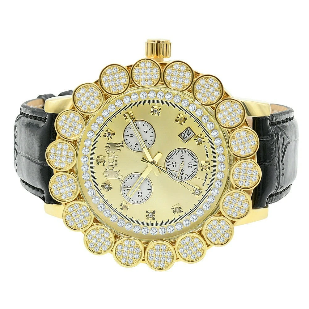 18K Yellow Gold Tone Pave Flower Cluster Bezel Real Diamond Watch Analog W/Date