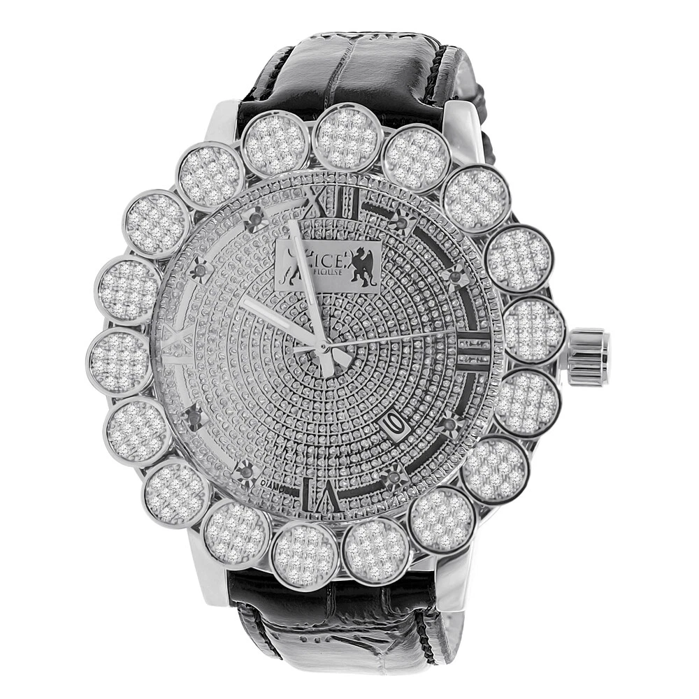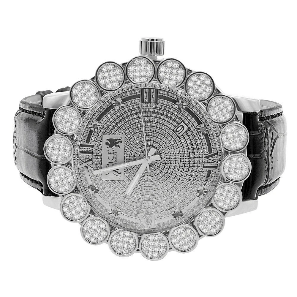 Flower Bezel Roman Face White Gold Real Diamonds Dial Leather Band W/Date Watch