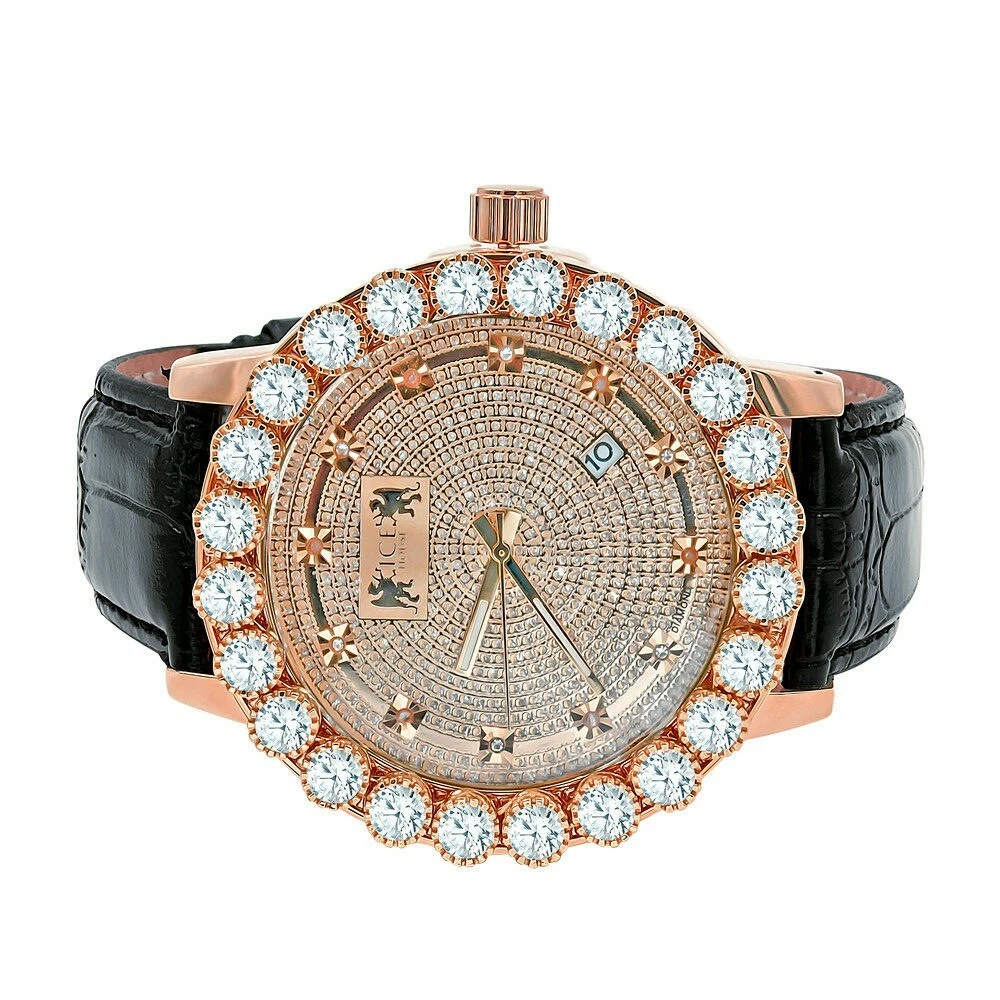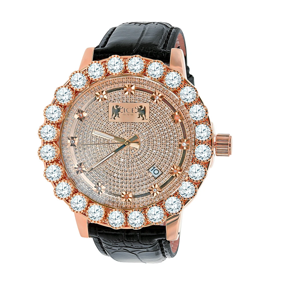 Rose Gold 2 Tone Watch Solitaire Bezel Real Diamonds Leather Strap Band W/Date