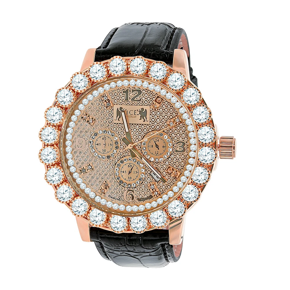 Men's Solitaire Bezel Real Diamond Dial Rose Gold Real Leather Band Watch W/Date
