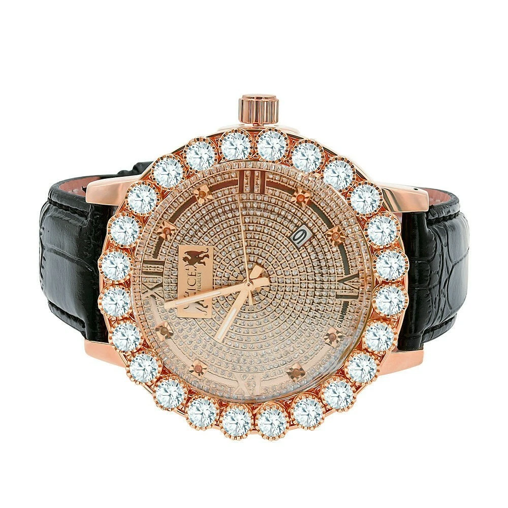 Men's Real Diamonds Dial Solitaire Bezel Rose Gold Genuine Leather Iceouse Watch
