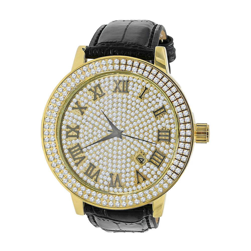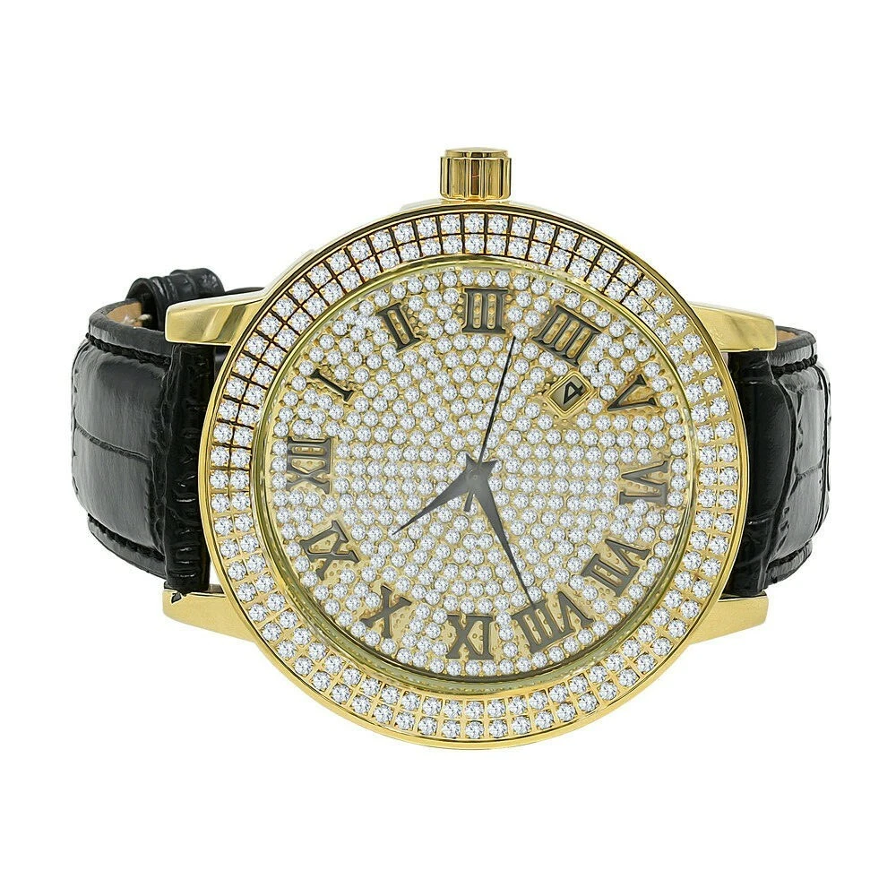 2 Row Bezel Gold Finish Men's Simulated Diamonds Dial Black Leather Watch Band