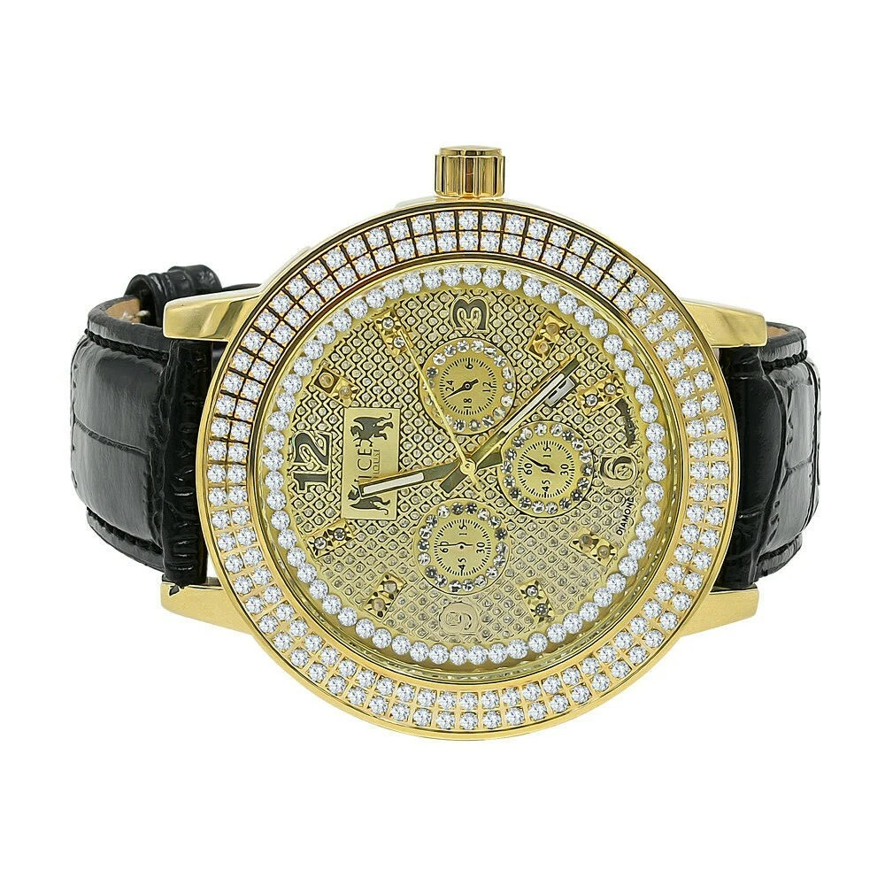 Mens 2 Row Steel Bezel Gold Finish Leather Strap Band Real Diamond Khronos Watch