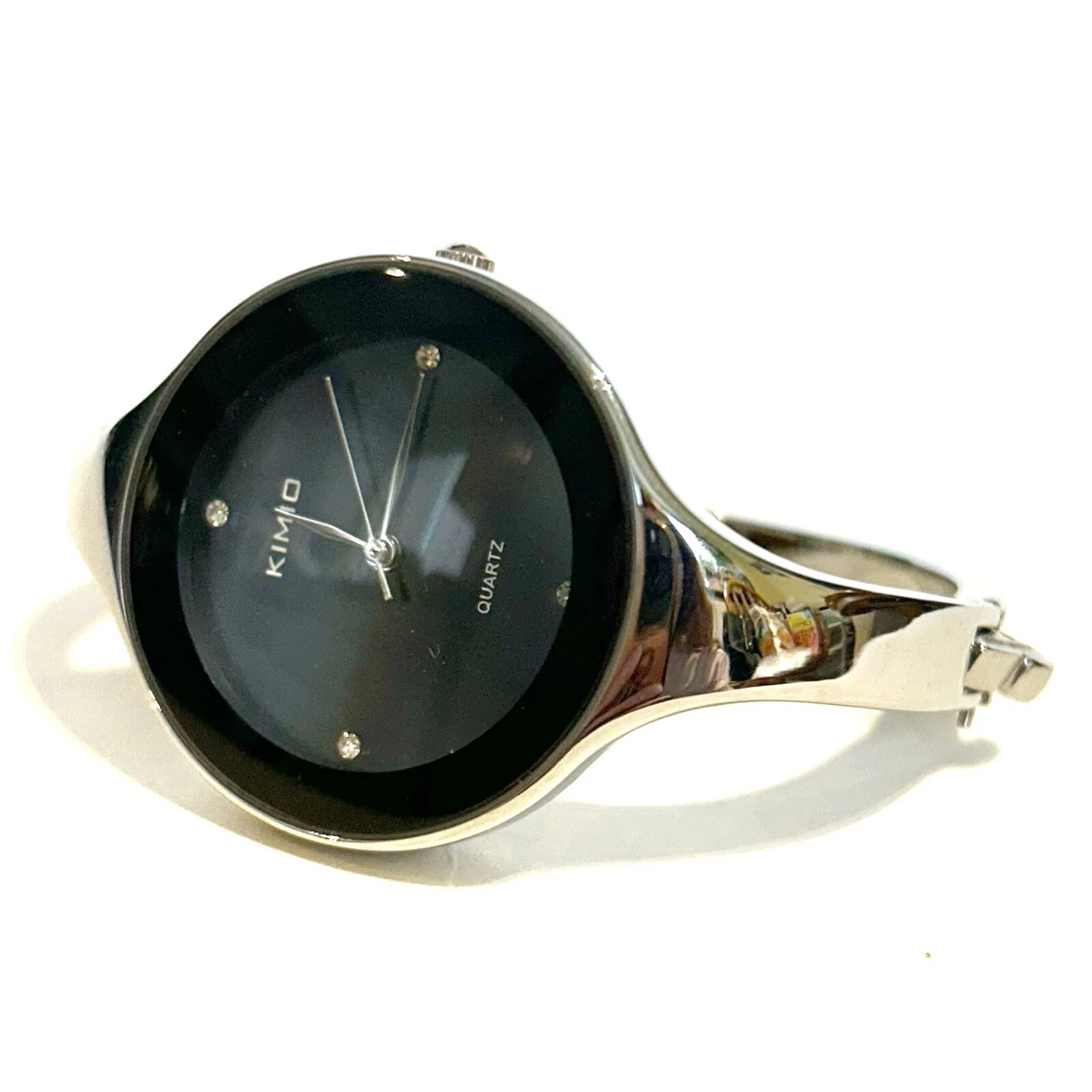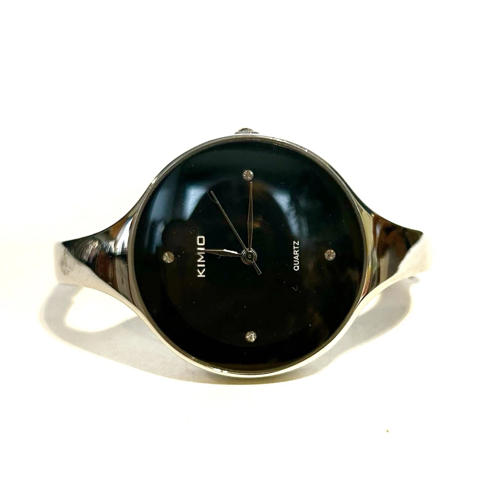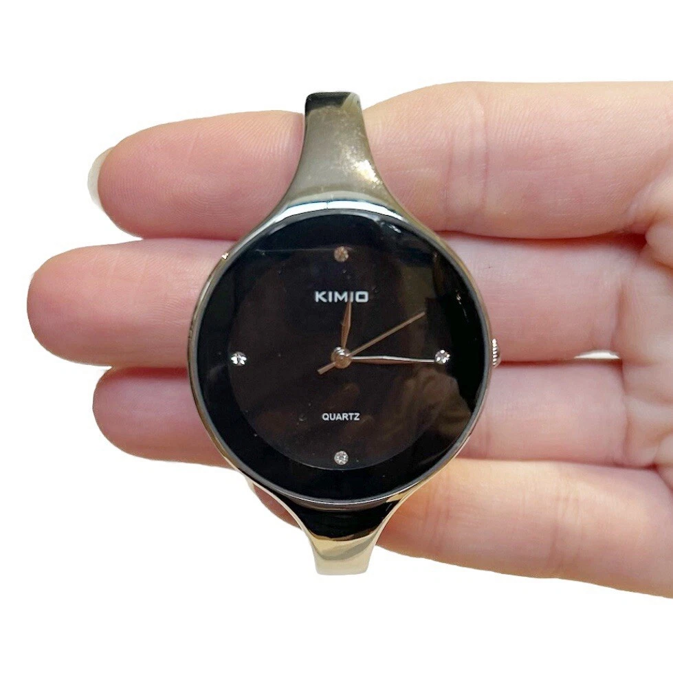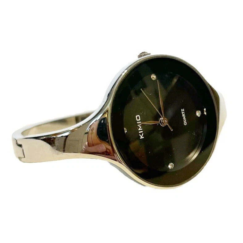 Kimio Quartz Silver Tone Metal Bangle Watch Black Face Rhinestones Steel Back