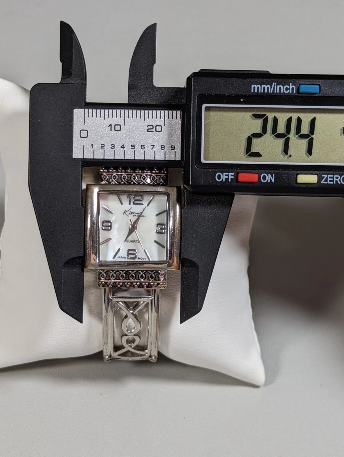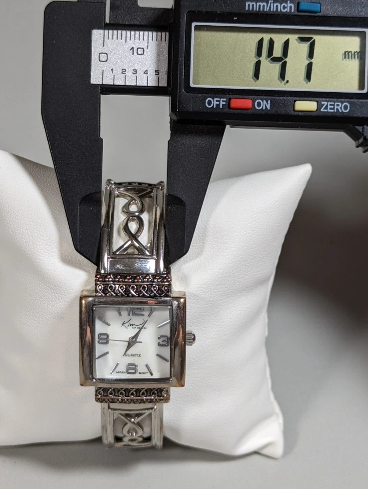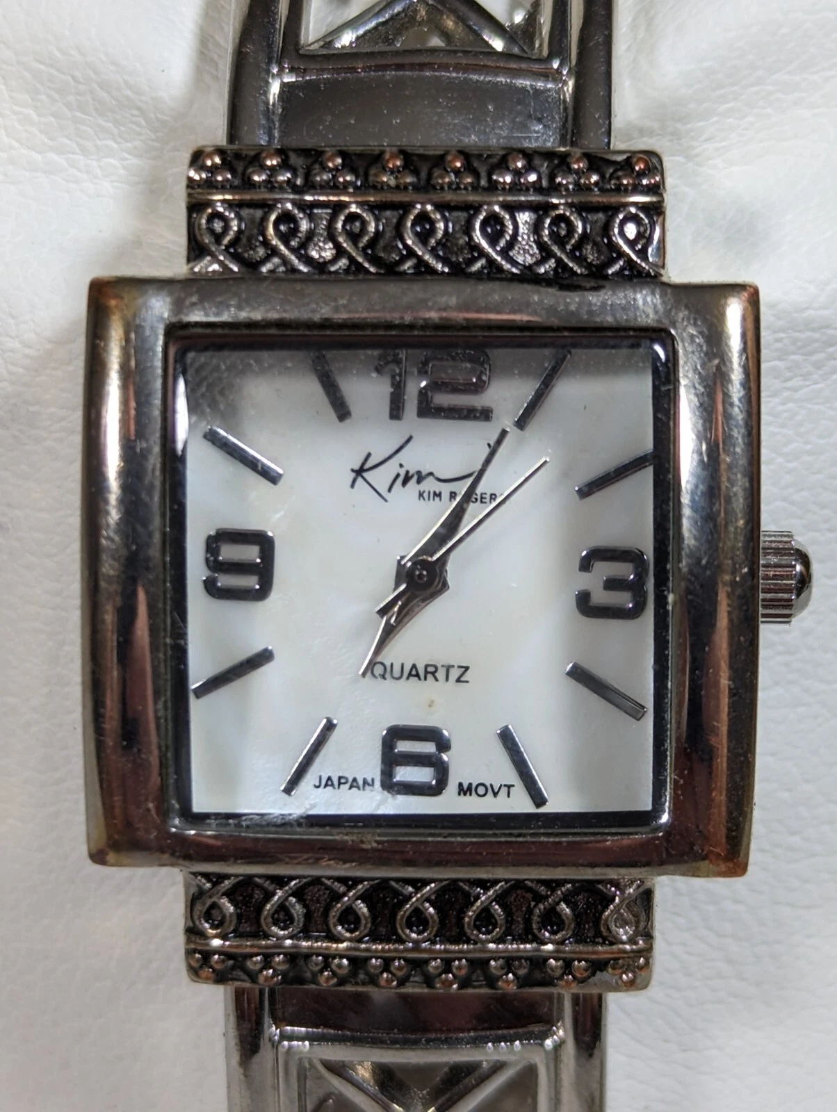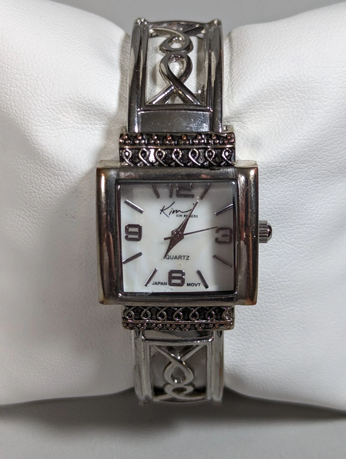 Kim Rogers Pearlized Dial Silver Tone Square Case Hinge Cut Out Band Watch 6 In
