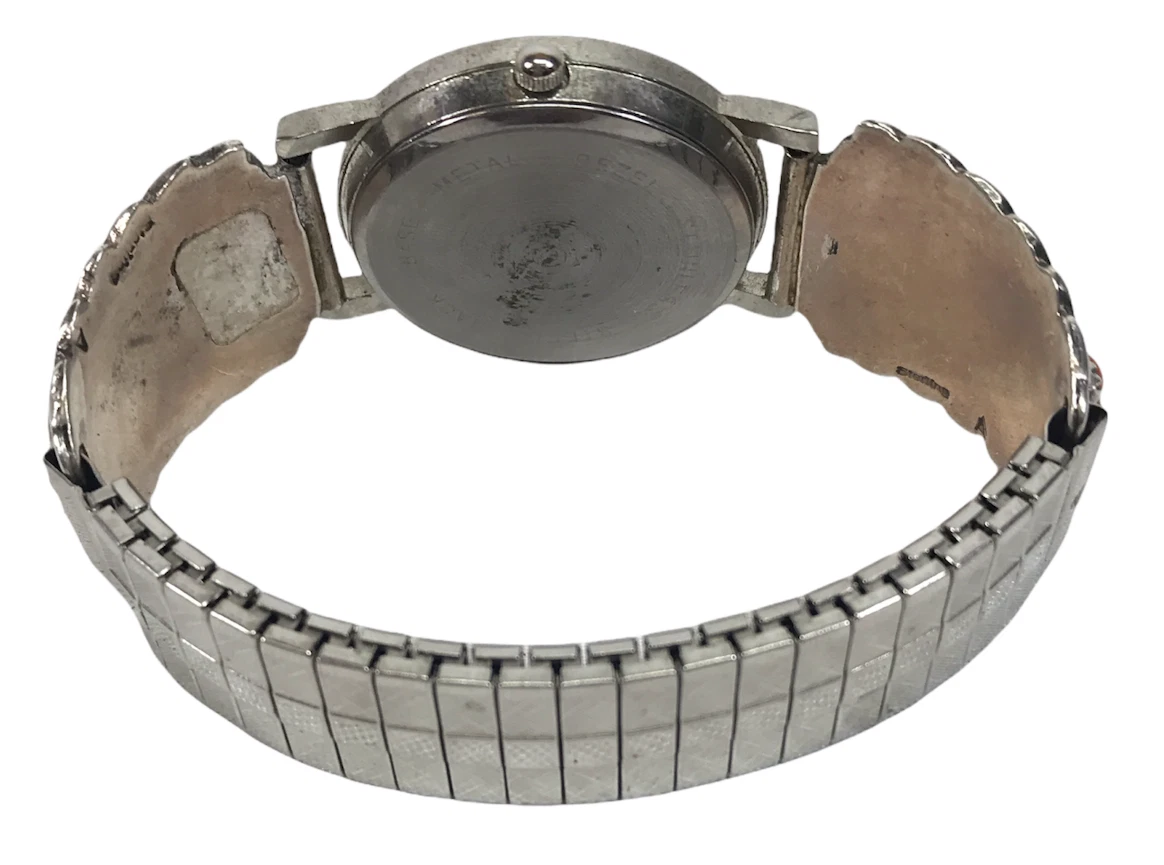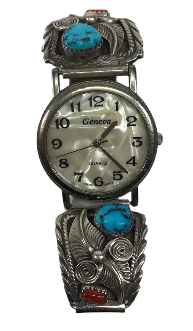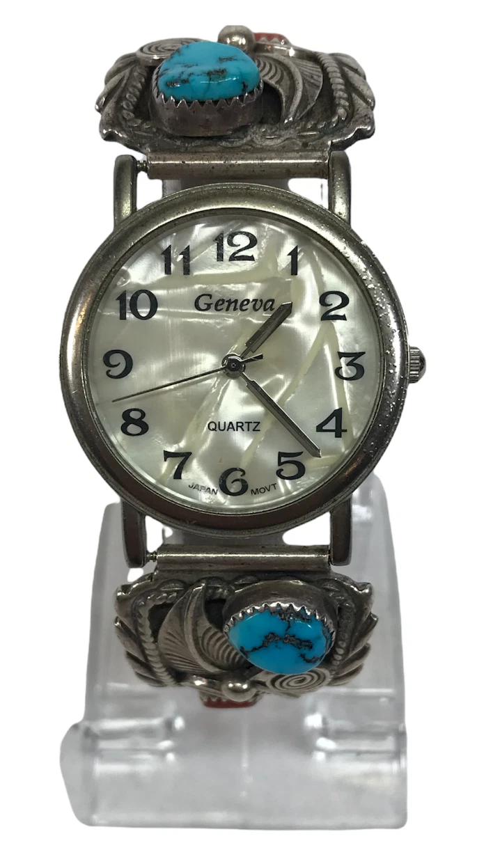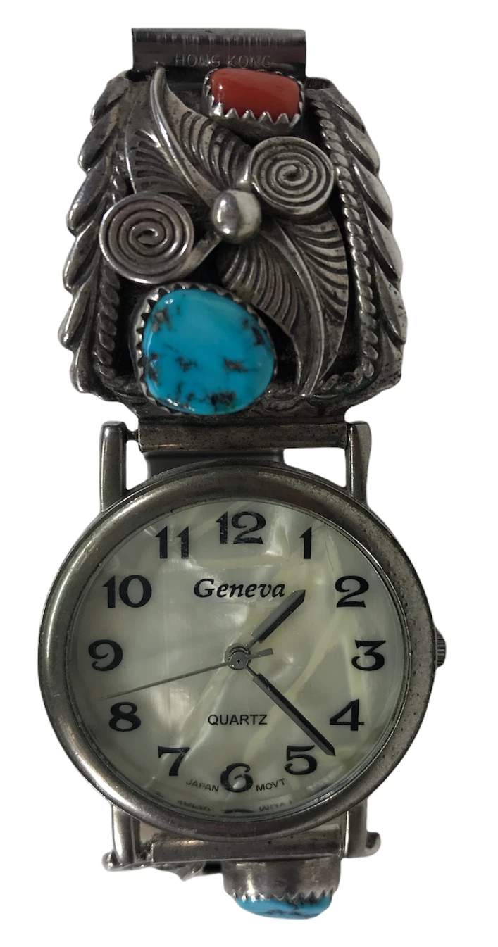 Vintage Navajo Sterling Silver Geneva Watch With Turquoise Stone Leafe Theme