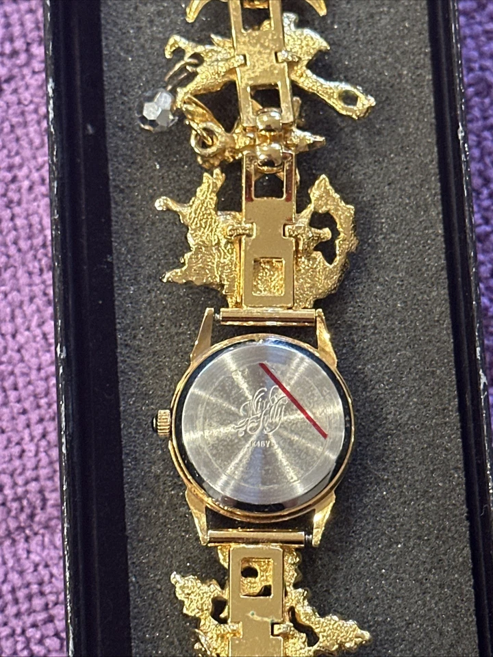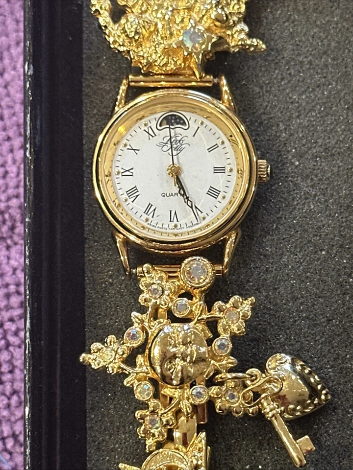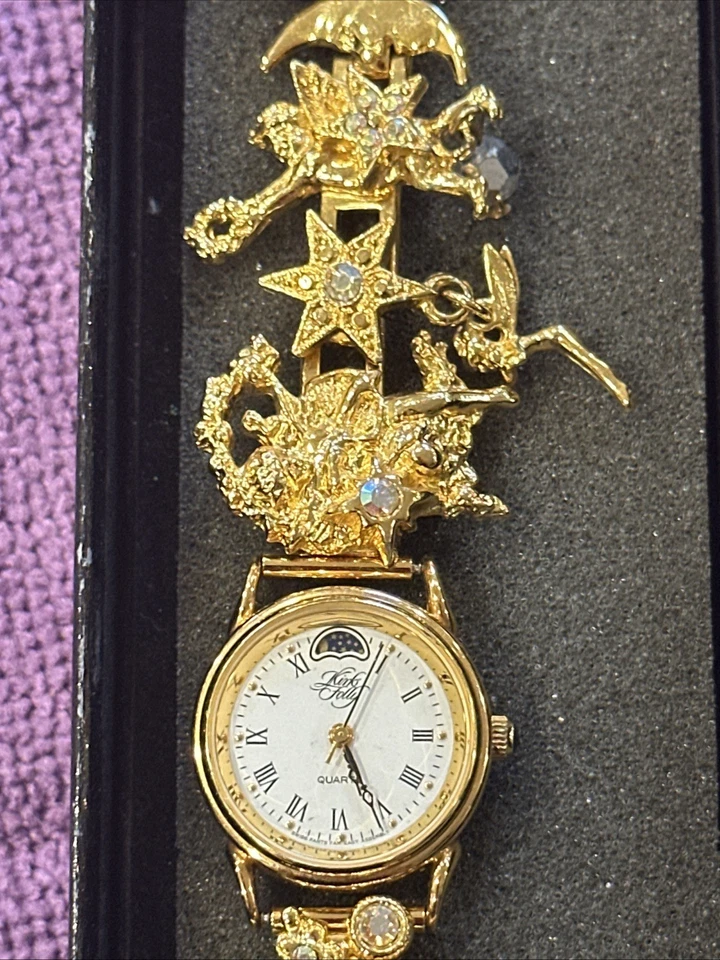 Vintage Kirks Folly Watch Gold Tone Moon Phase Celestial Charm Bracelet Working