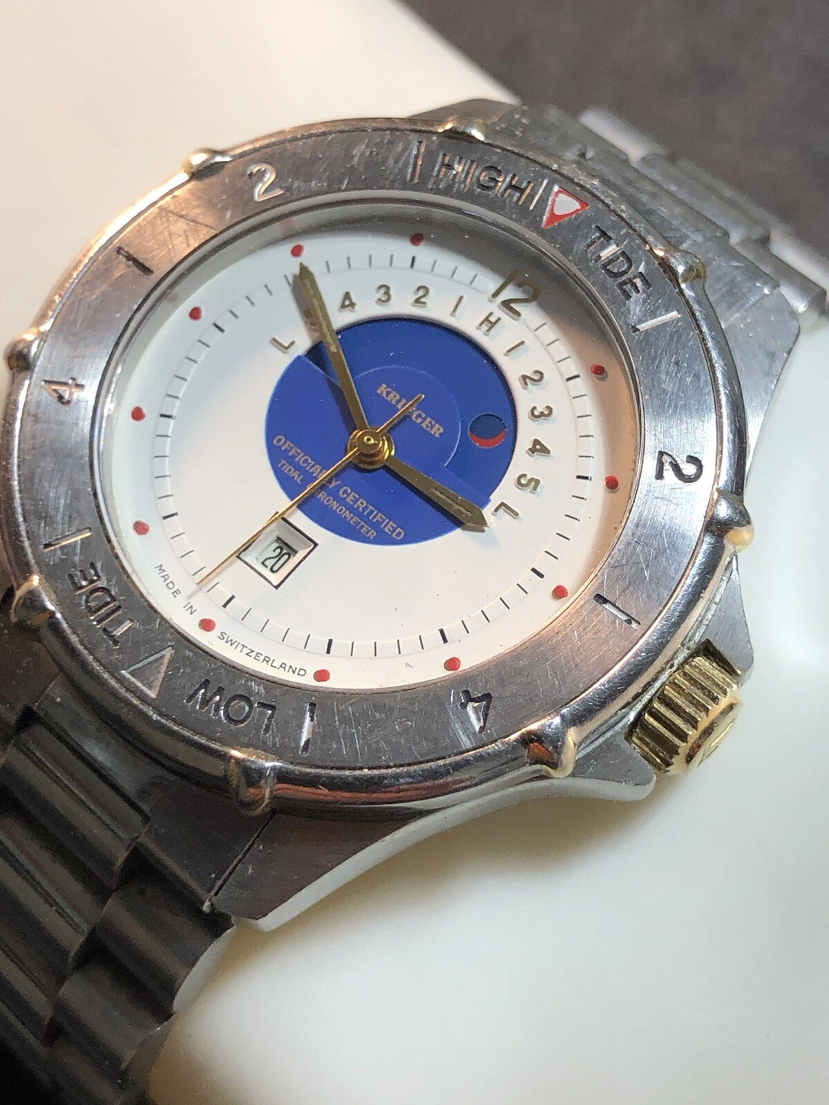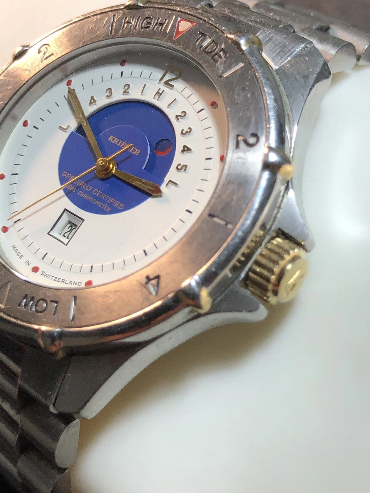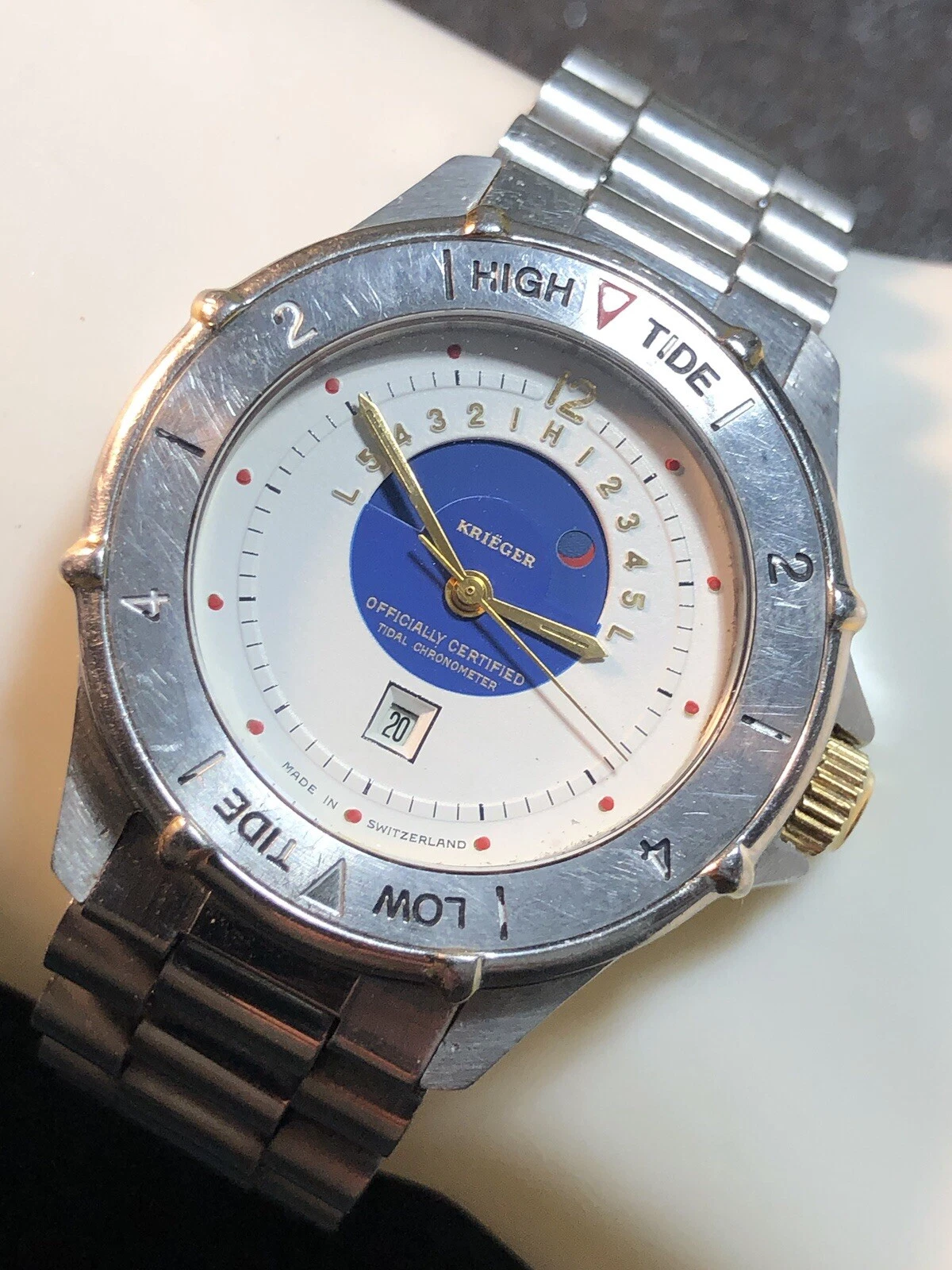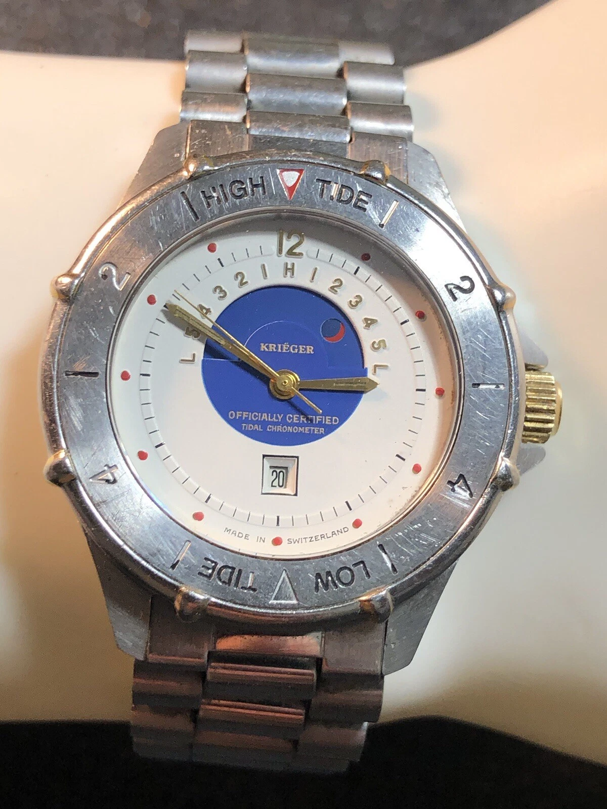 Rare Vintage Swiss KRIEGER Tidal Chronometer Watch WR200M W/Date Rotating Bezel