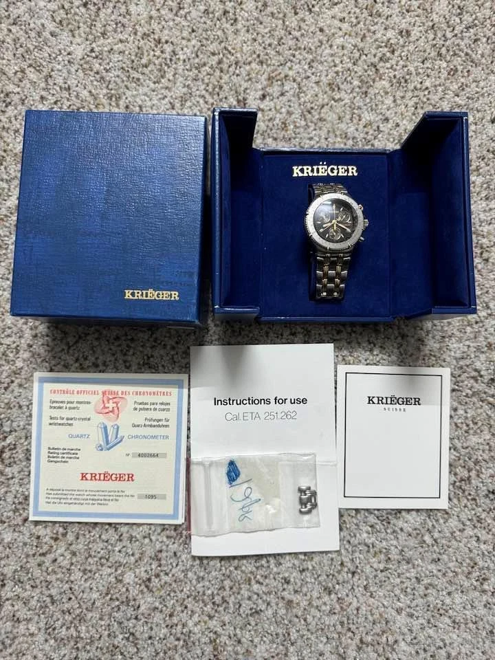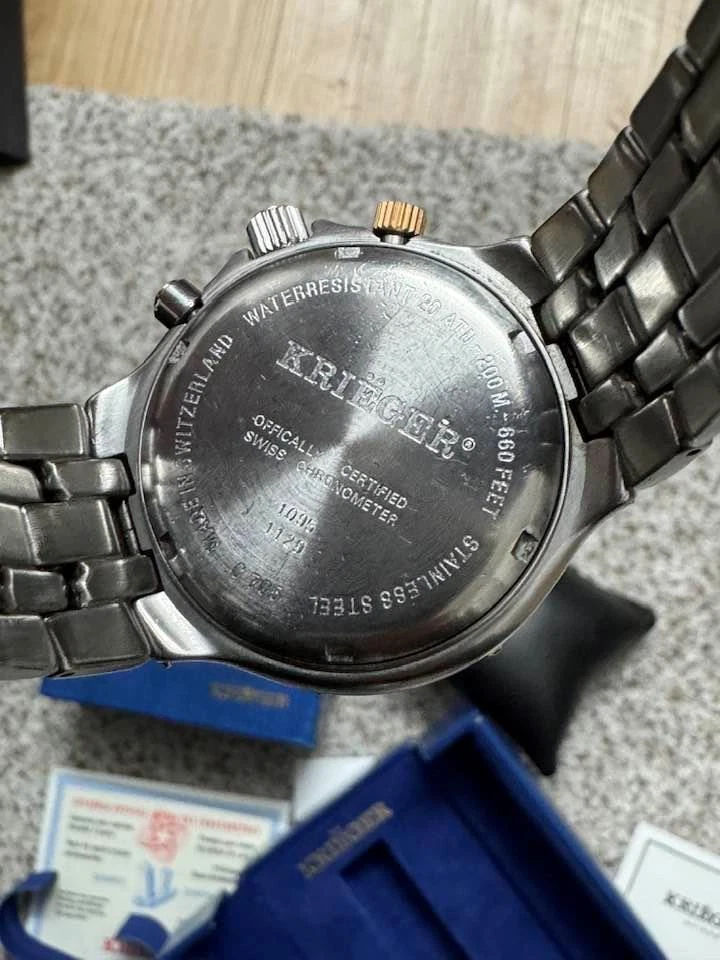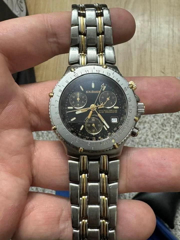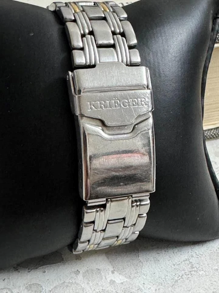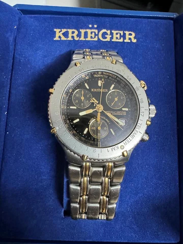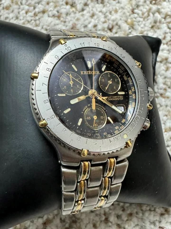 Krieger 18k Gold Stainless Steel Chronometer 40mm Swiss Quartz Black Dial Rare
