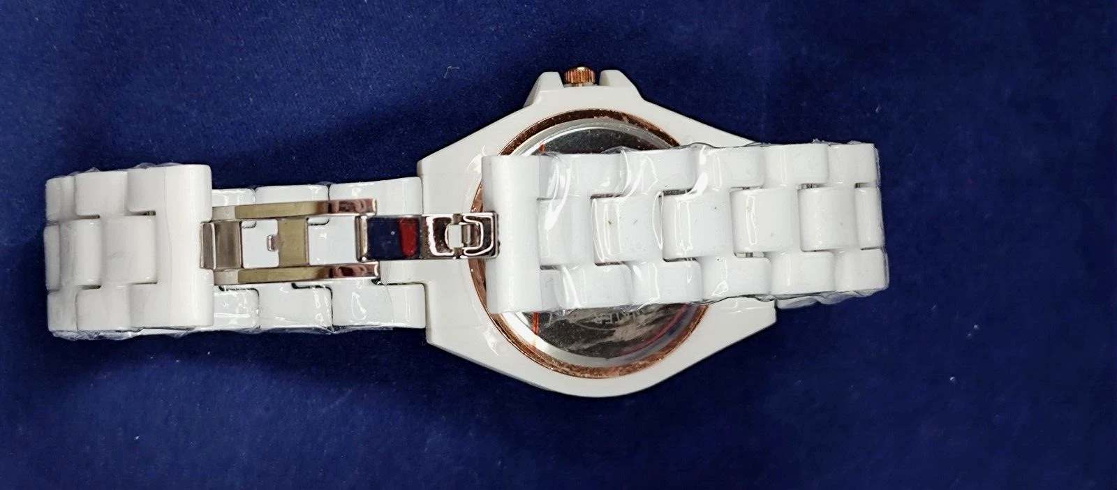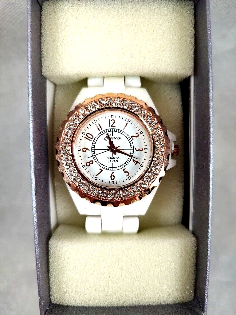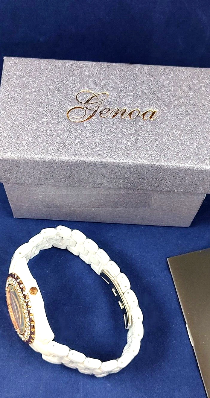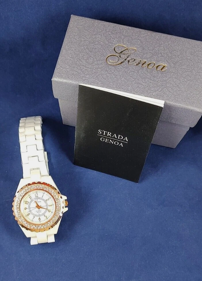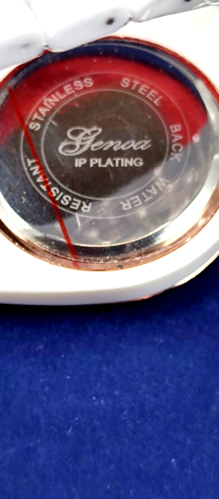 Genoa Womens Watch CZ Rose Gold Look White Band Quartz Japan Water Resistant NIB