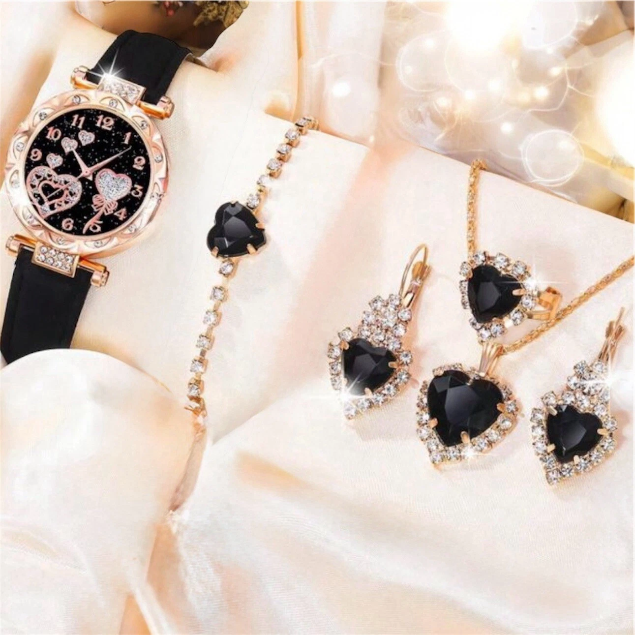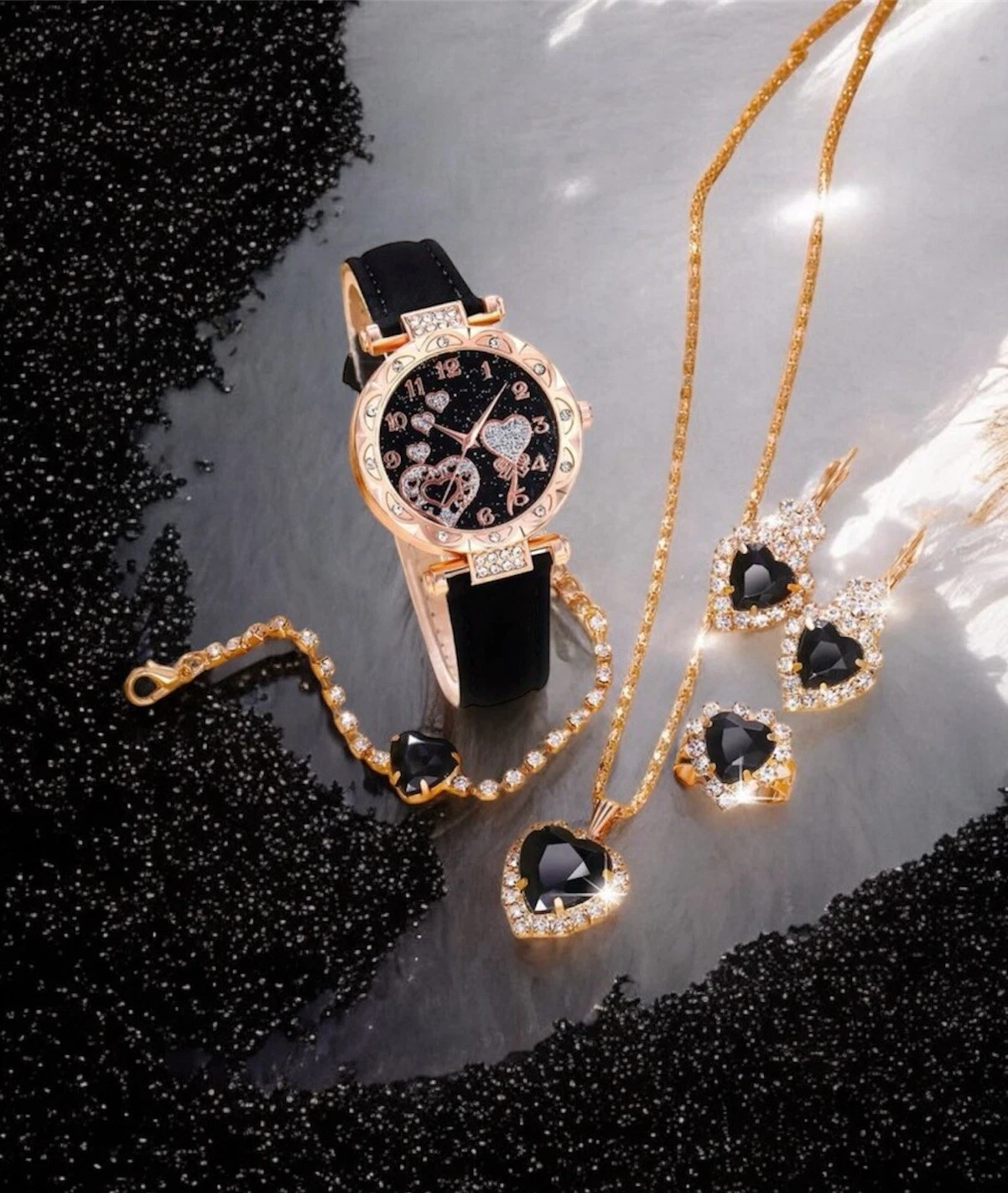 Gold Watch Jewellery Set Includes 5 Items Watch Earrings Bracelet Necklace Ring