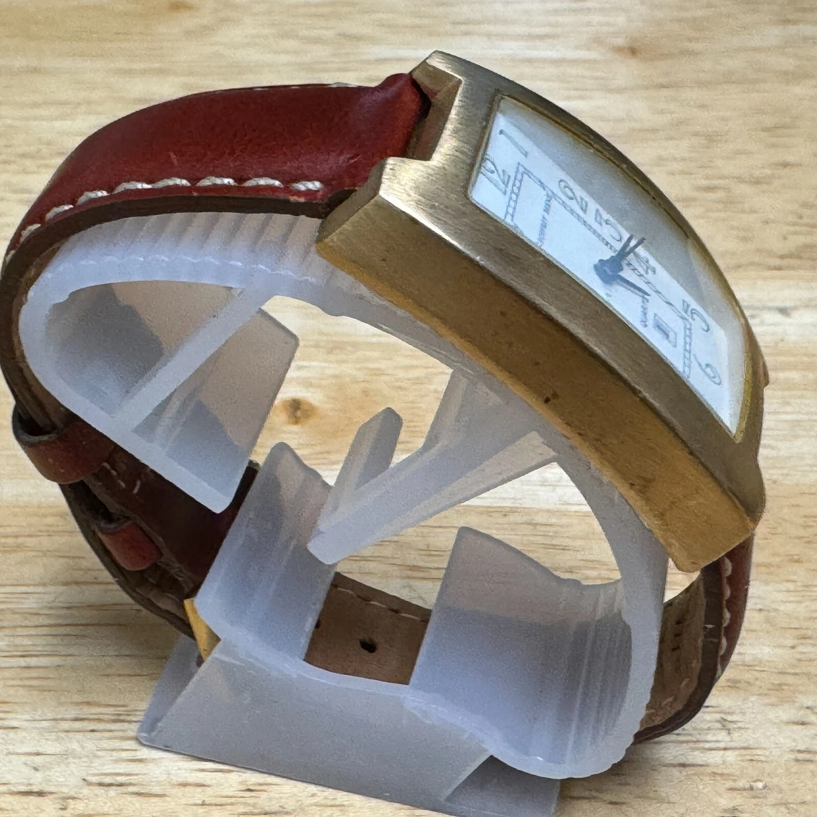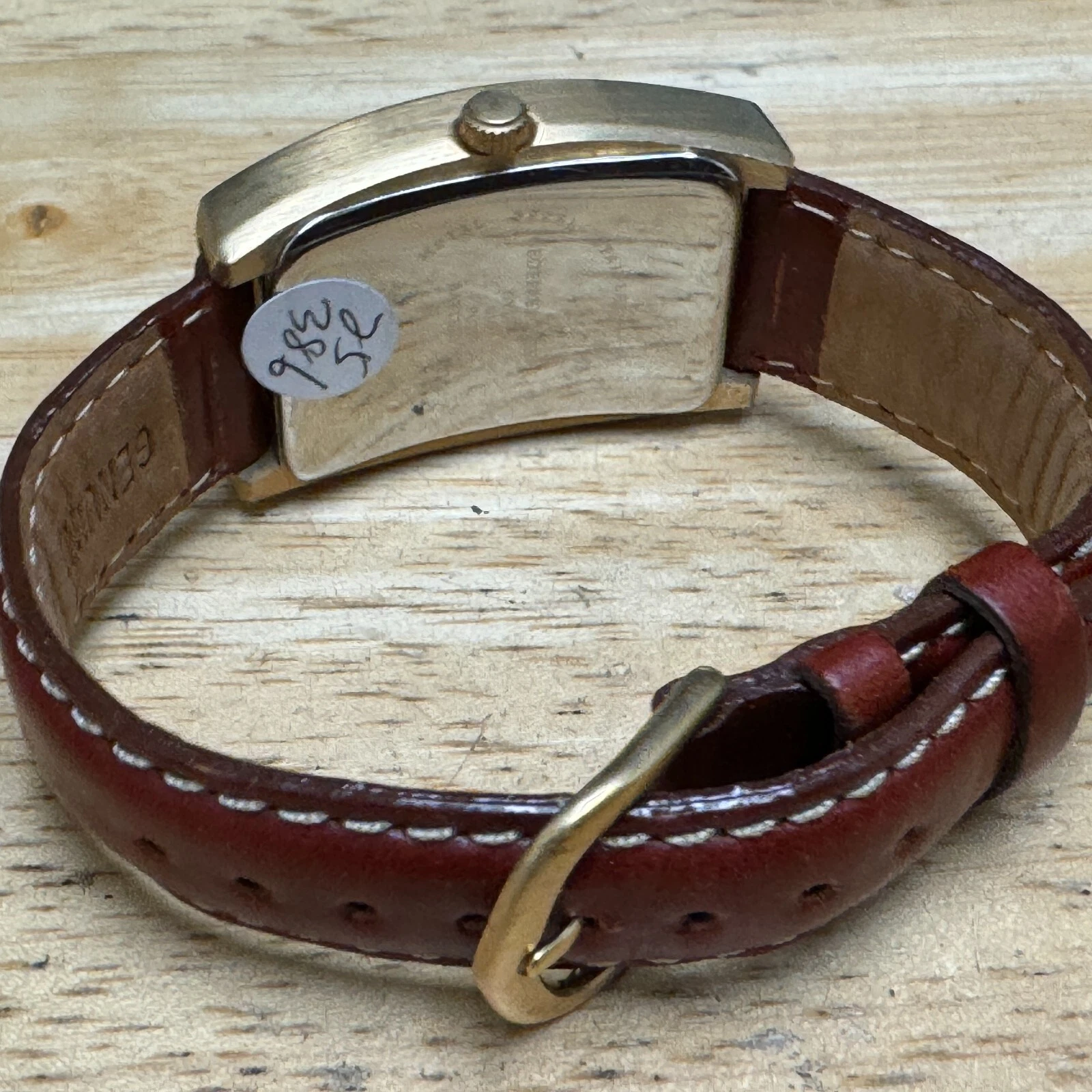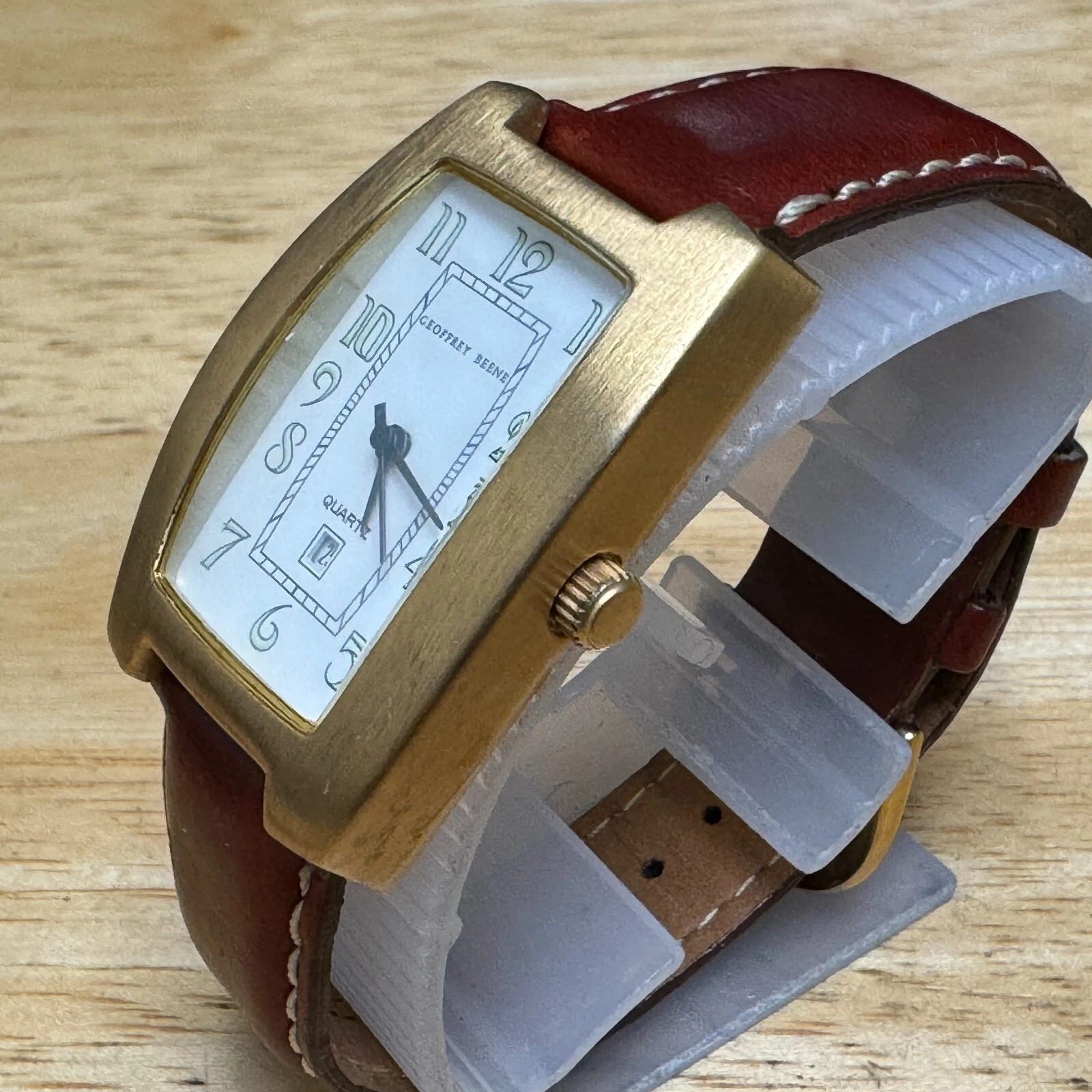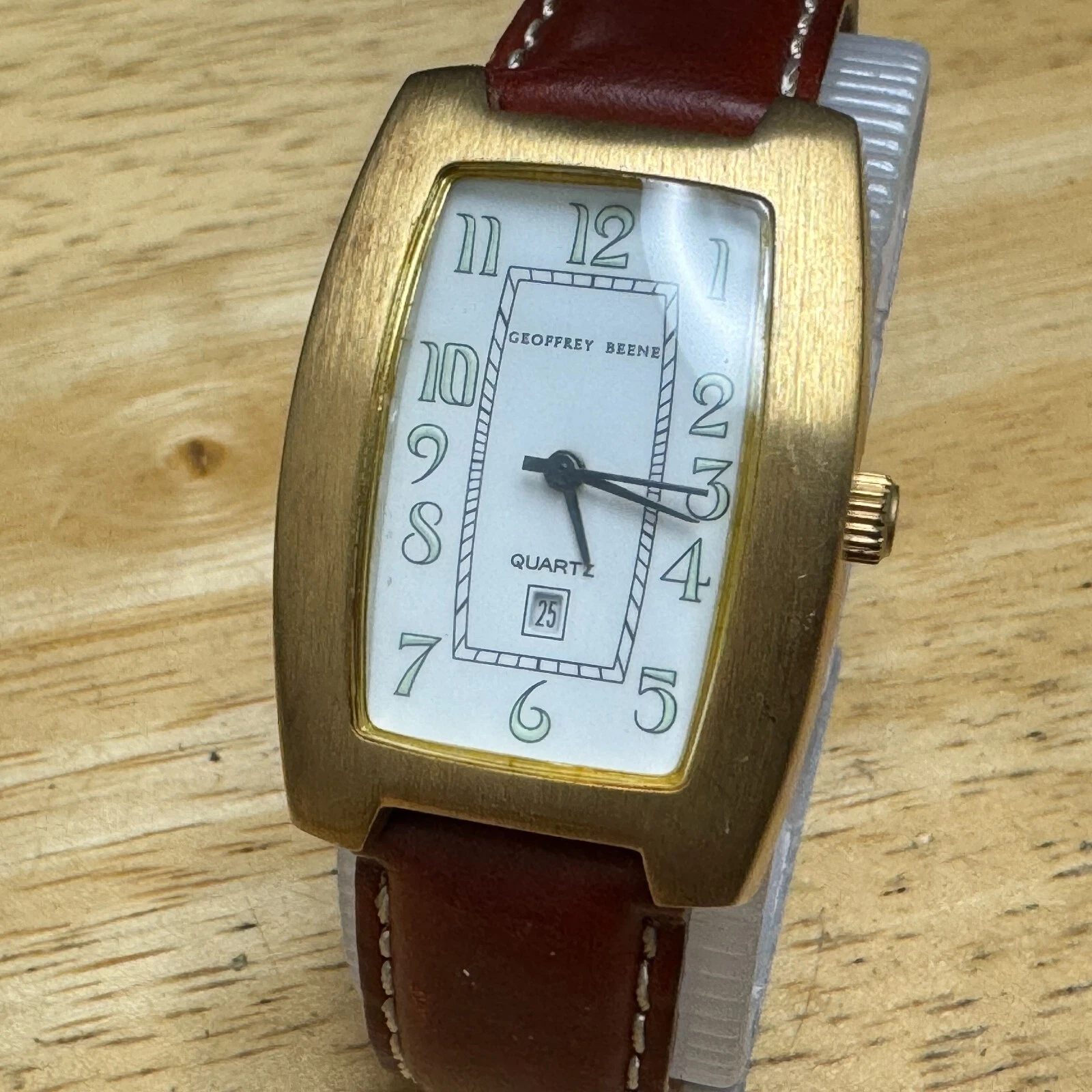 Geoffrey Beene Quartz Watch Men Gold Tone Curved Long Barrel Leather New Battery