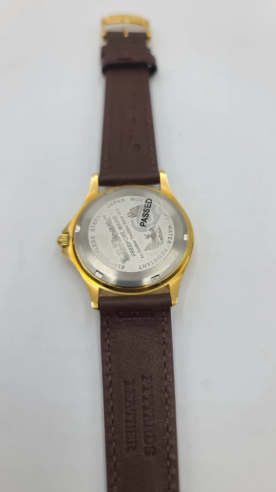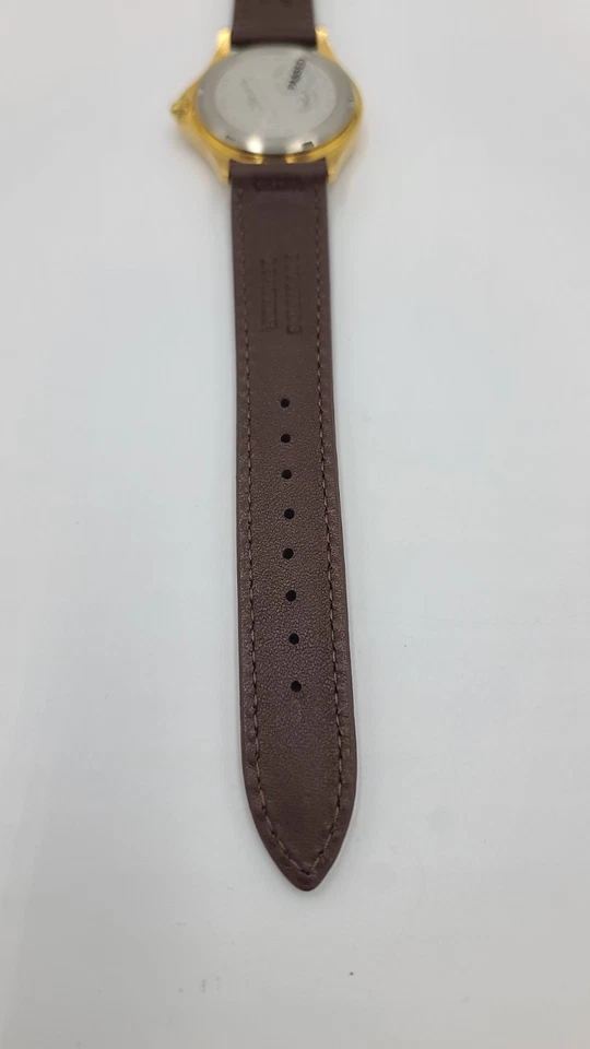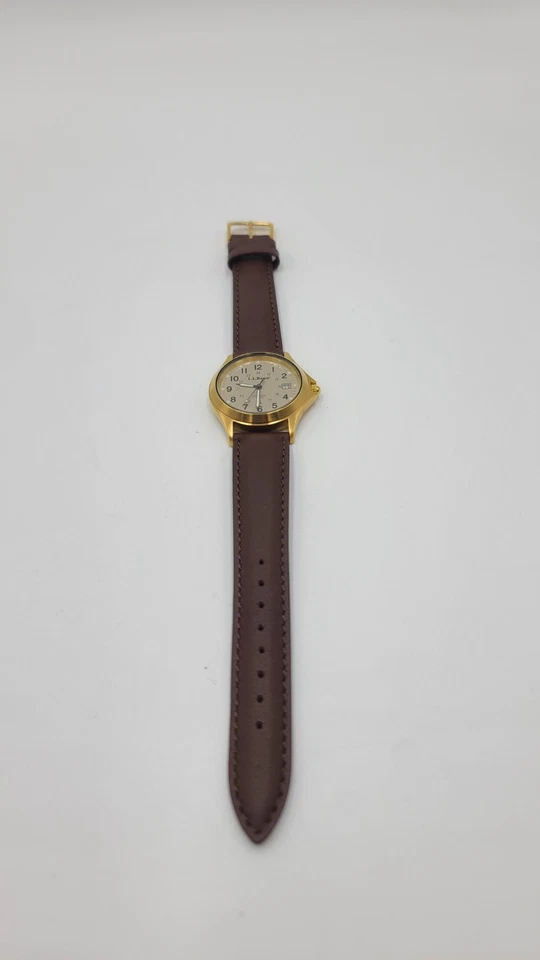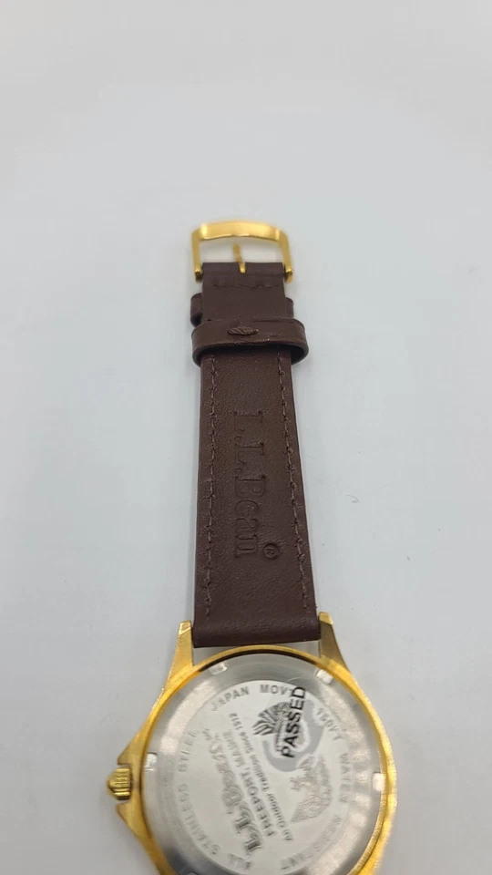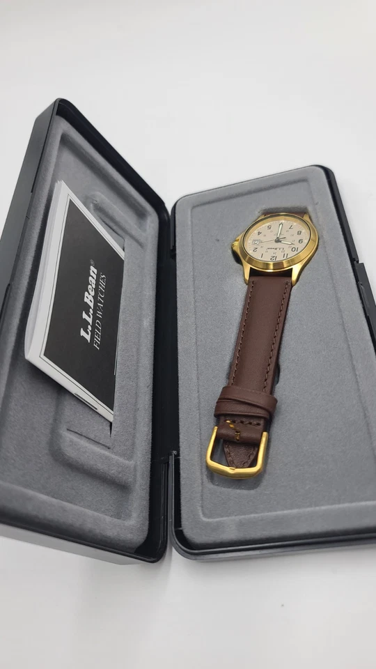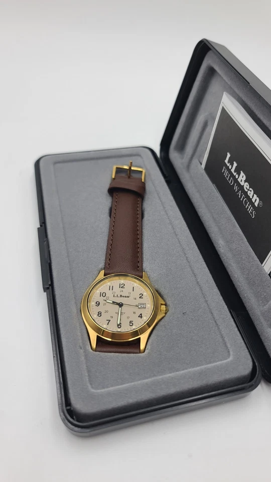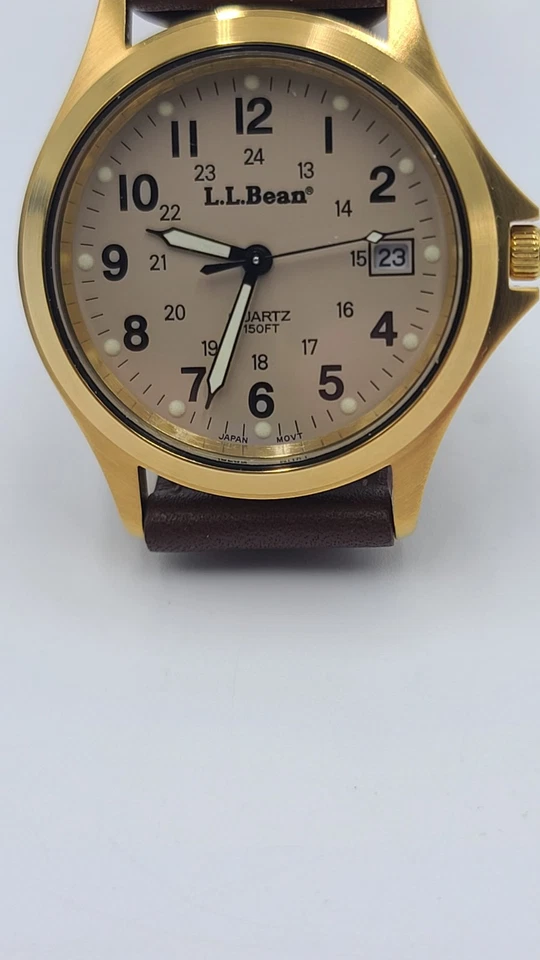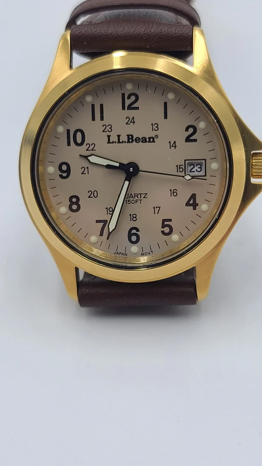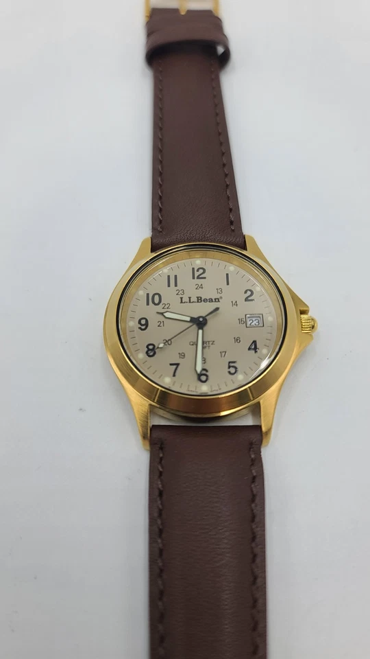 LL Bean Field Watch Watch Men Gold Tone Date Brown Leather Band New Battery