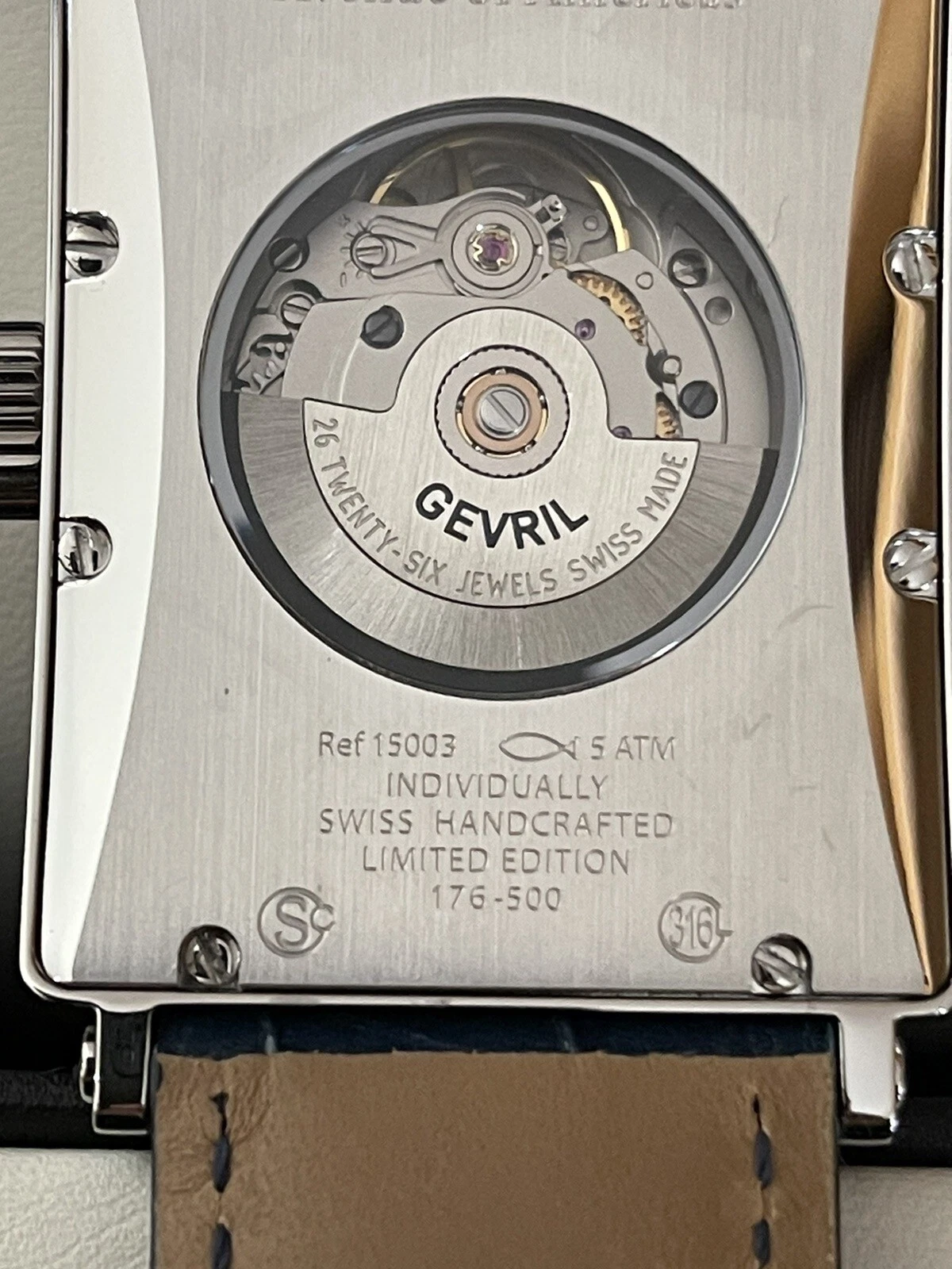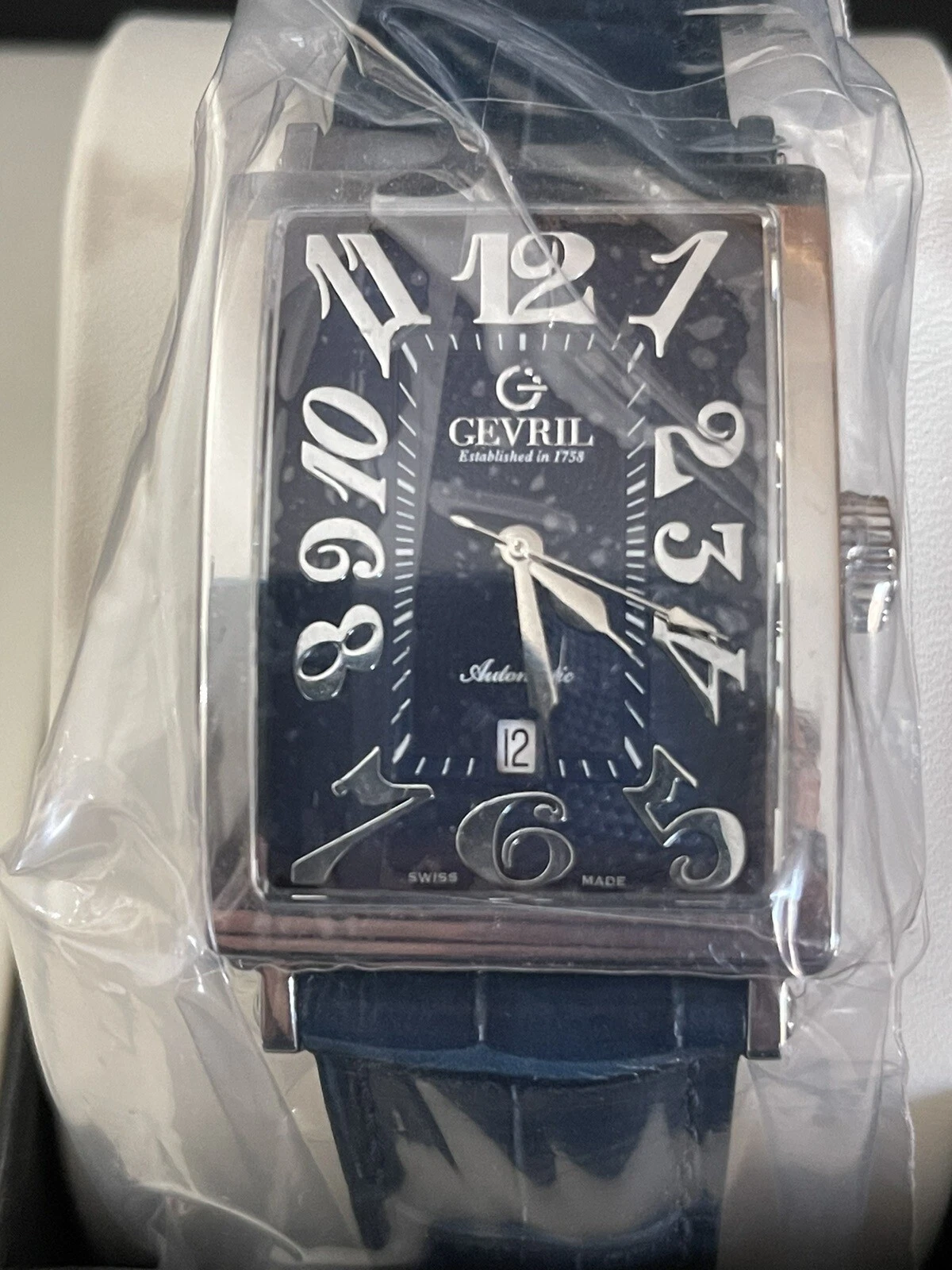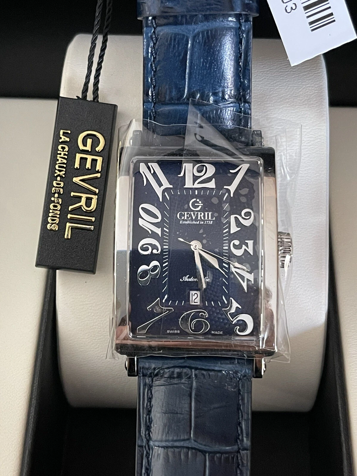 Gevril Avenue of Americas 44mm Silver Stainless Steel Case, Blue Leather Band, Men's Wristwatch - (15003-1)