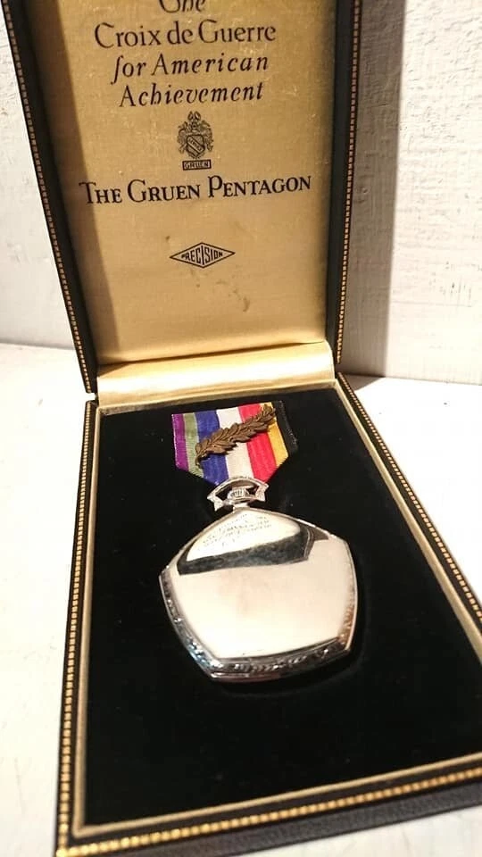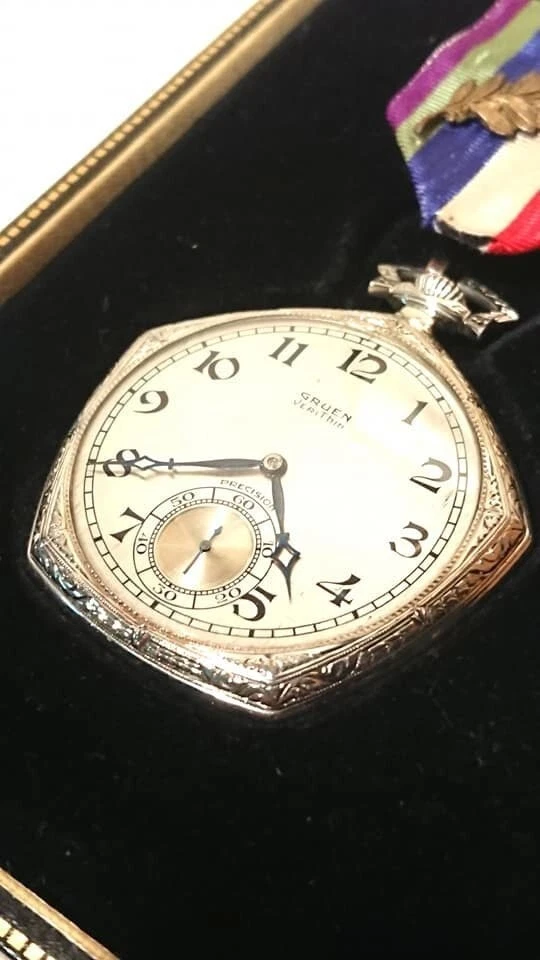 RARE 14K WHITE GOLD THE GRUEN PENTAGON VERITHIN 17J POCKET WATCH ORIGINAL CASE