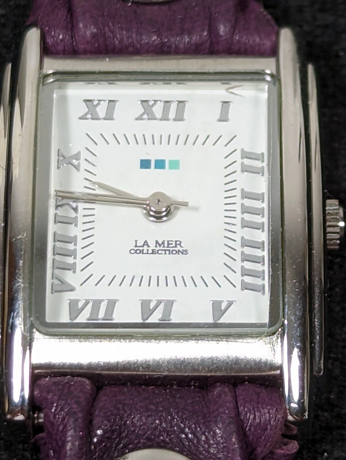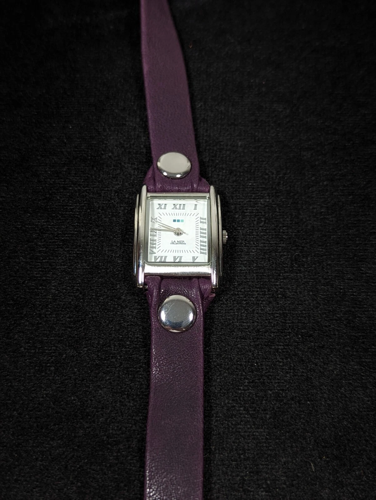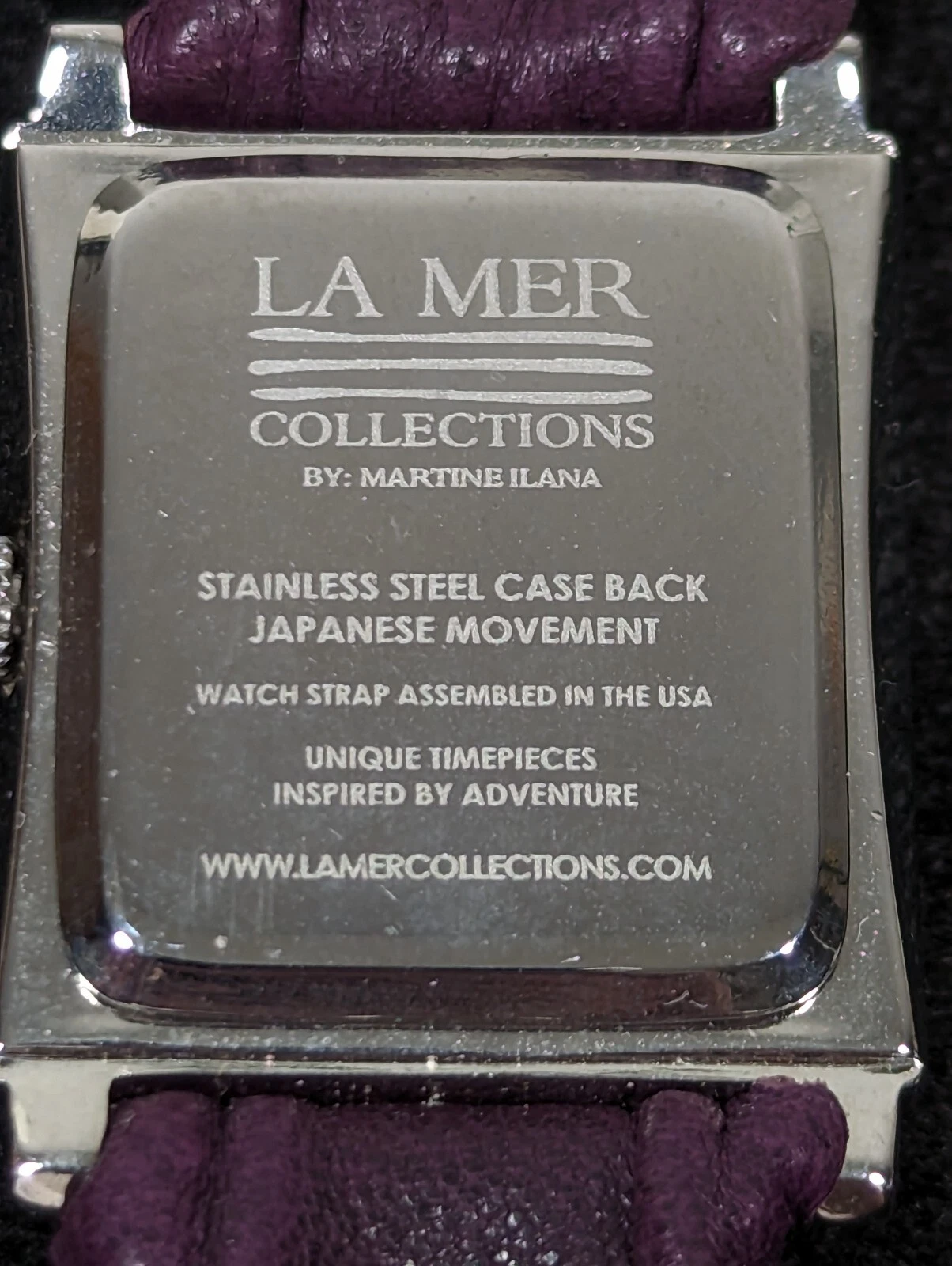La Mer Collections White Dial Silver Tone Rectangle Case Pruple Wrap Band Watch