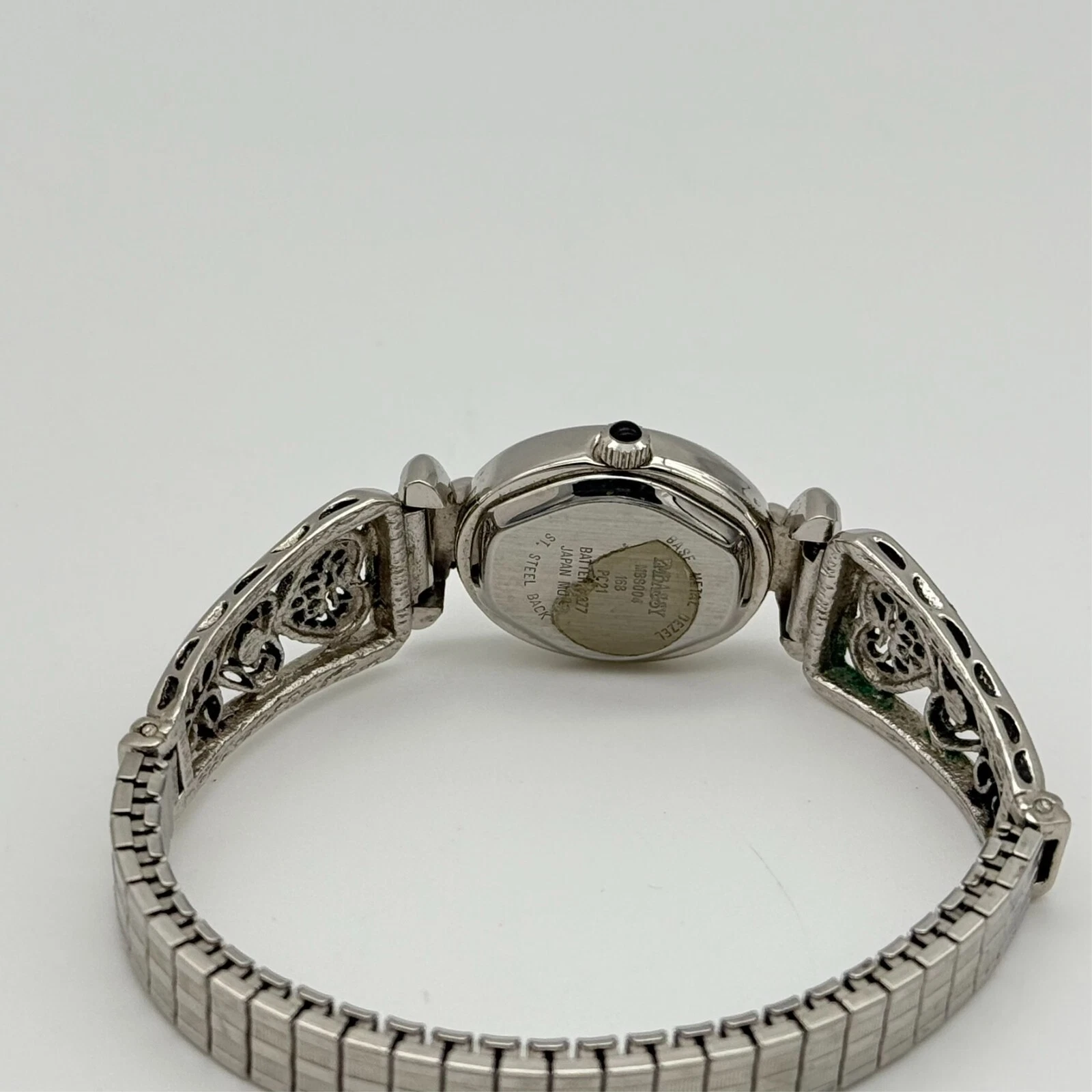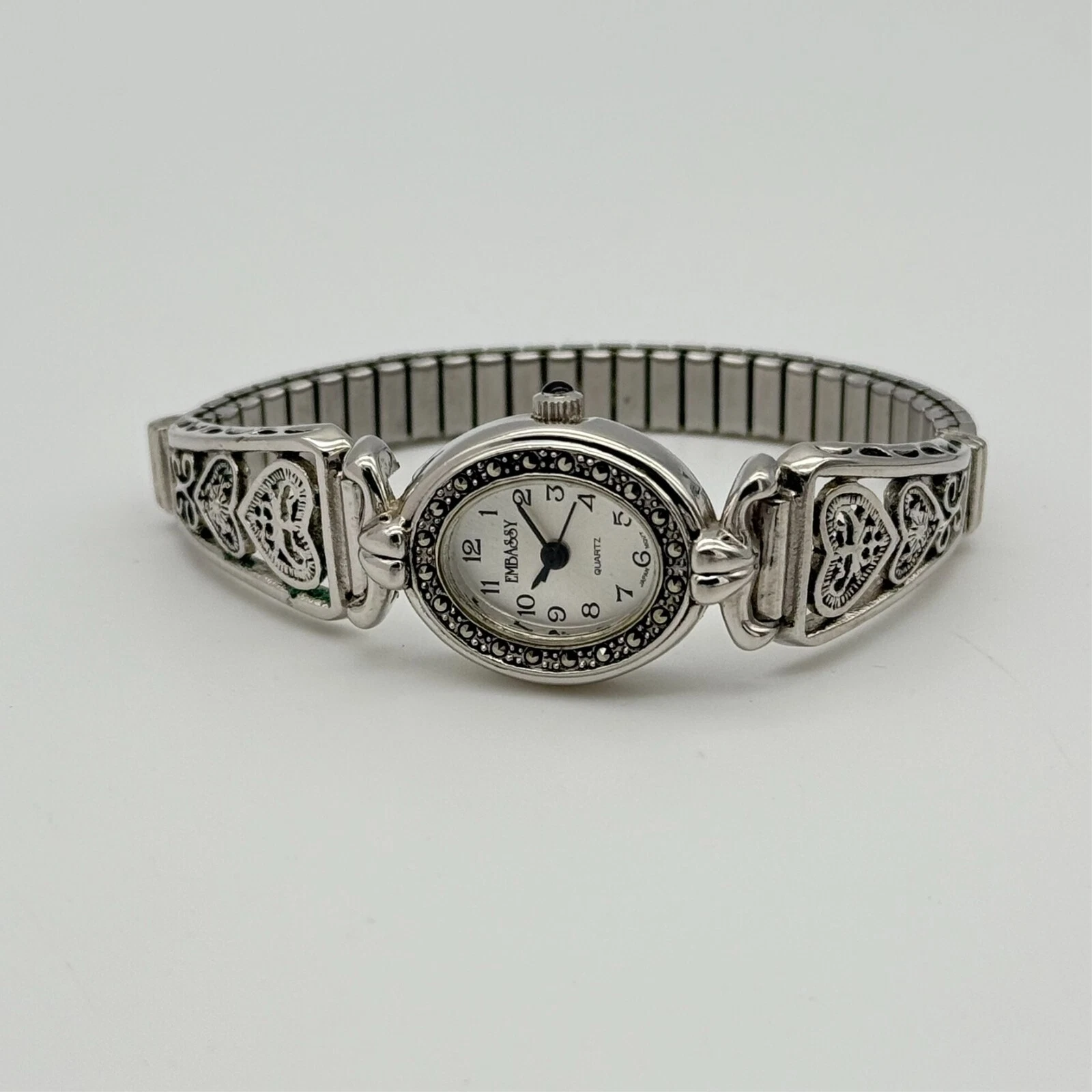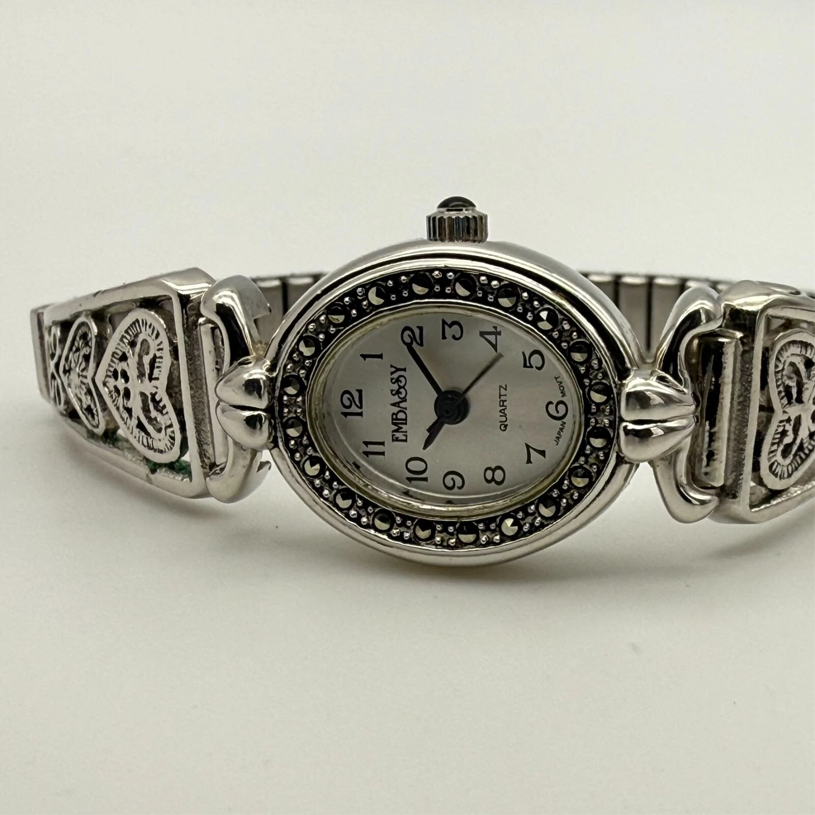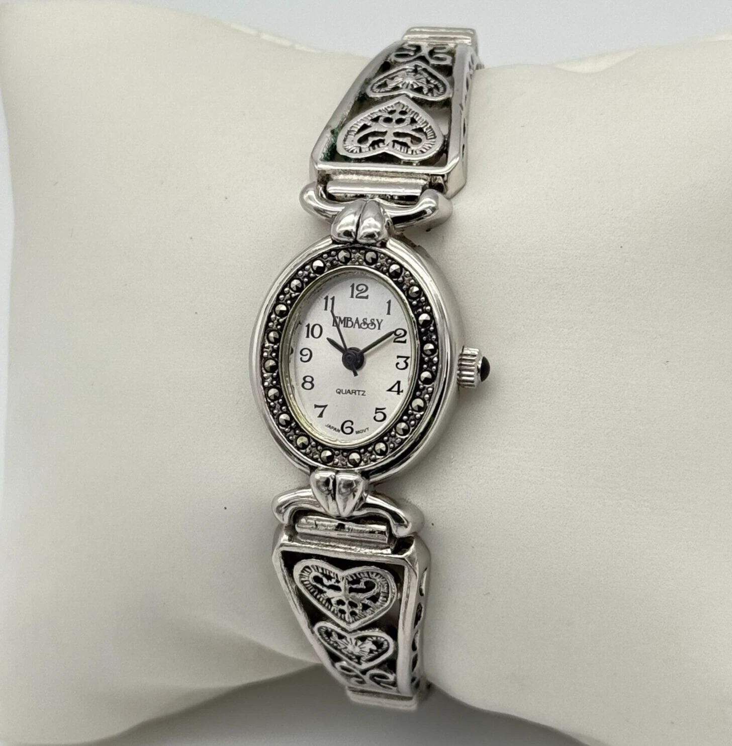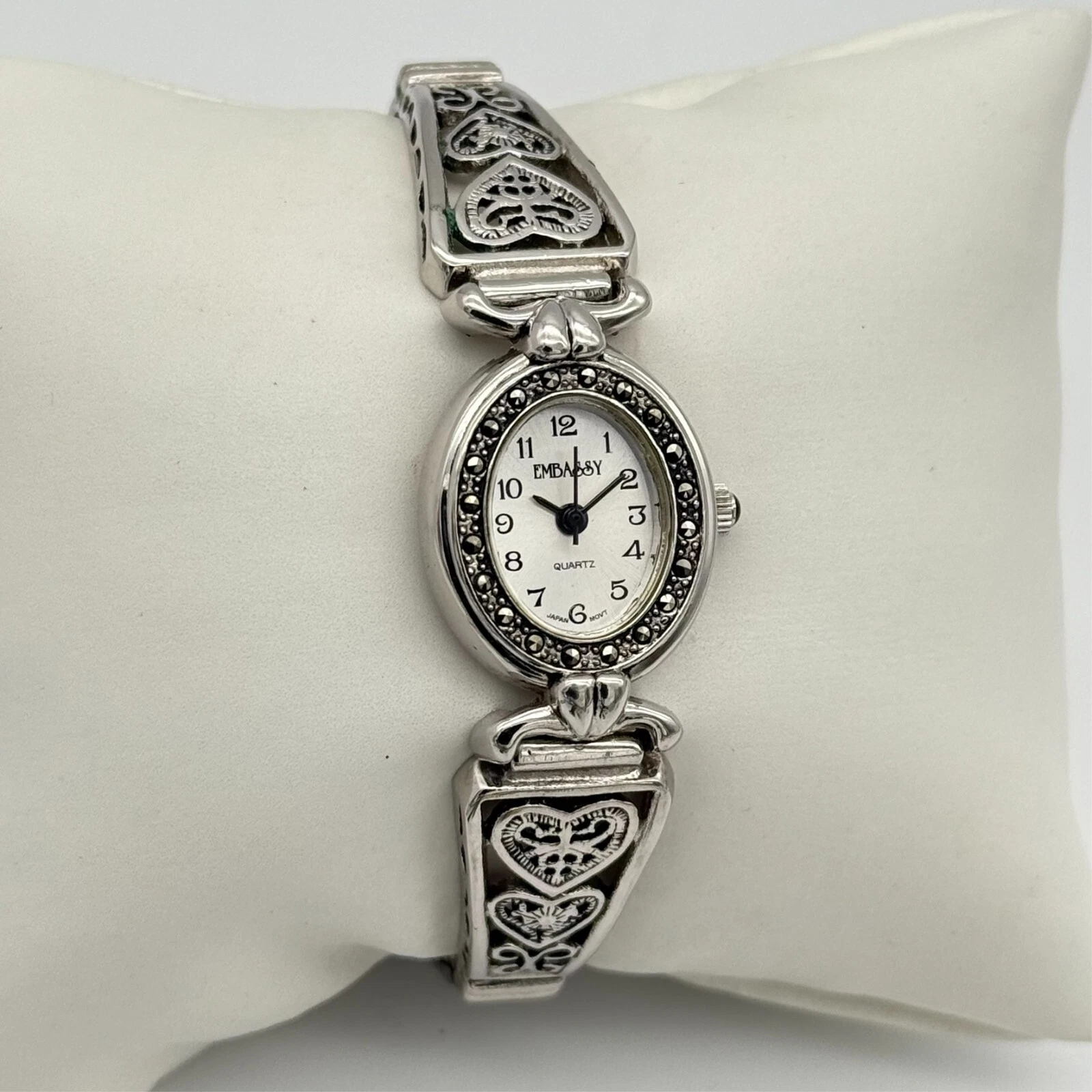Women's EMBASSY Silver Tone & Marcasite, Heart Bracelet Watch, 19mm, Flex Band