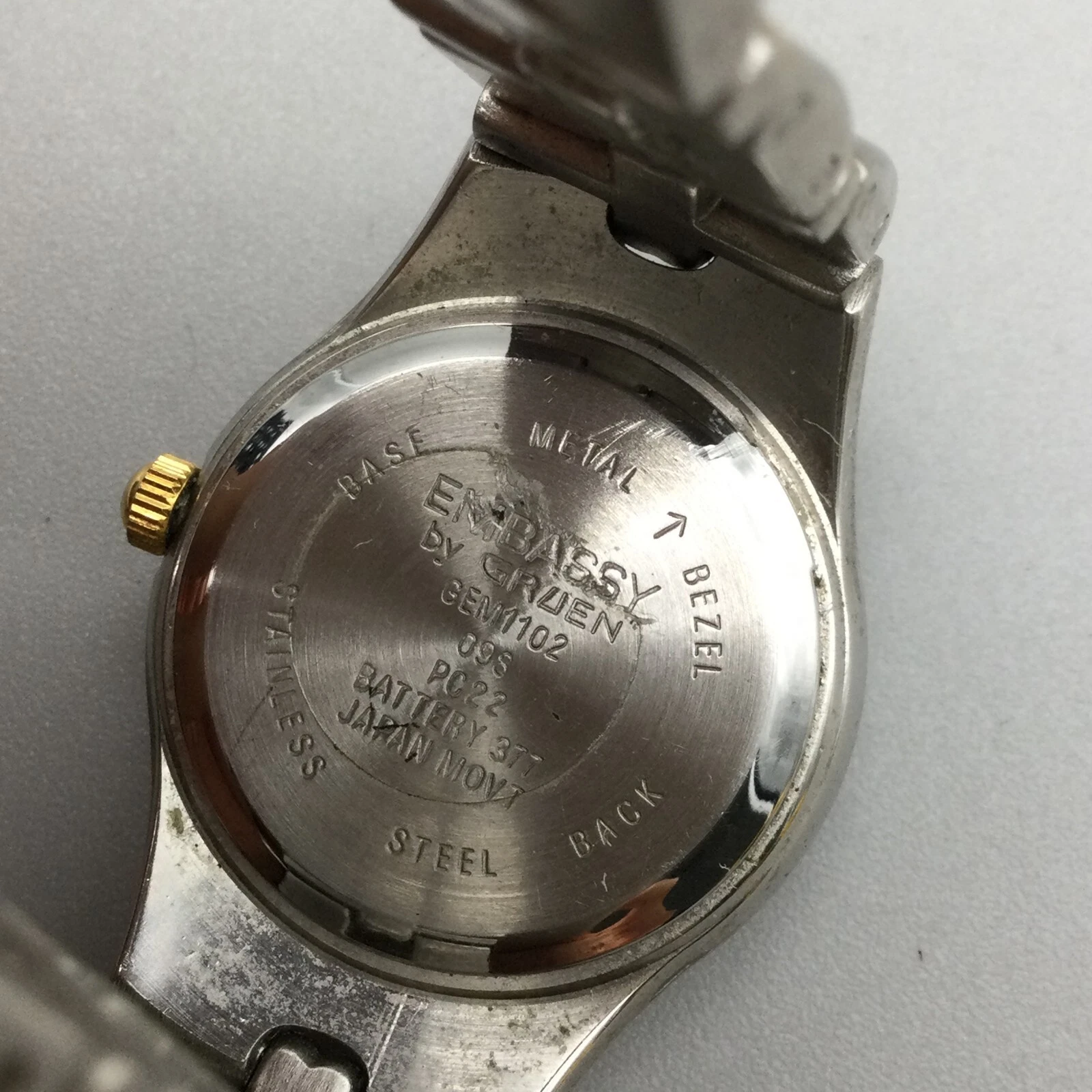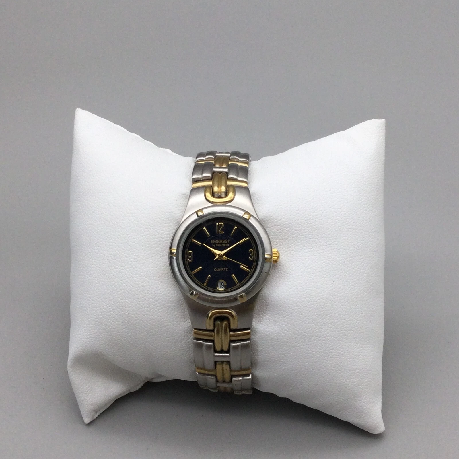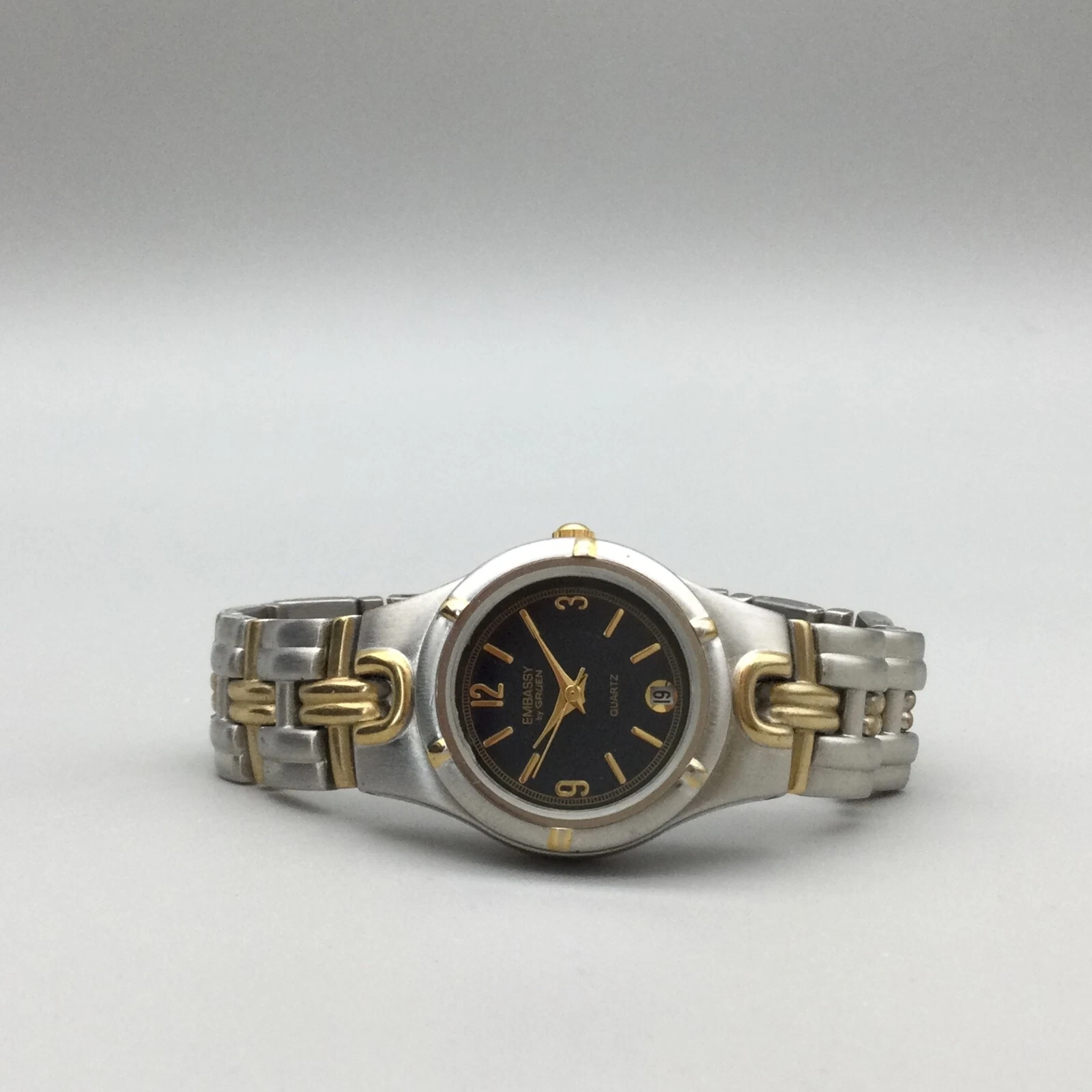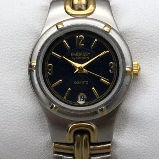 Embassy Gruen Watch Women 25mm Silver Gold Tone Black Dial New Battery 6.25"