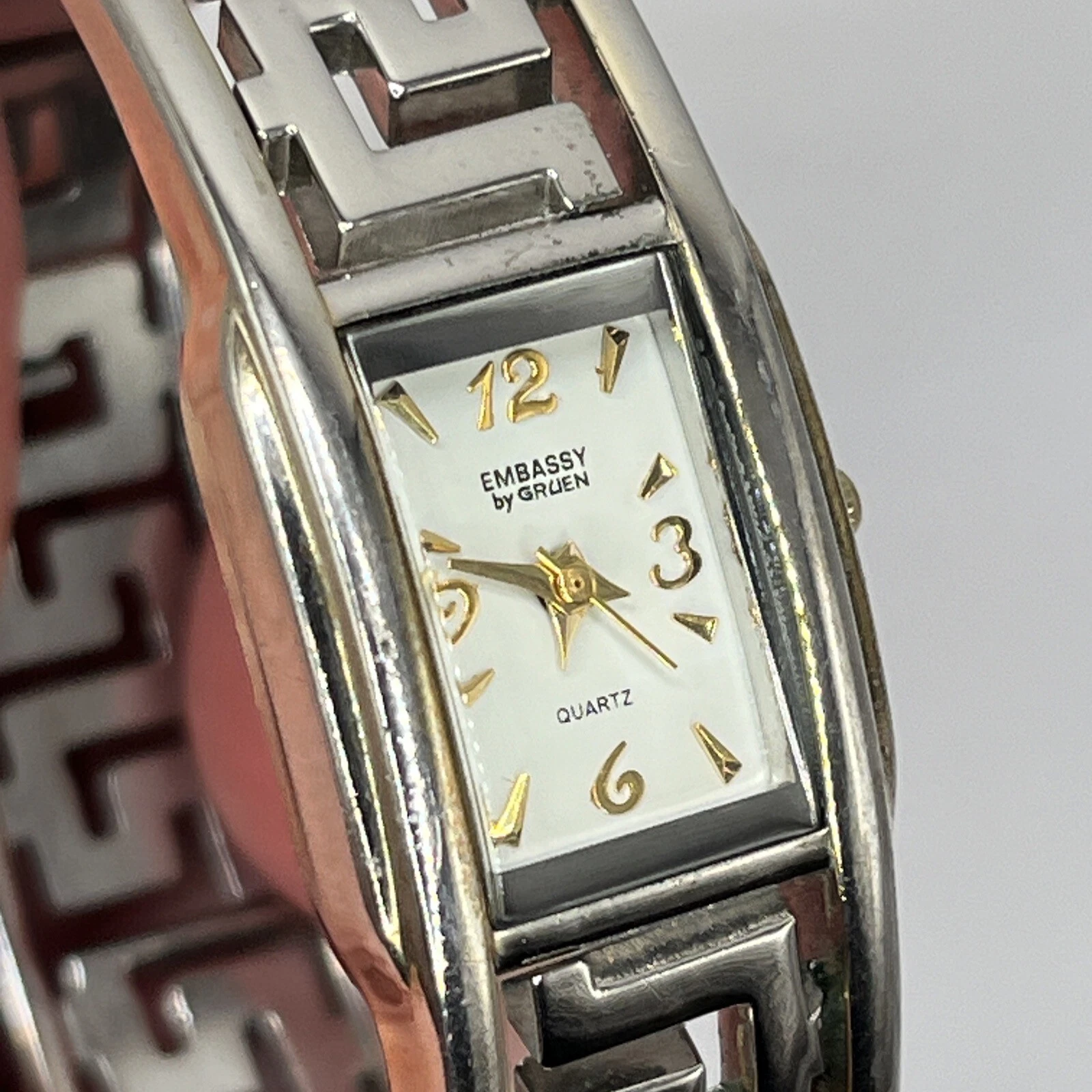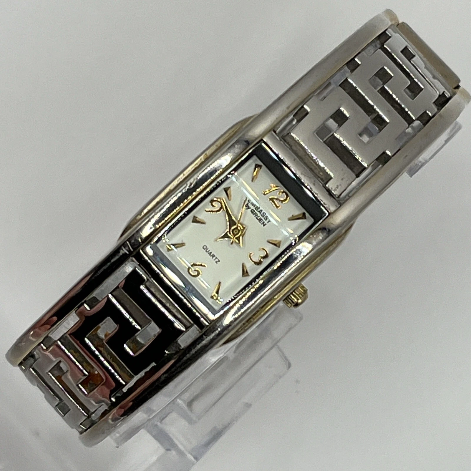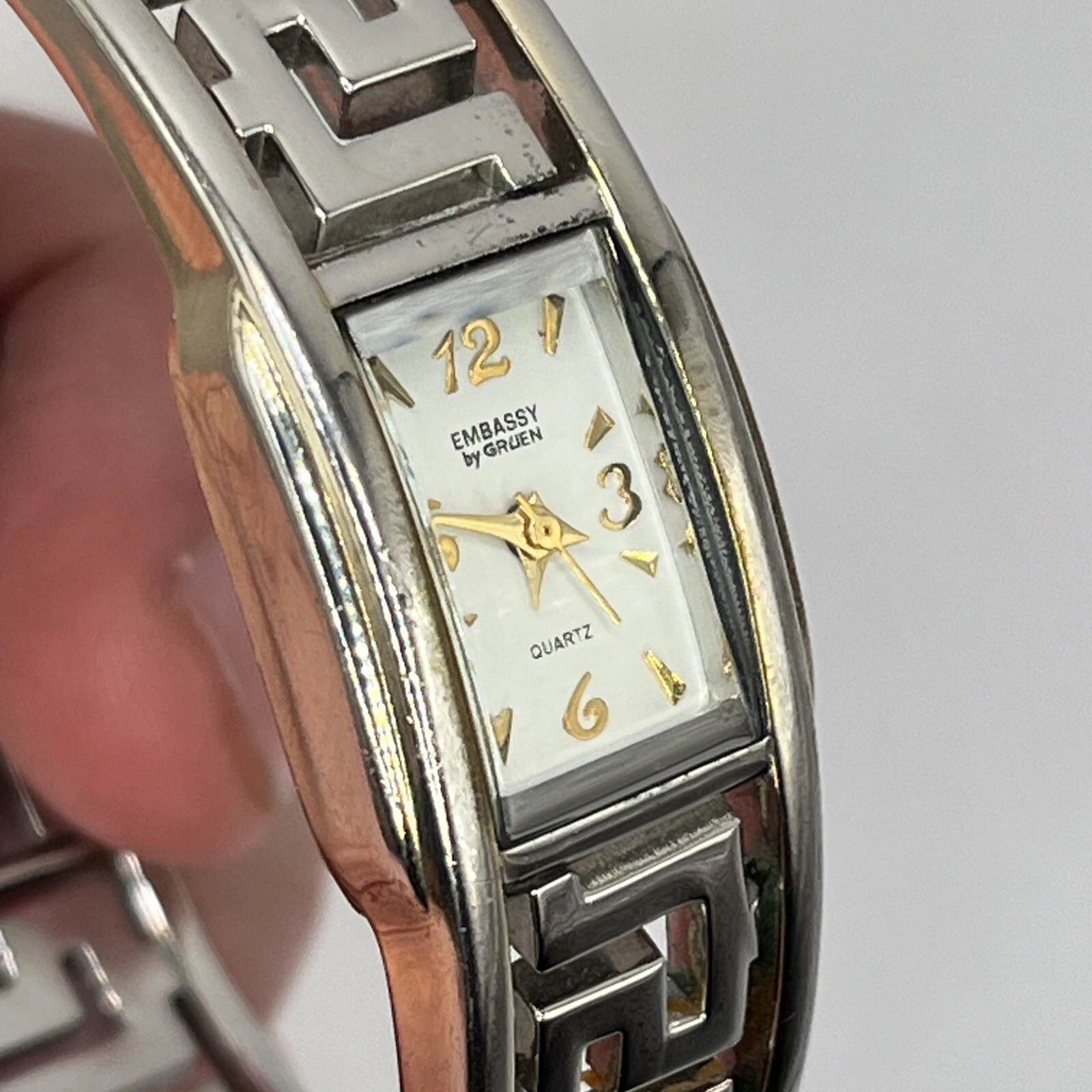 Embassy By Gruen Women's Watch Cuff Band Silver Tone Dial NEW BATTERY RUNS!
