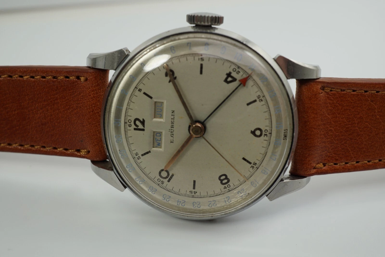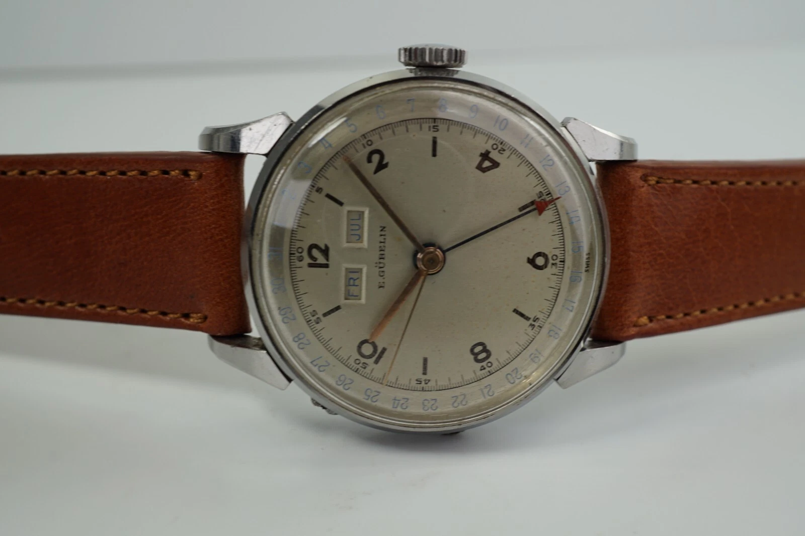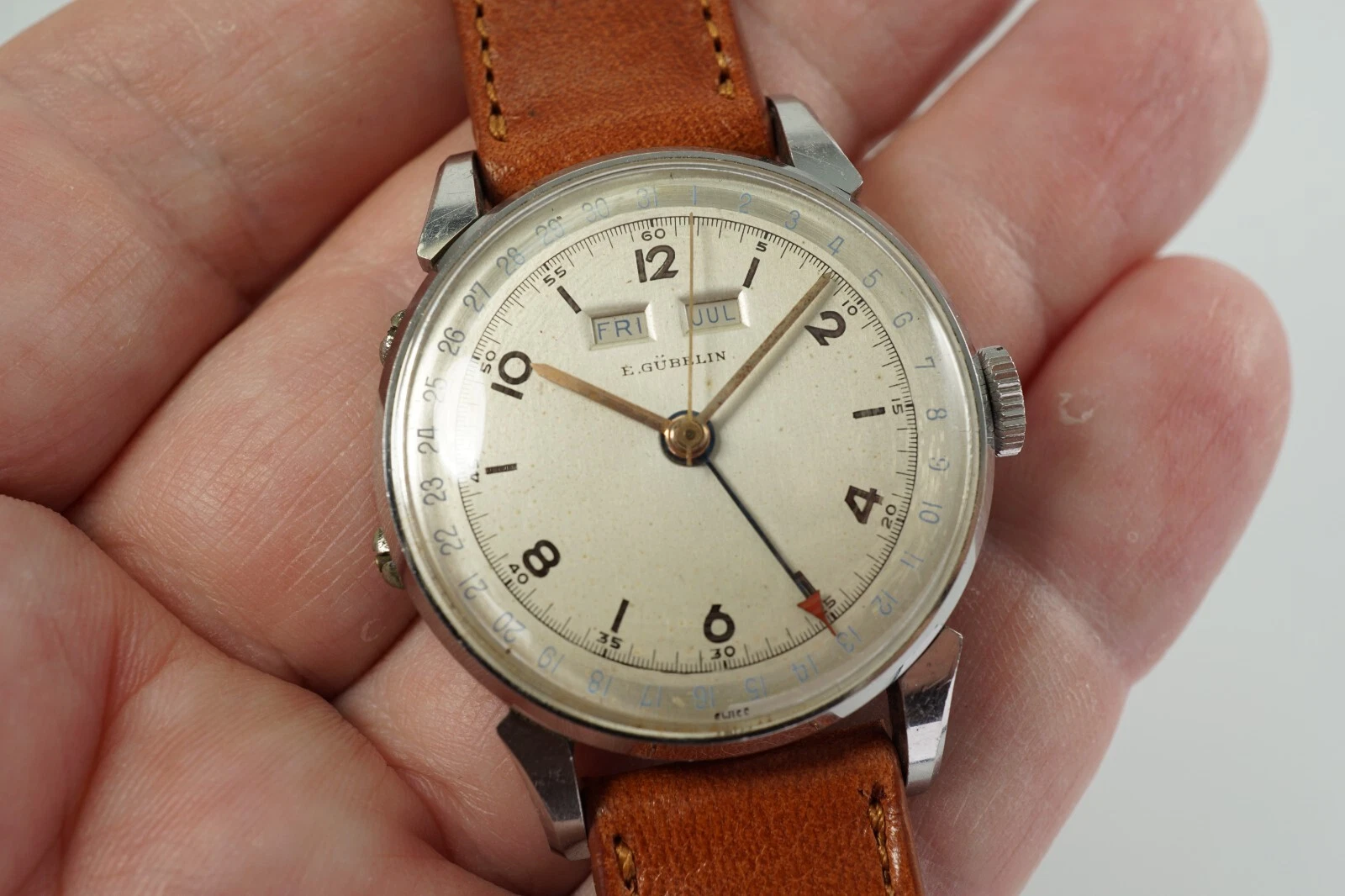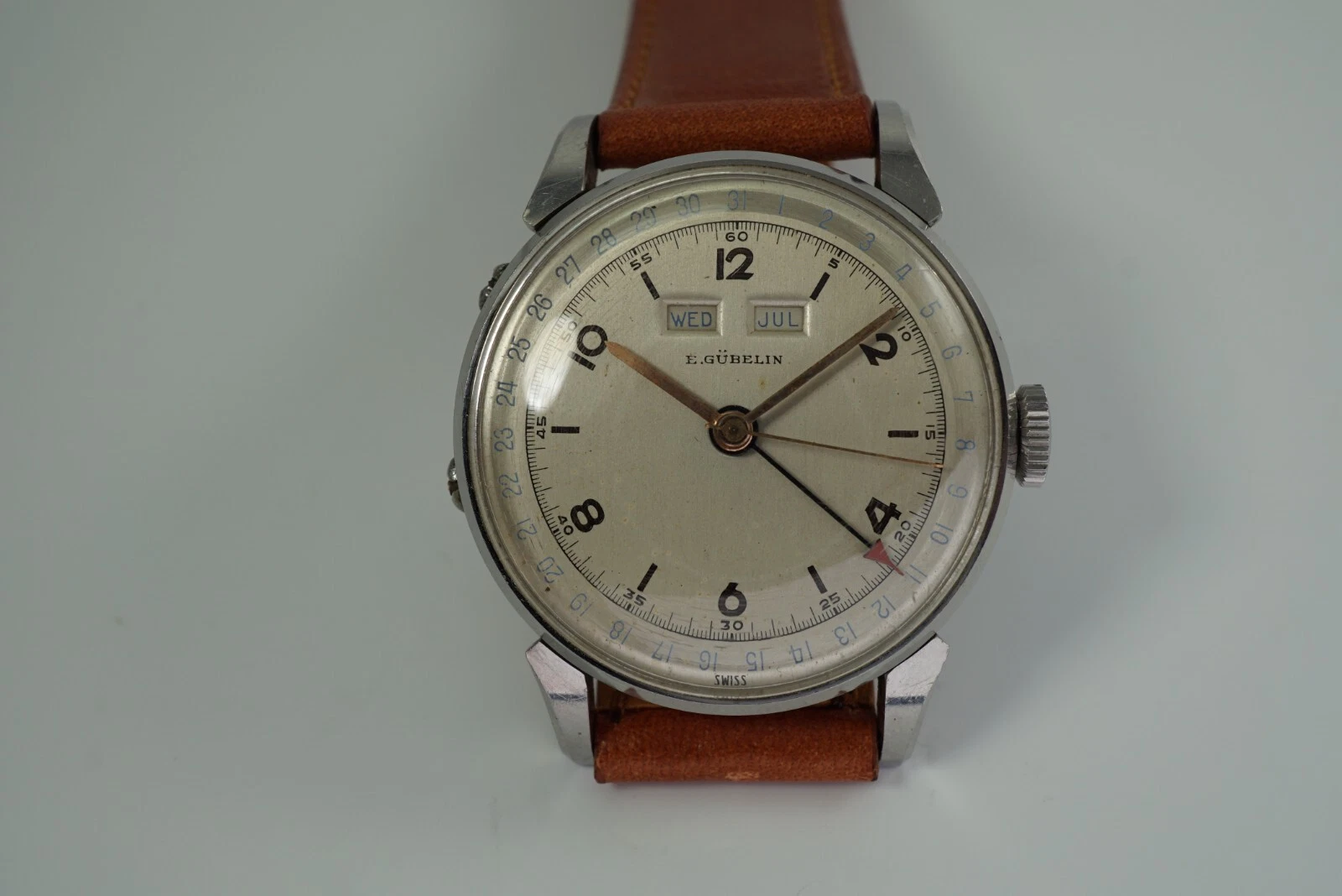 E.GUBELIN TRIPLE DATE CALENDAR WATCH ORIGINAL DIAL GORGEOUS STEEL CASE 1940's