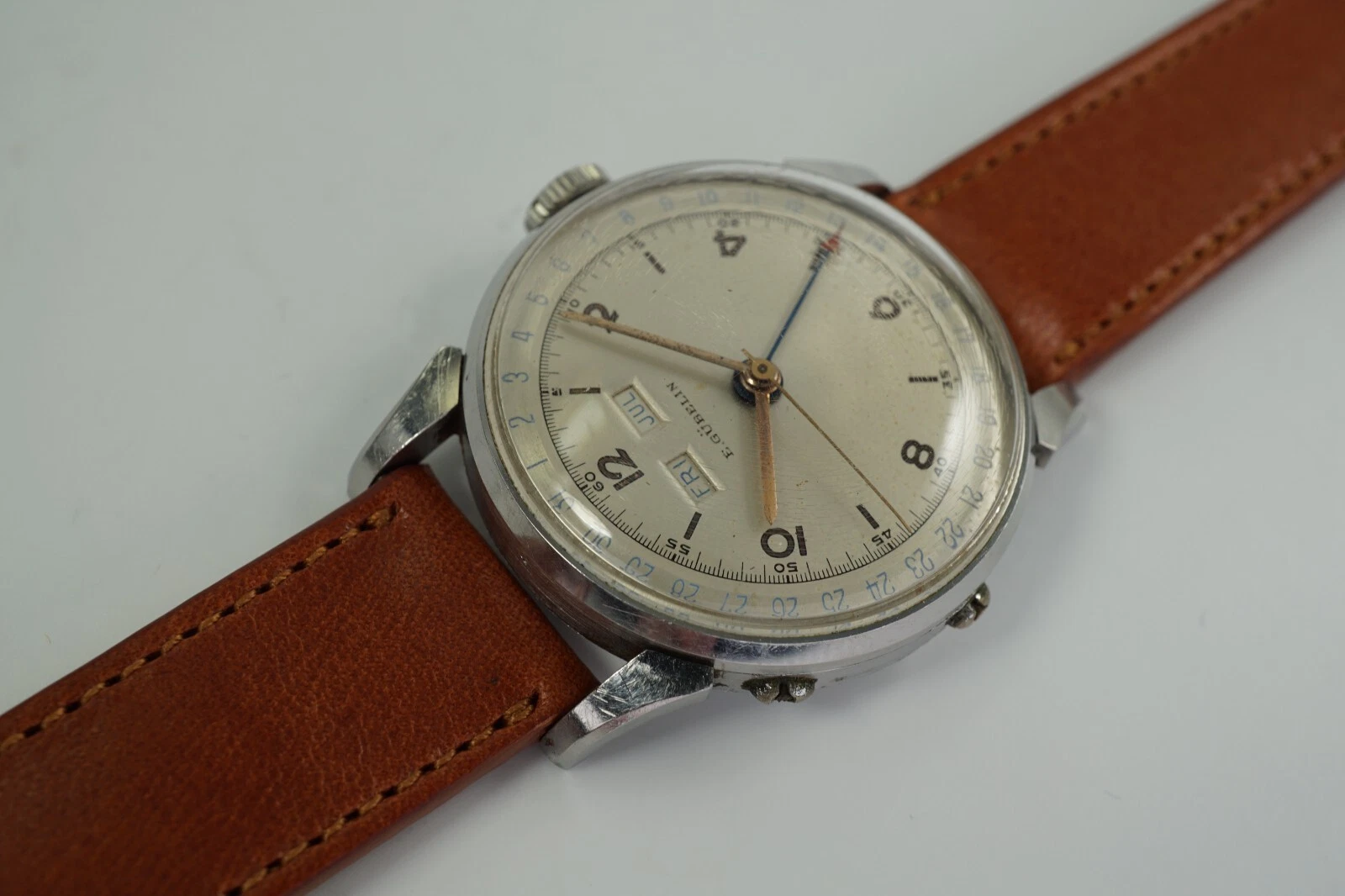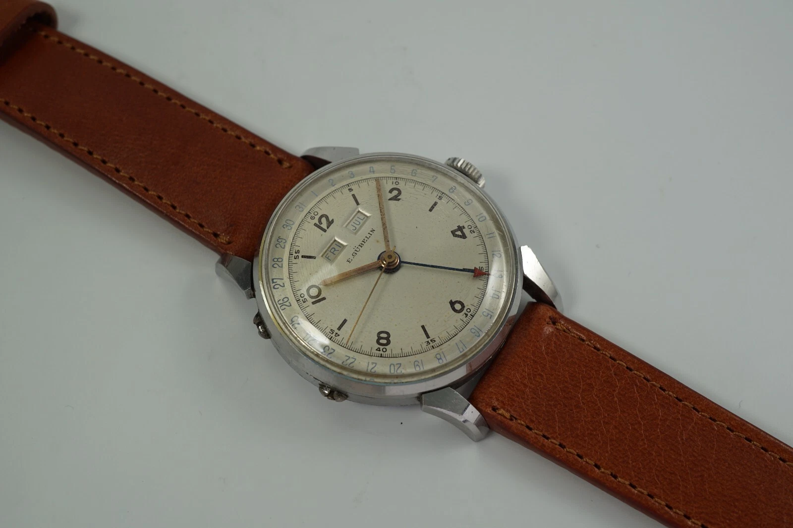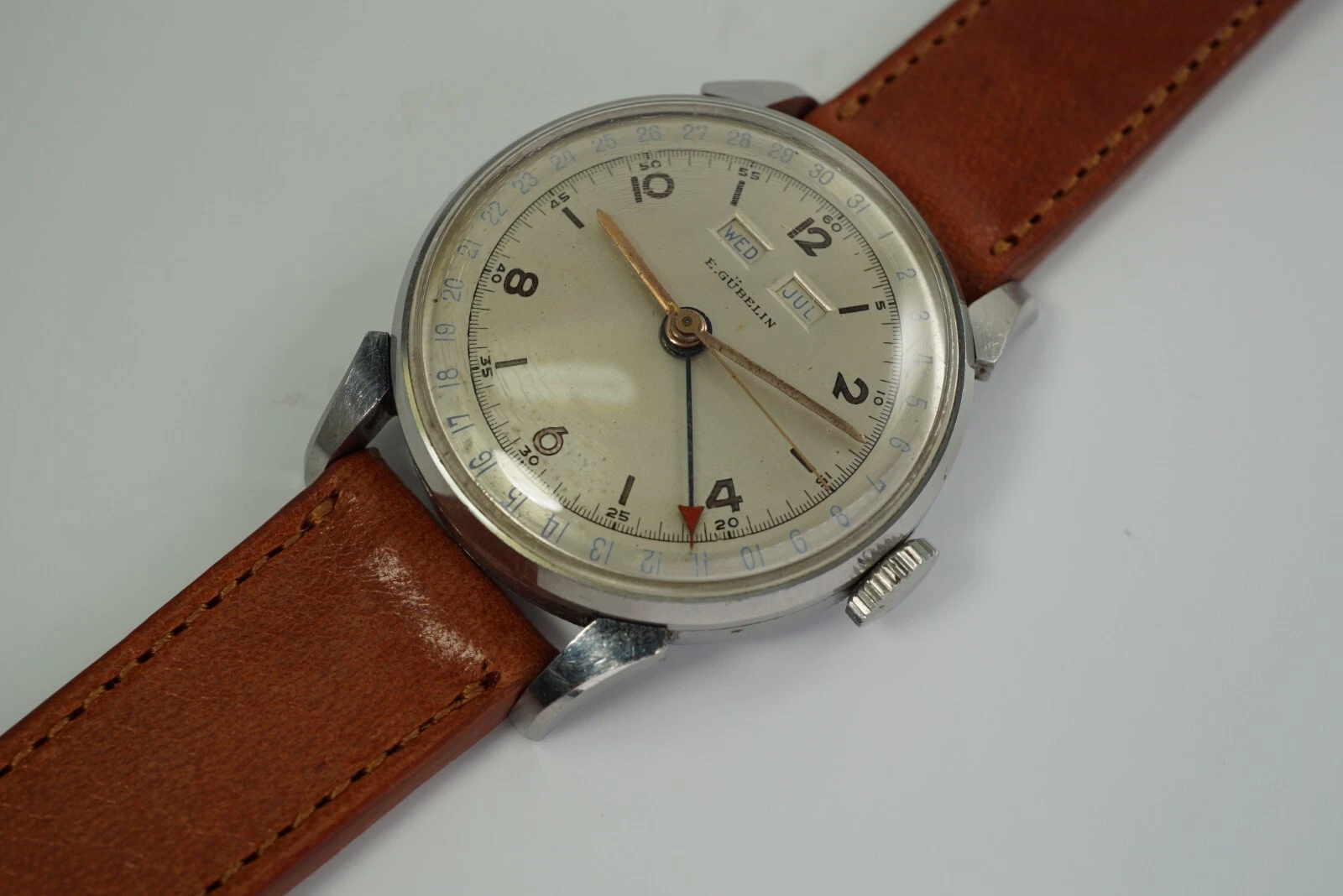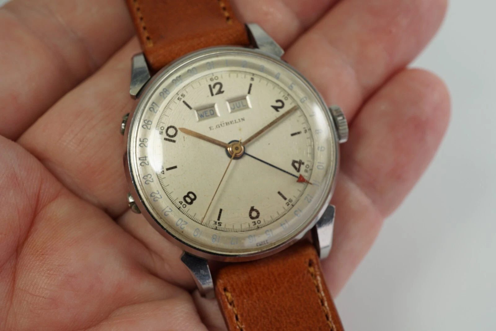 E.GUBELIN TRIPLE DATE CALENDAR WATCH ORIGINAL DIAL GORGEOUS STEEL CASE 1940's