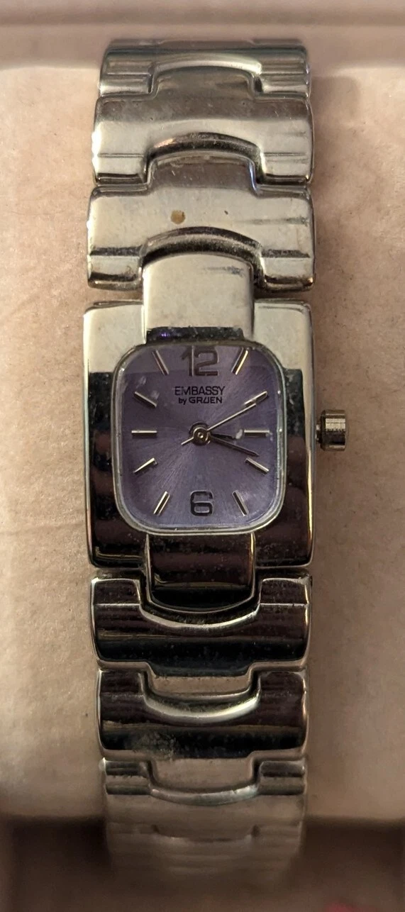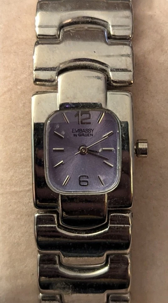 Working Ladies EMBASSY By Gruen Silver Tone & Purple Face Tank Watch