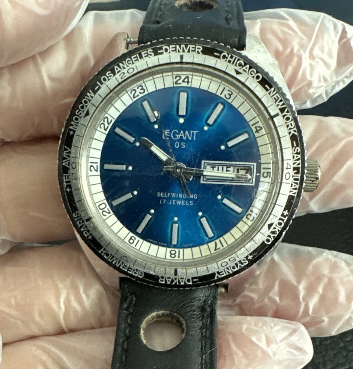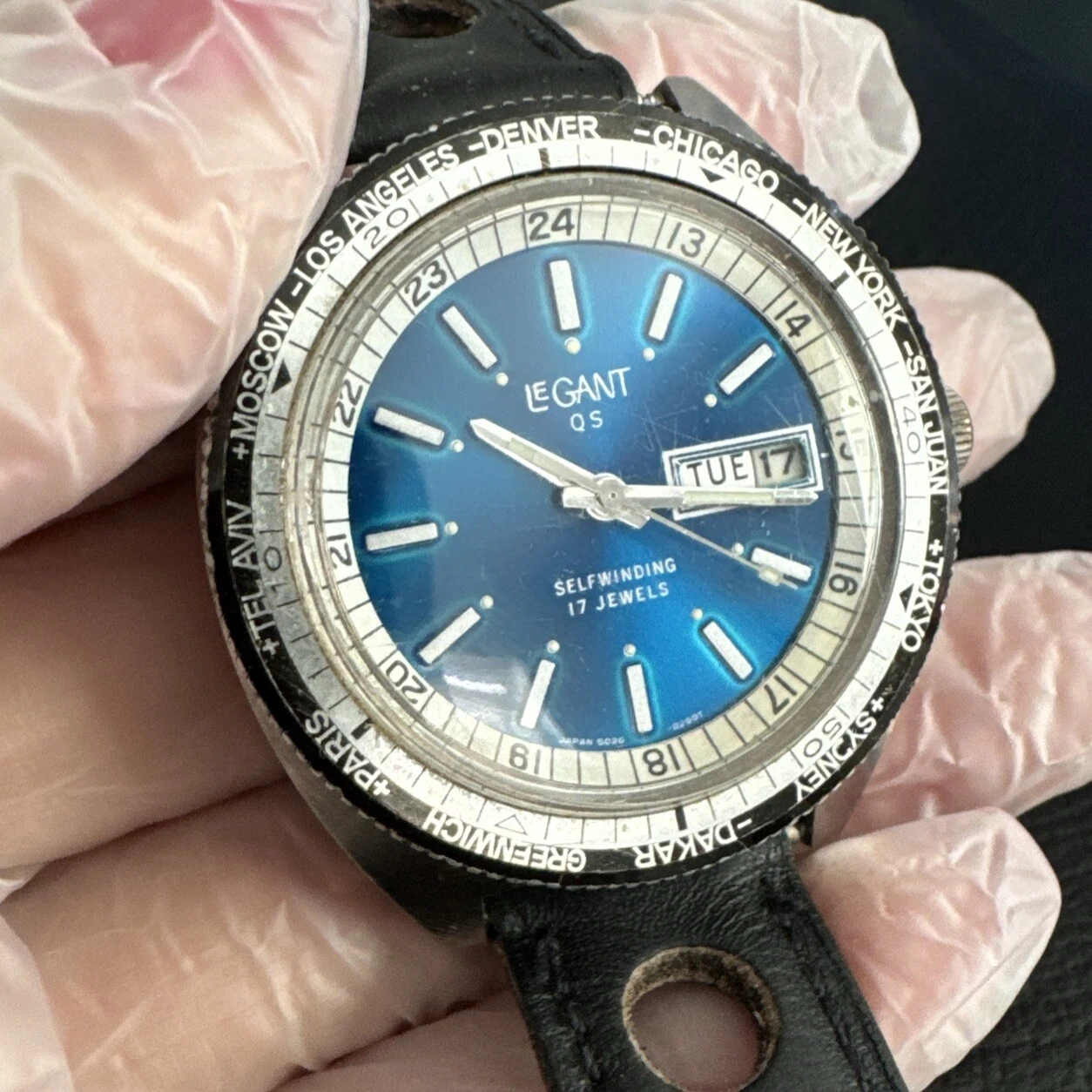 Vintage LeGant QS World Time Blue Self Winding Mens Diver Watch Works