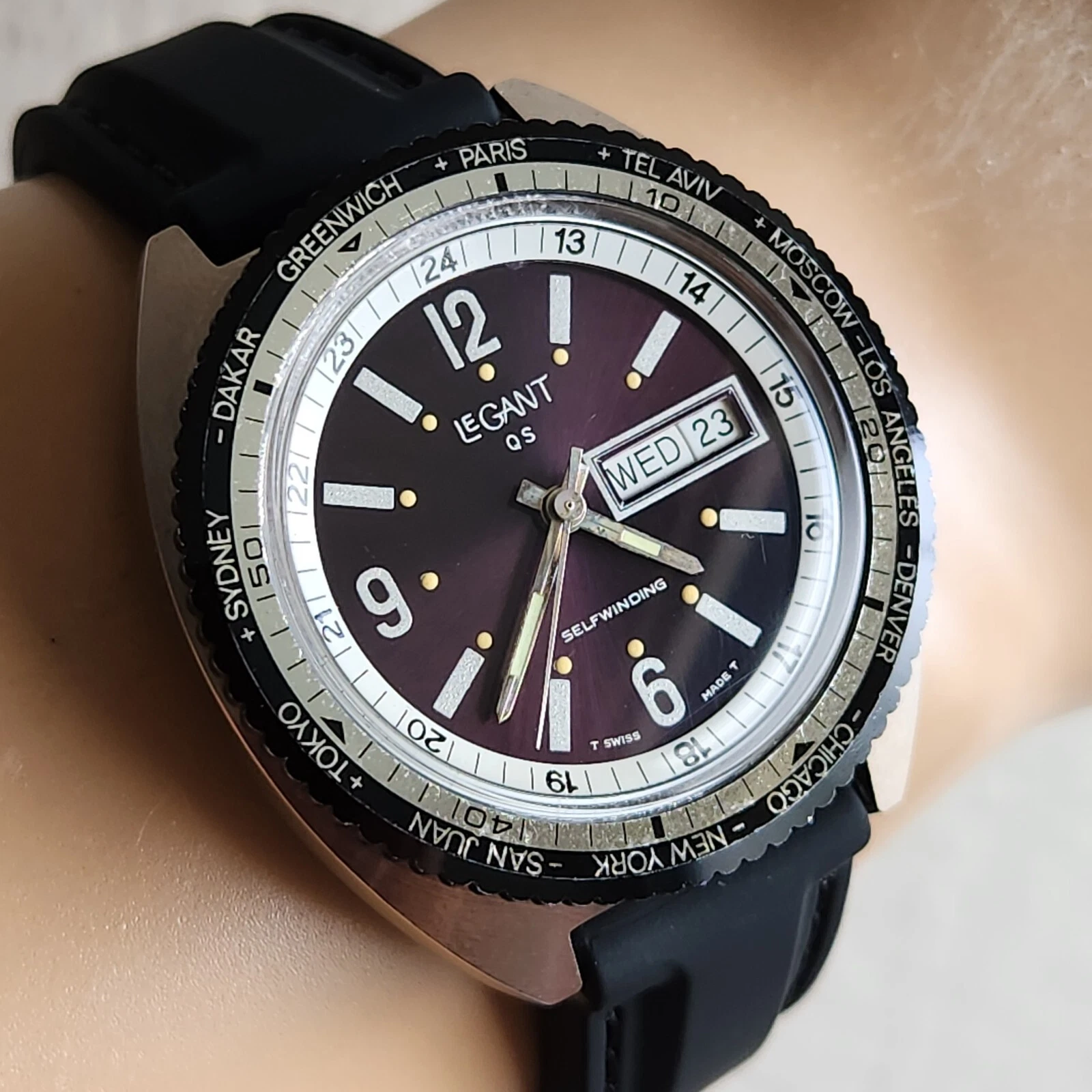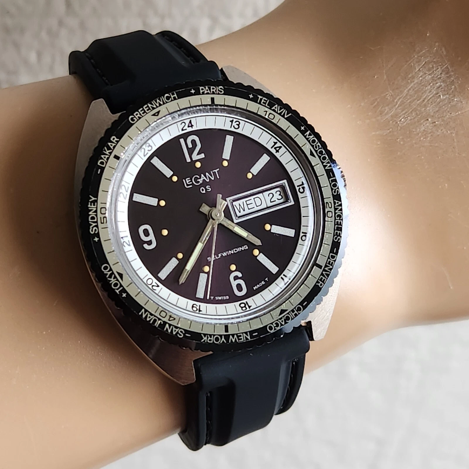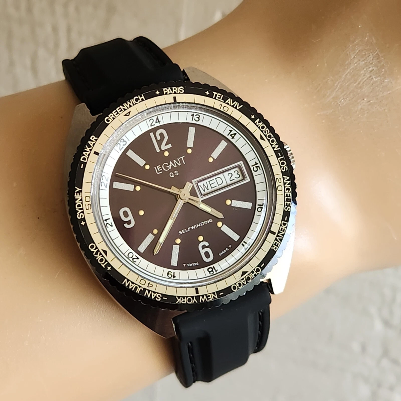 Vintage LeGANT GMT men's automatic watch WORLD TIME Ronda 239 swiss made 1970s