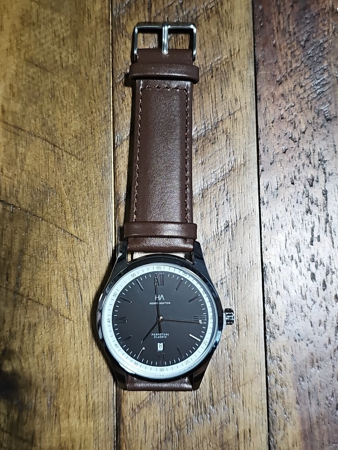 Henry Ashton Perpetual Classic Mens Watch 42MM Black Dial Brown Band With Date